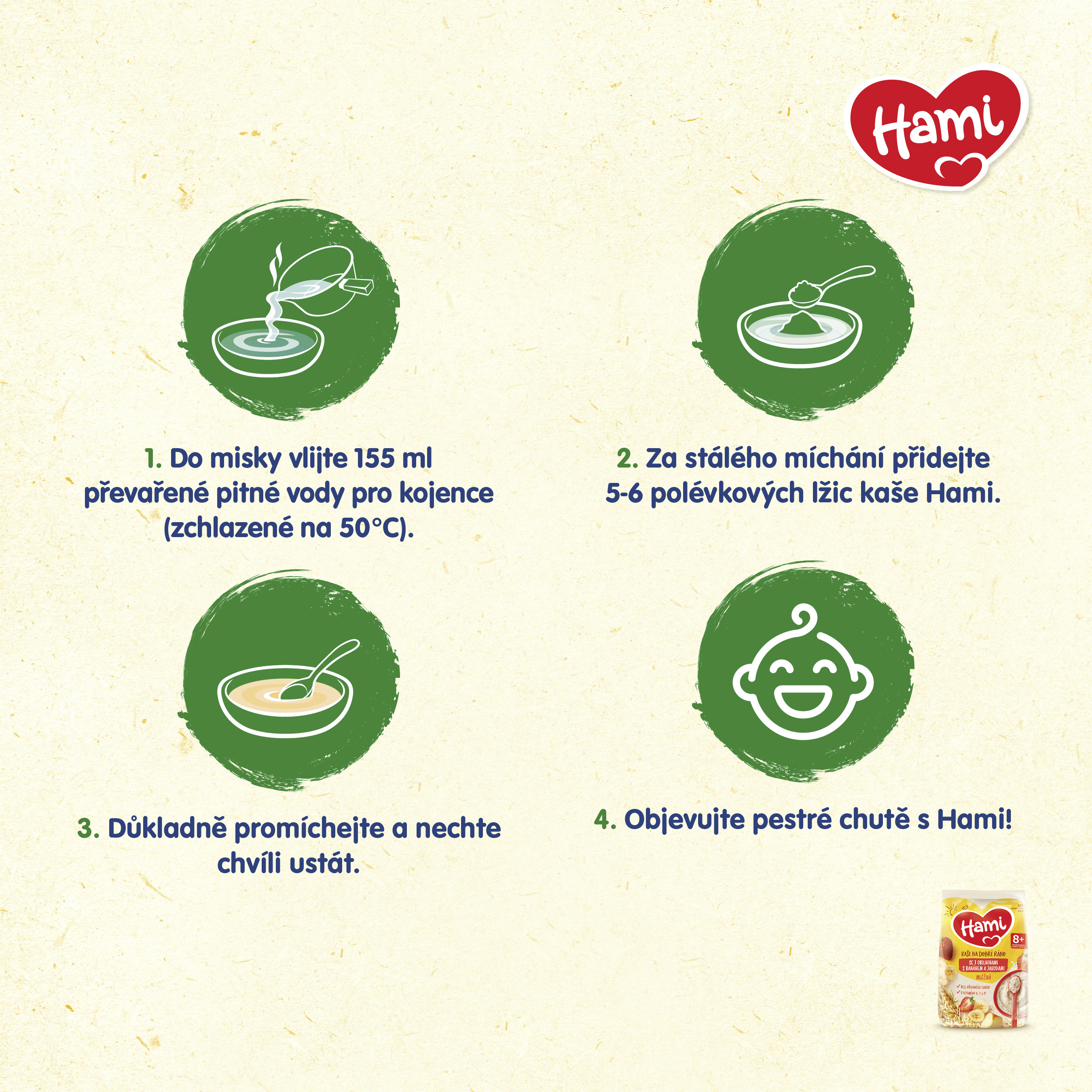 Hami kaše jsou vyrobeny z pečlivě kontrolovaných obilovin, které jsou přirozeným zdrojem energie. Také obsahují potřebné vitamíny a minerální látky. Navíc Hami kaše skvěle chutnají a dobře se rozpouští! Hami mléčné kaše se dále skládají z pečlivě vybraného mléka a ovoce, které se sbírá v optimální době zralosti, usuší a zpracuje do vloček nebo ovocného prášku, který se následně smíchá s kašičkou, aby byla plná pestrých chutí a vůní.