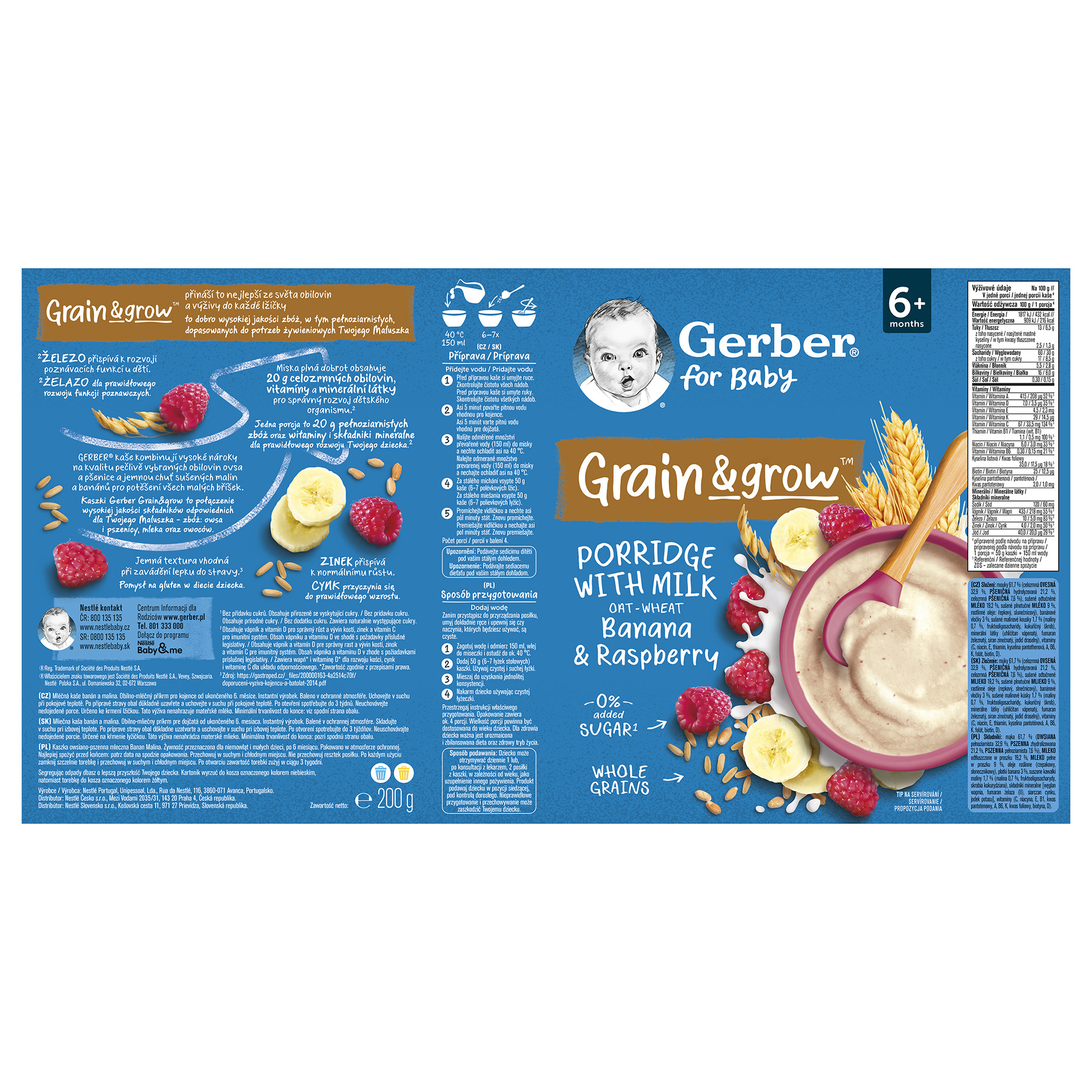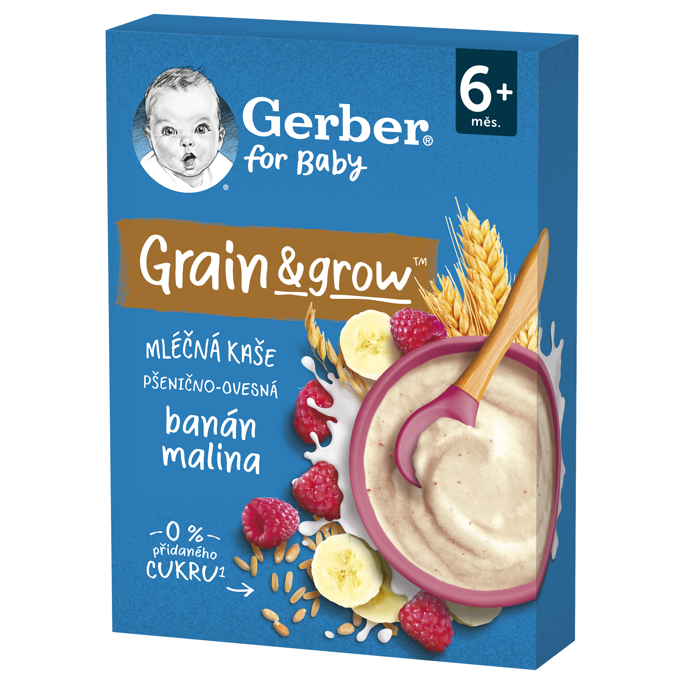 GERBER mléčná kaše pšenično-ovesná banán a malina 200 g. Obilno-mléčný příkrm pro kojence od ukončeného 6. měsíce. Instantní výrobek. Kašička je vyrobena z pečlivě vybraných celozrnných obilovin, pšenice a ovsa. Při výrobě jsme navíc nepřidali žádný cukr* ani aromata. Kaše je určena pro kojence od ukončeného 6. měsíce. Díky sušeným malinovým kouskům a banánovým vločkám má mléčná kaše jemnou, lehce nasládlou chuť a potěší tak jazýček každého malého mlsouna. Kaše je pro miminko ideální dobrotou pro usnadnění přechodu na pevnou stravu. Je pomocníkem pro rozvoj žvýkacích a polykacích dovedností a připravuje malé strávníky na širší škálu potravin. Instantní kaše jsou navíc snadné na přípravu, není třeba přidat nic víc než vodu.