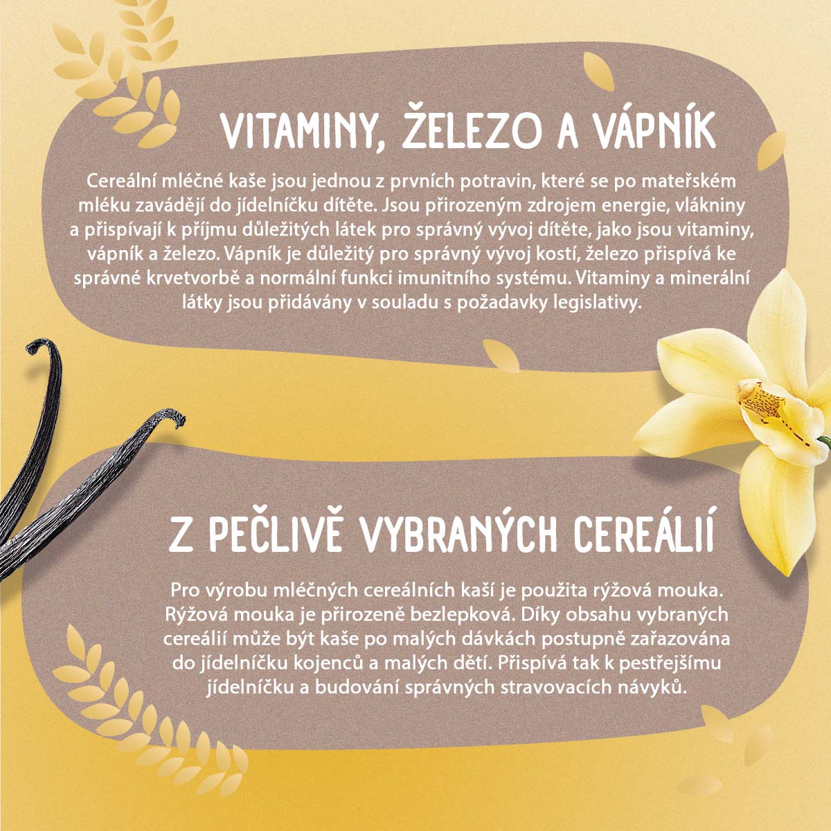 Cereální mléčné kaše jsou jednou z prvních potravin, které se po mateřském mléku zavádějí do jídelníčku dítěte. Jsou přirozeným zdrojem energie, a přispívají k příjmu důležitých látek pro správný vývoj dítěte, jako jsou vitaminy, vápník a železo. Vápník je důležitý pro správný vývoj kostí, železo přispívá ke správné krvetvorbě a normální funkci imunitního systému. Vitaminy a minerální látky jsou přidávány v souladu s požadavky legislativy.