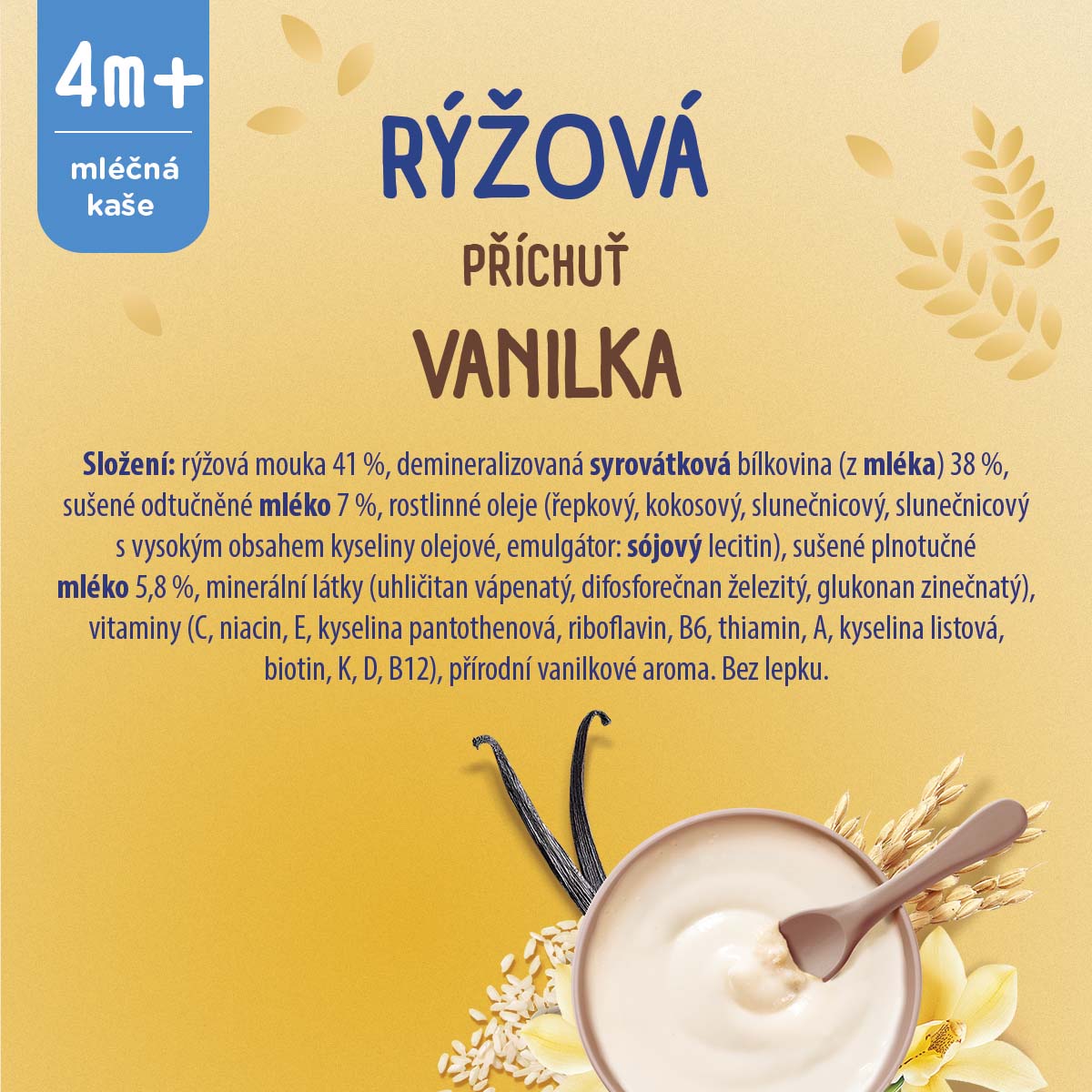 Rýžová mouka 41 %, Demineralizovaná syrovátková bílkovina (z mléka) 38 %, Sušené odtučněné mléko 7 %, Rostlinné oleje (řepkový, kokosový, slunečnicový, slunečnicový s vysokým obsahem kyseliny olejové, emulgátor: sójový lecitin), Sušené plnotučné mléko 5,8 %, Minerální látky (uhličitan vápenatý, difosforečnan železitý, glukonan zinečnatý), Vitaminy (C, niacin, E, kyselina pantothenová, riboflavin, B6, thiamin, A, kyselina listová, biotin, K, D, B12), Přírodní vanilkové aroma