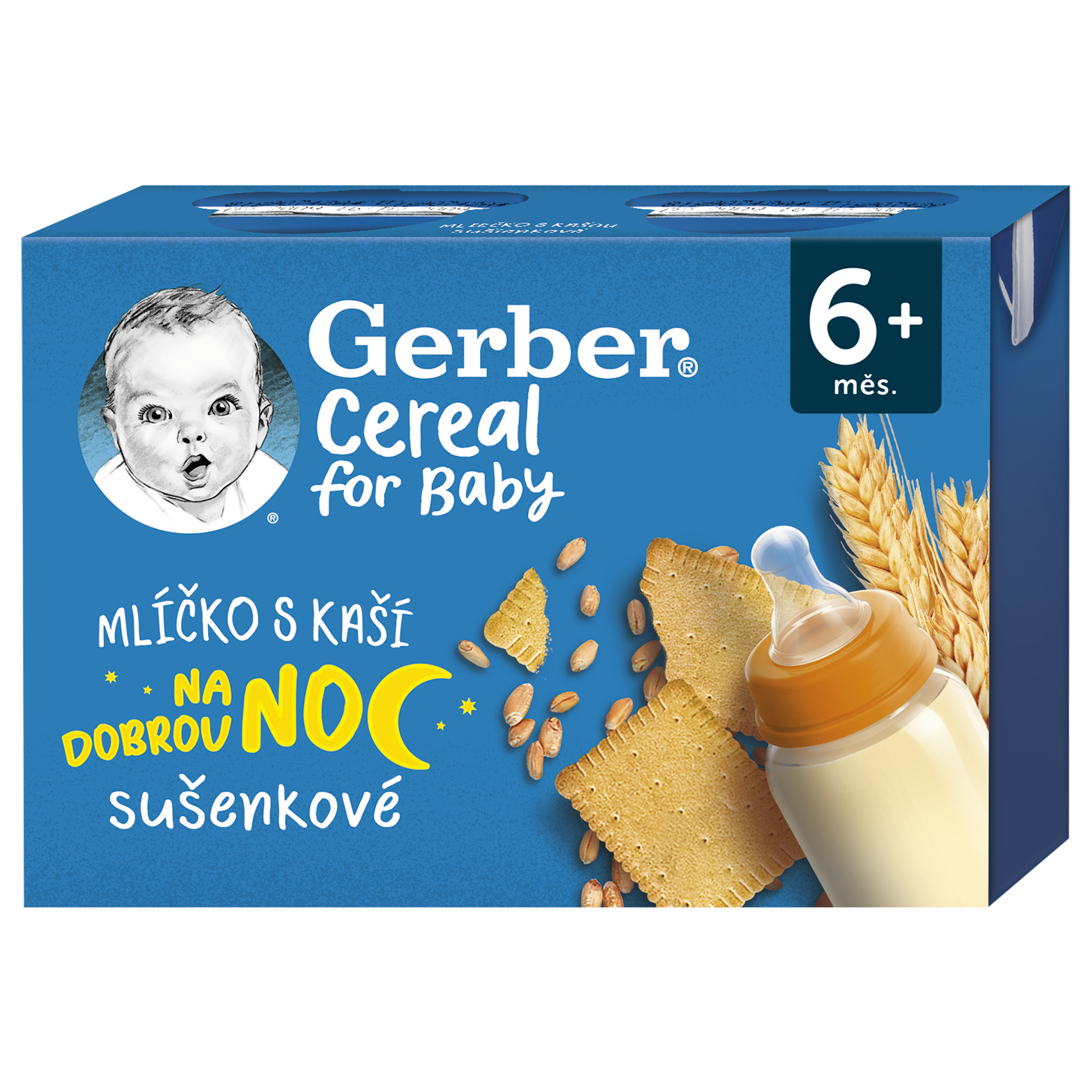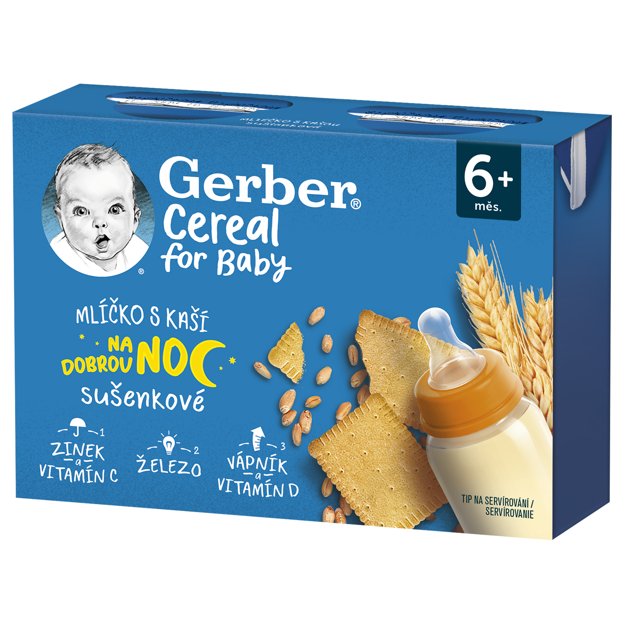 Hotový mléčno-obilný příkrm s drcenými sušenkami pro kojence od ukončeného 6. měsíce. GERBER Cereal mlíčko s kaší sušenkové je hotový příkrm, který uspokojí i ta nejnáročnější bříška našich nejmenších. Lahodná mléčno-obilná dobrota je vyrobena z kvalitního mléka a zahuštěna kaší s drcenými sušenkami. Mlíčko je vhodné pro kojence od ukončeného 6. měsíce. Mlíčko s kaší obsahuje řadu minerálních látek a také 13 vitamínů, které napomáhají zdravému růstu a vývoji dítěte. Vápník* a vitamín D* jsou potřebné pro normální růst a vývin kostí u dětí, železo přispívá k rozvoji poznávacích funkcí dětí a zinek s vitamínem C přispívají k normální funkci imunitního systému dítěte. Mlíčko s kaší navíc neobsahuje konzervanty* a palmový olej. Mlíčko s kaší chutná skvěle studené i teplé, což z něj činí praktickou volbu na každý den. Je ihned připraveno k použití - stačí odstřihnout roh a nalít do lahvičky, případně jej můžete ohřát ve vodní lázni (ne v mikrovlnce), a můžete podávat. Jedno balení mléčno-obilných příkrmů GERBER Cereal obsahuje dvě porce po 200 ml, které vystačí na dvě denní jídla malého mlsouna. *Ve shodě s požadavky příslušné legislativy.
