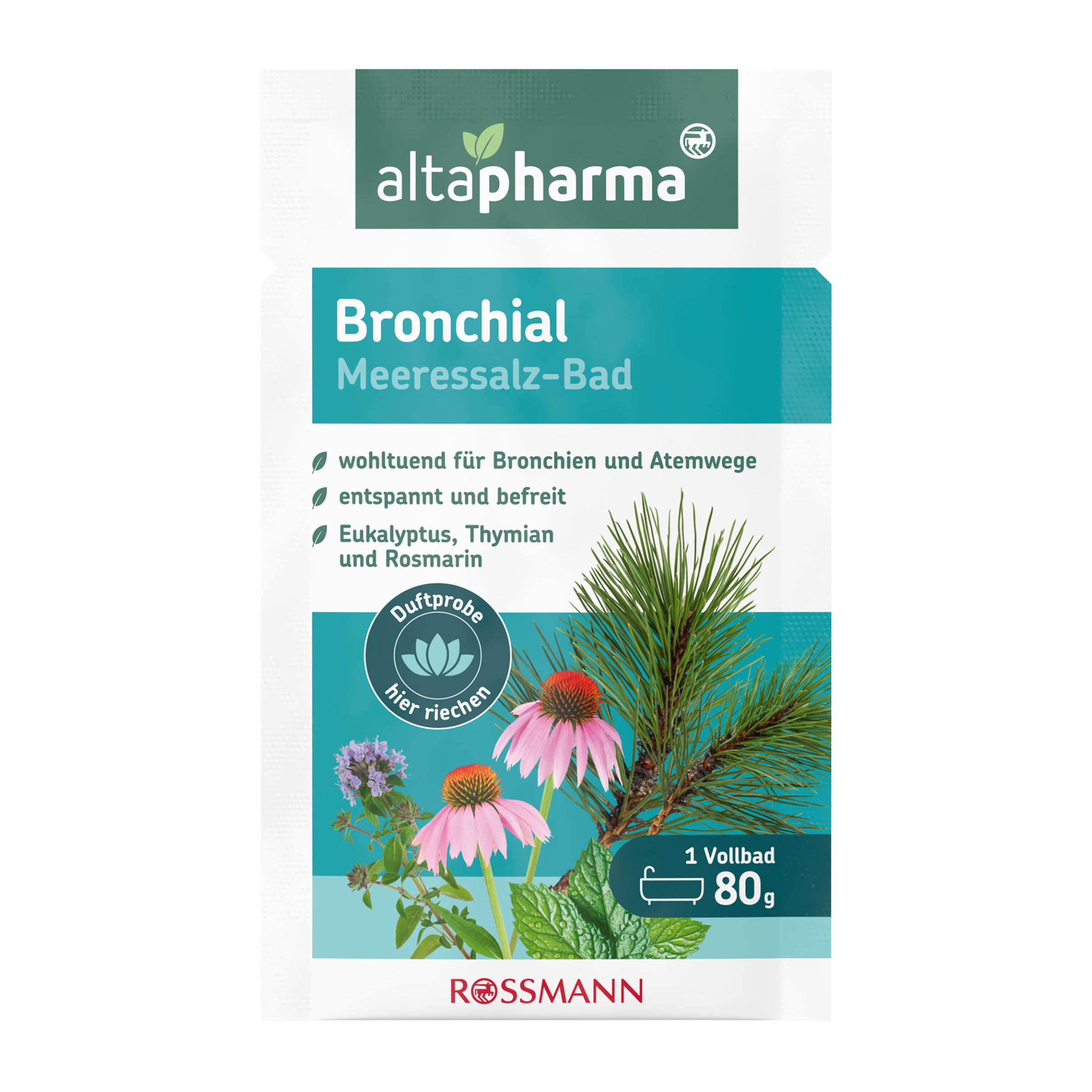 Altapharma Bronchiální koupel s mořskou solí je přísada do koupele, která podporuje pohodu v případech zátěže dýchacích cest, jako je podrážděný kašel nebo v období nachlazení.