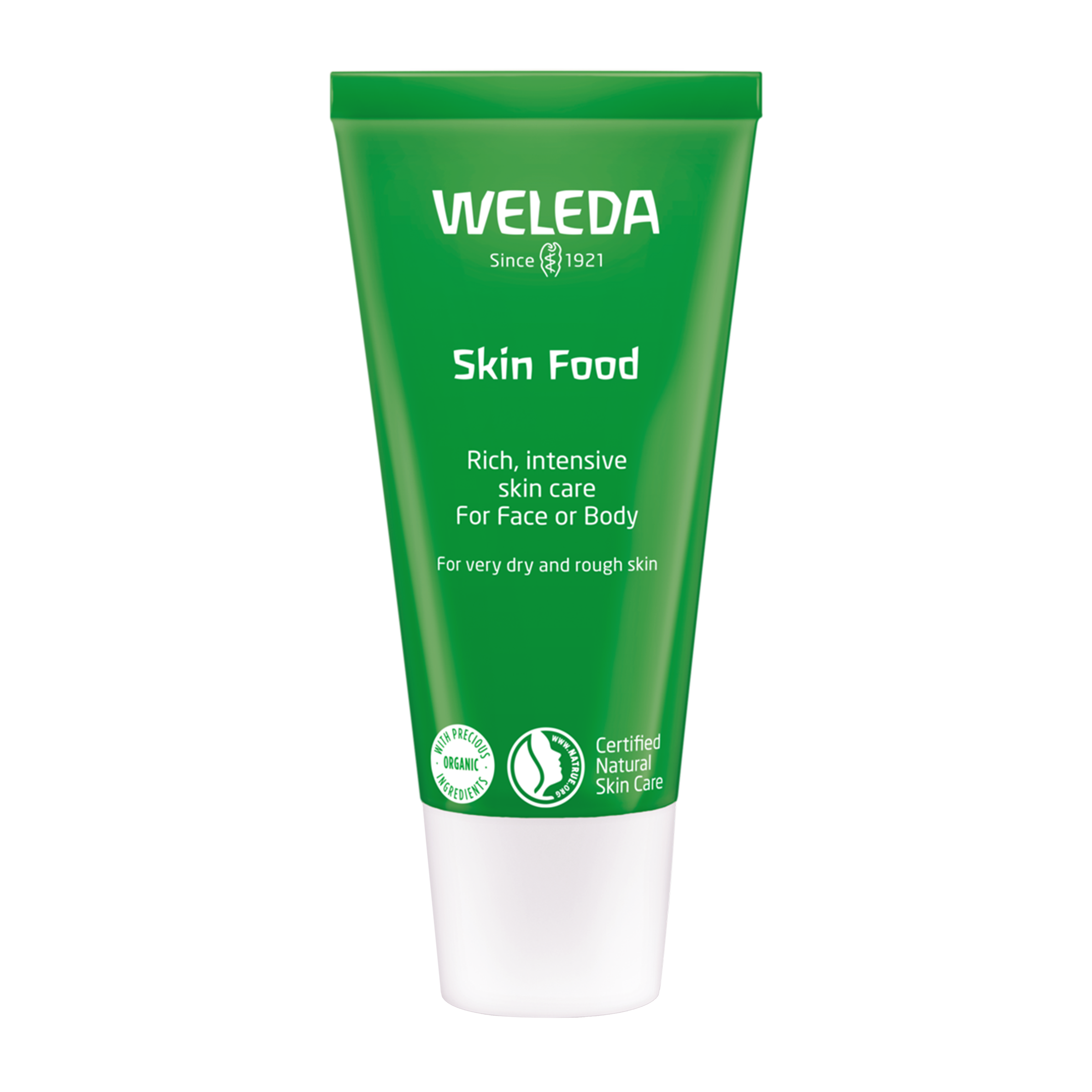 Již více než 100 let věří naši zákazníci tomuto tradičnímu produktu Weledy. Krém výborně chrání nejenom suchou a hrubou pokožku, jeho účinky ocení všechny typy pleti v každém věku. Účinná kompozice s výtažky z violky trojbarevné a heřmánkových a měsíčkových květů má zklidňující účinky a pokožku zjemňuje. Skin Food má mnohostranné využití a je vhodný jako denní i noční krém, výživná maska, péče o suché lokty a kolena nebo krém na ruce. Výrazně zlepšuje hydrataci pokožky, její pevnost, hladkost a regeneraci kožních buněk. Krém je vhodný pro děti od 3 let.