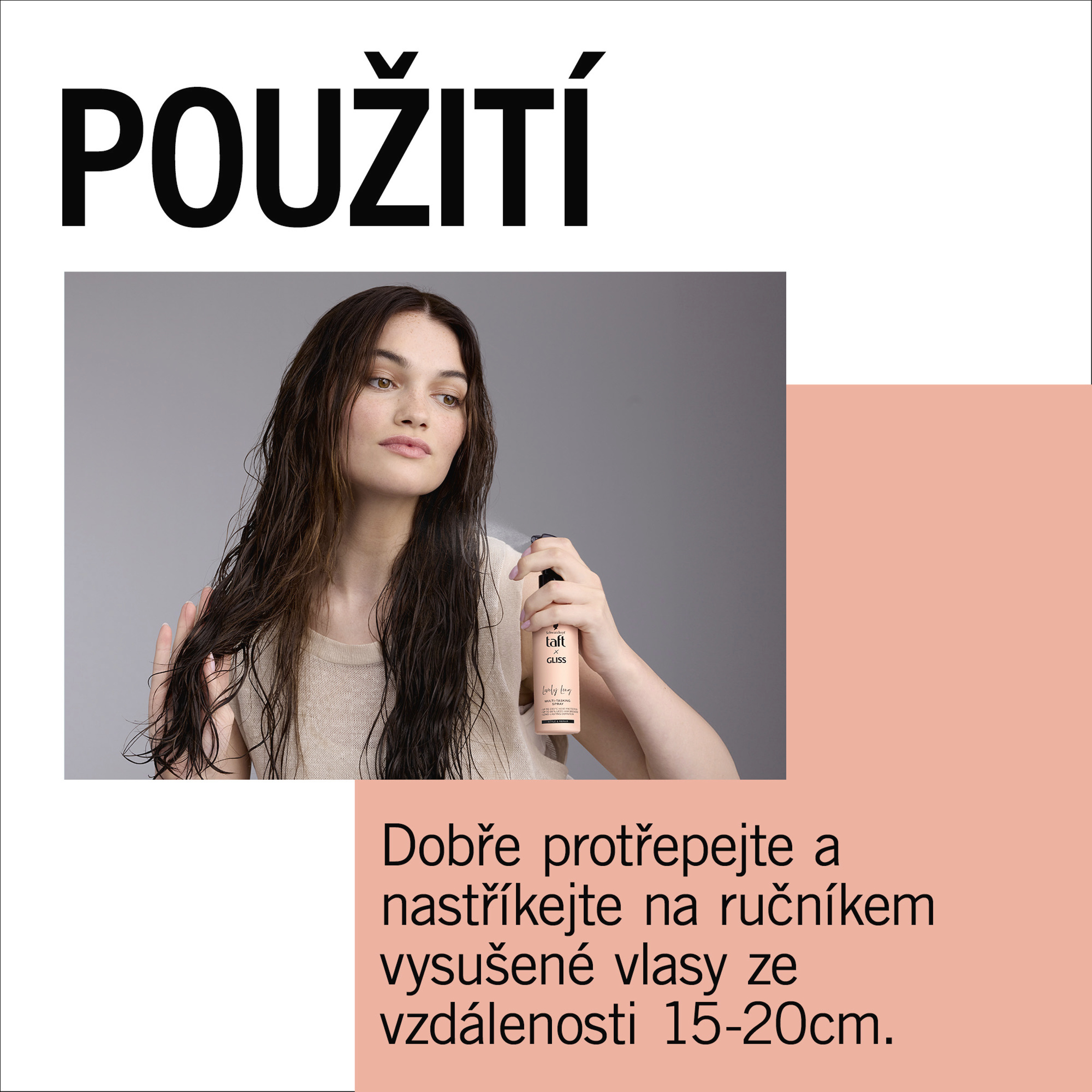 Důkladně protřepejte! Nastříkejte ze vzdálenosti 15 - 20 cm na ručníkem vysušené vlasy před fénováním. Nestříkejte do očí! Otřete případné zbytky z podlahy. Neoplachujte.