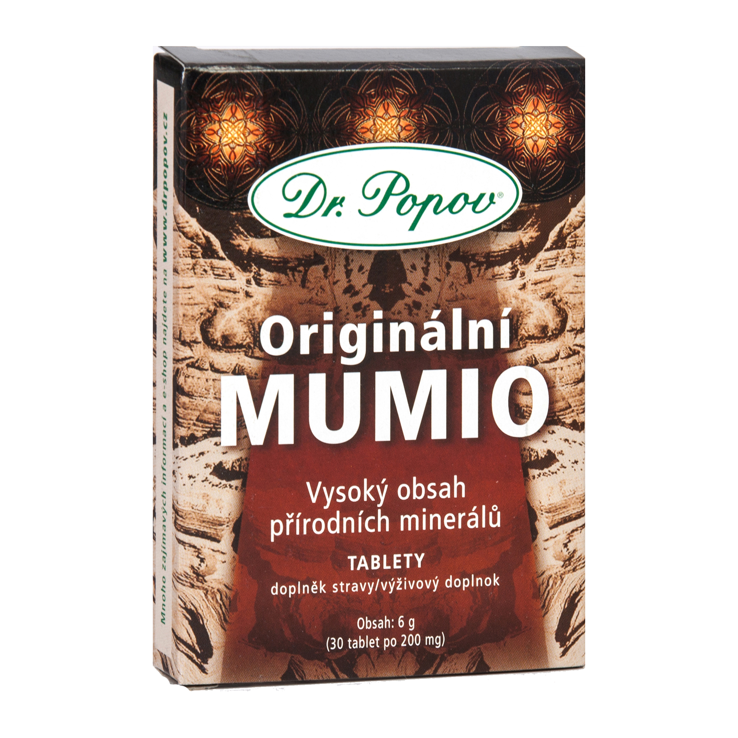 Originální Mumio Dr. Popova je přírodní multiminerál, který obsahuje 10 zásadních minerálů (např. vápník, draslík, hořčík), 26 stopových prvků (rubidium, cesium aj.) a další důležité aminokyseliny. Všechny účinné látky jsou ve velmi dobře vstřebatelné formě. Mumio podporuje přirozenou obranyschopnost a je vhodné ho užívat zejména na podzim či jaře (v období snížené imunity). Patří mezi nejznámější adaptogeny – látky rostlinného původu, které pomáhají tělu lépe reagovat na stres a přispívají duševní vyrovnanosti. Mumio se podílí na zdravém stavu kloubů a kostí a udržuje správnou hladinu cukrů a tuků.