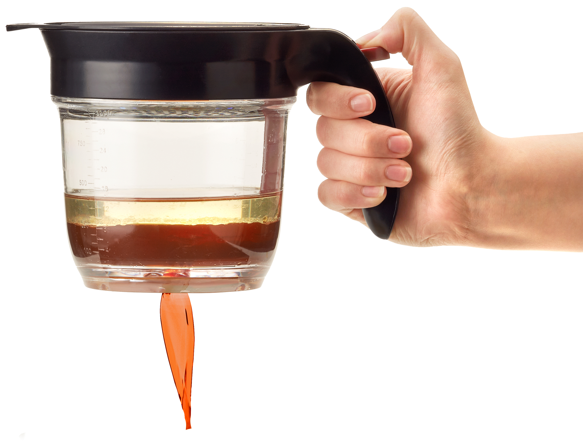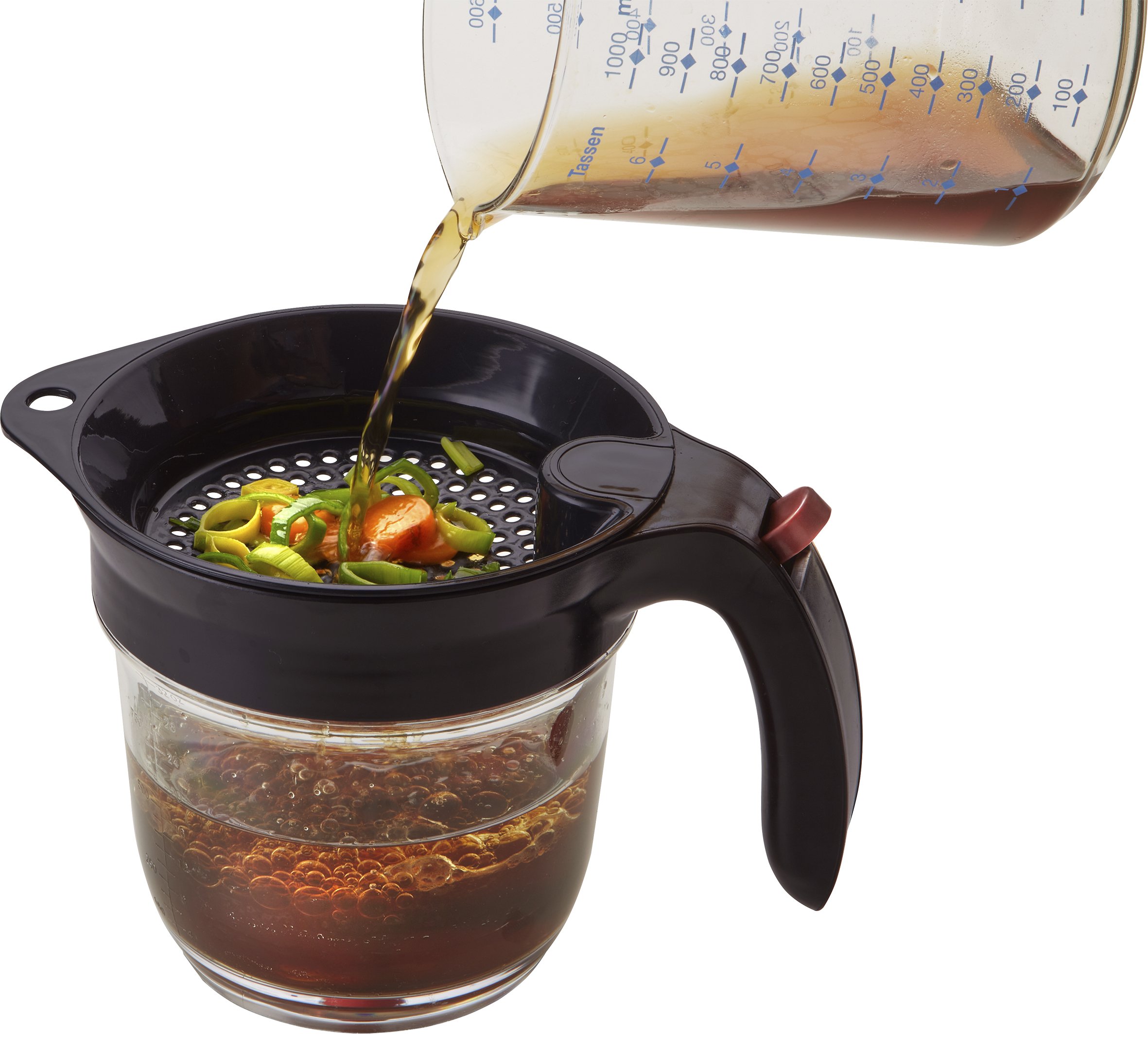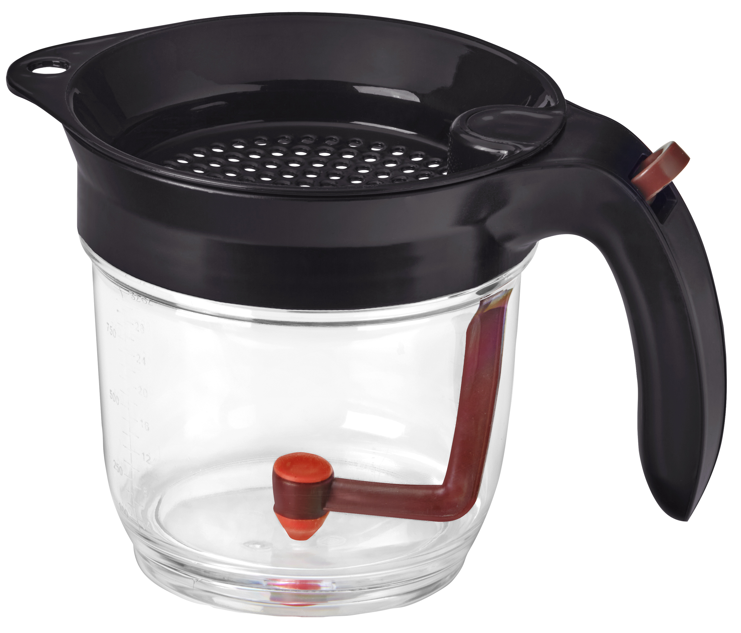 Snadno oddělte tuk z domácích polévek, omáček a vývarů s touto praktickou nádobou. Má objem cca 1 000 ml a je vybavena praktickým sítkem pro rychlé a jednoduché oddělení tuku.