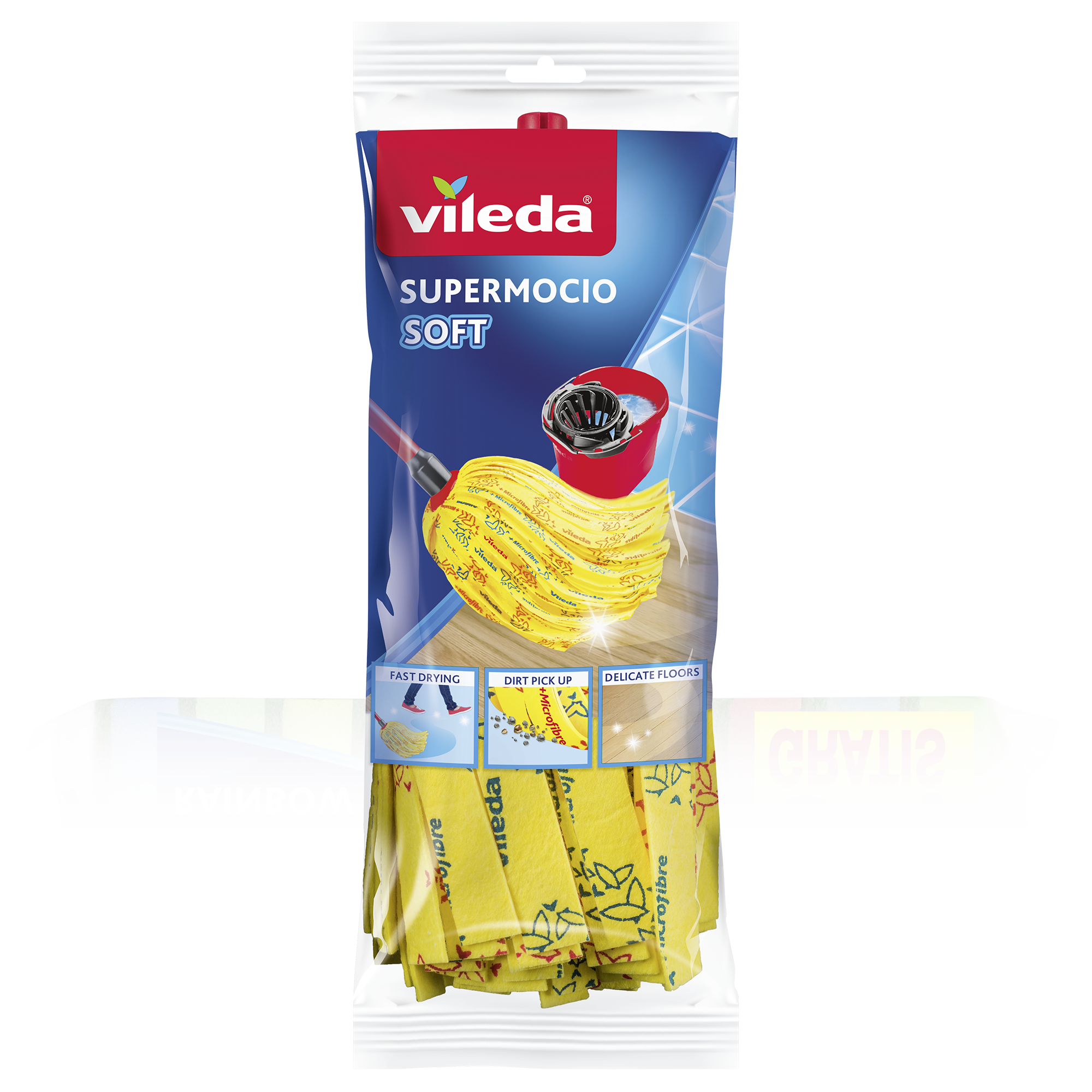 Vhodný pro všechny tyče Vileda SuperMocio. Před použitím na velmi jemném povrchu, vyzkoušejte na skrytých plochách. Nenechte hlavici mopu schnout přímo na podlaze nebo jiném povrchu, aby na místě kontaktu nedošlo ke vzniku skvrn. Nepoužívejte změkčovadla ani sušičku.