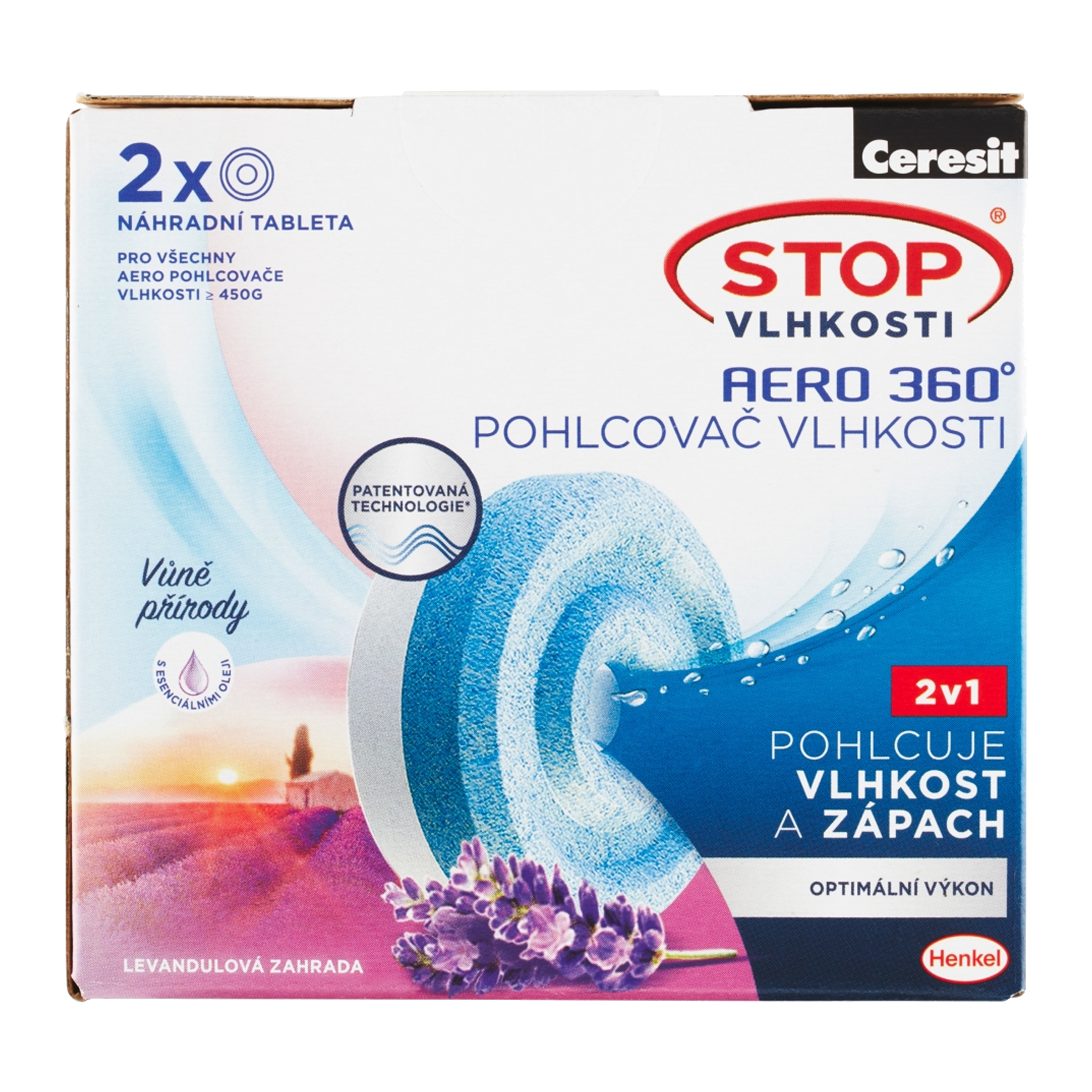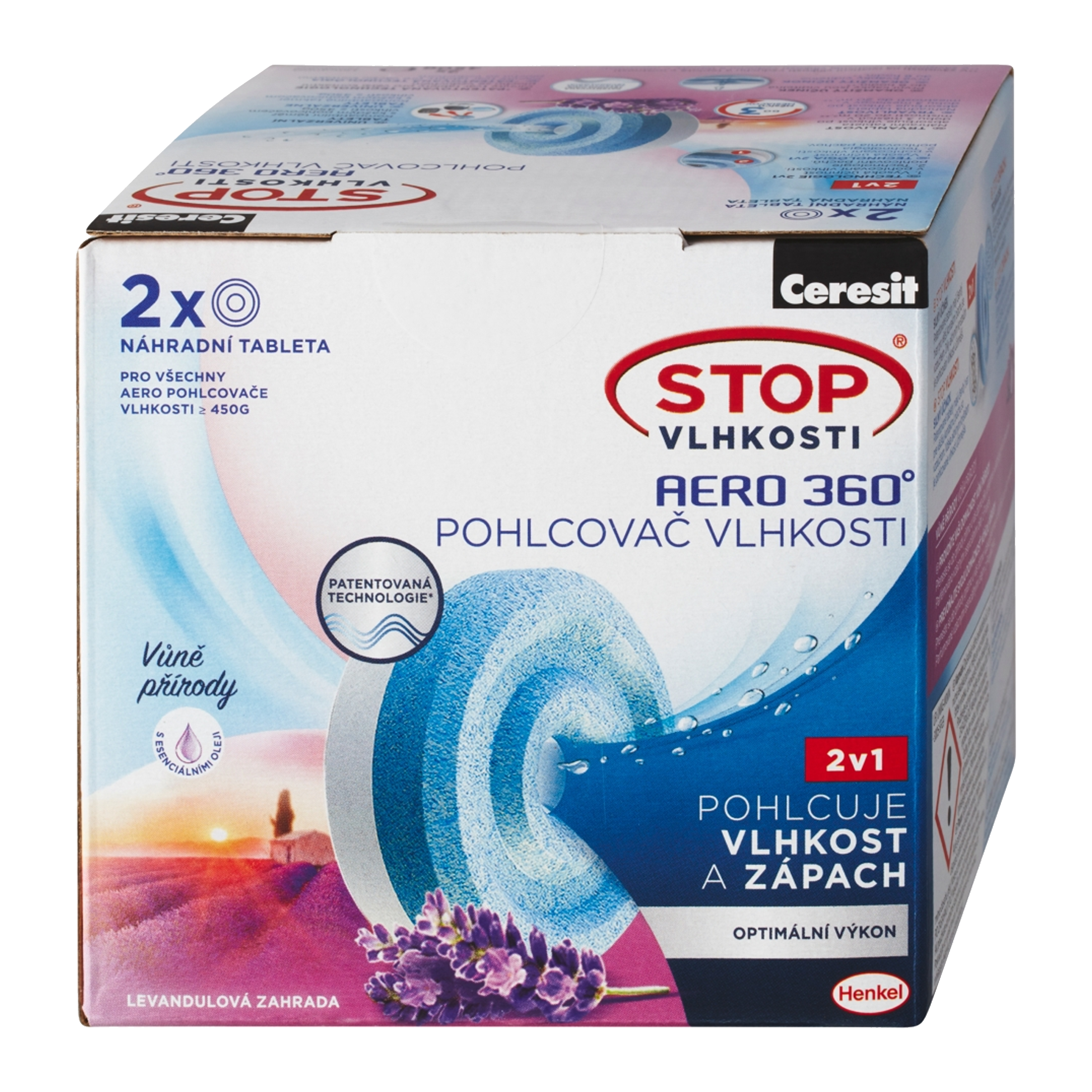- 2 výměnné tablety (2×450 g) pro pohlcovače vlhkosti Ceresit STOP VLHKOSTI Aero 360°