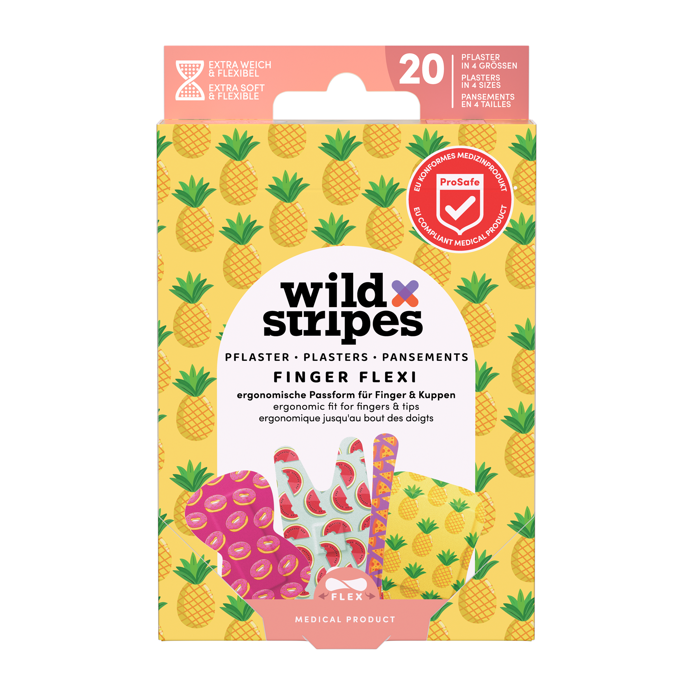 Náplasti z řady Finger Flexi jsou šetrné ke všem typům pokožky, jelikož jsou hypoalergenní a vyrobeny z tenké pružné extra flexibilní tkaniny, která se na povrchu chová jako druhá kůže. Náplasti jsou voděodolné a díky svým fixačním schopnostem se přilnou a udrží se déle na pokožce než běžné náplasti, přičemž jsou optimálně prodyšné. Zároveň poskytují snadné a bezbolestné odstranění. Balení obsahuje 20 náplastí ve čtyřech ojedinělých velikostech různých délek a šířek, takže perfektně pokryjí i ty nejsložitější záhyby, díky svému ergonomickému přizpůsobení. Obal je zacelen přírodním kaučukem. Zdravotnický výrobek vyhovující požadavkům EU. Nositelné pouze po dobu 24 hodin.