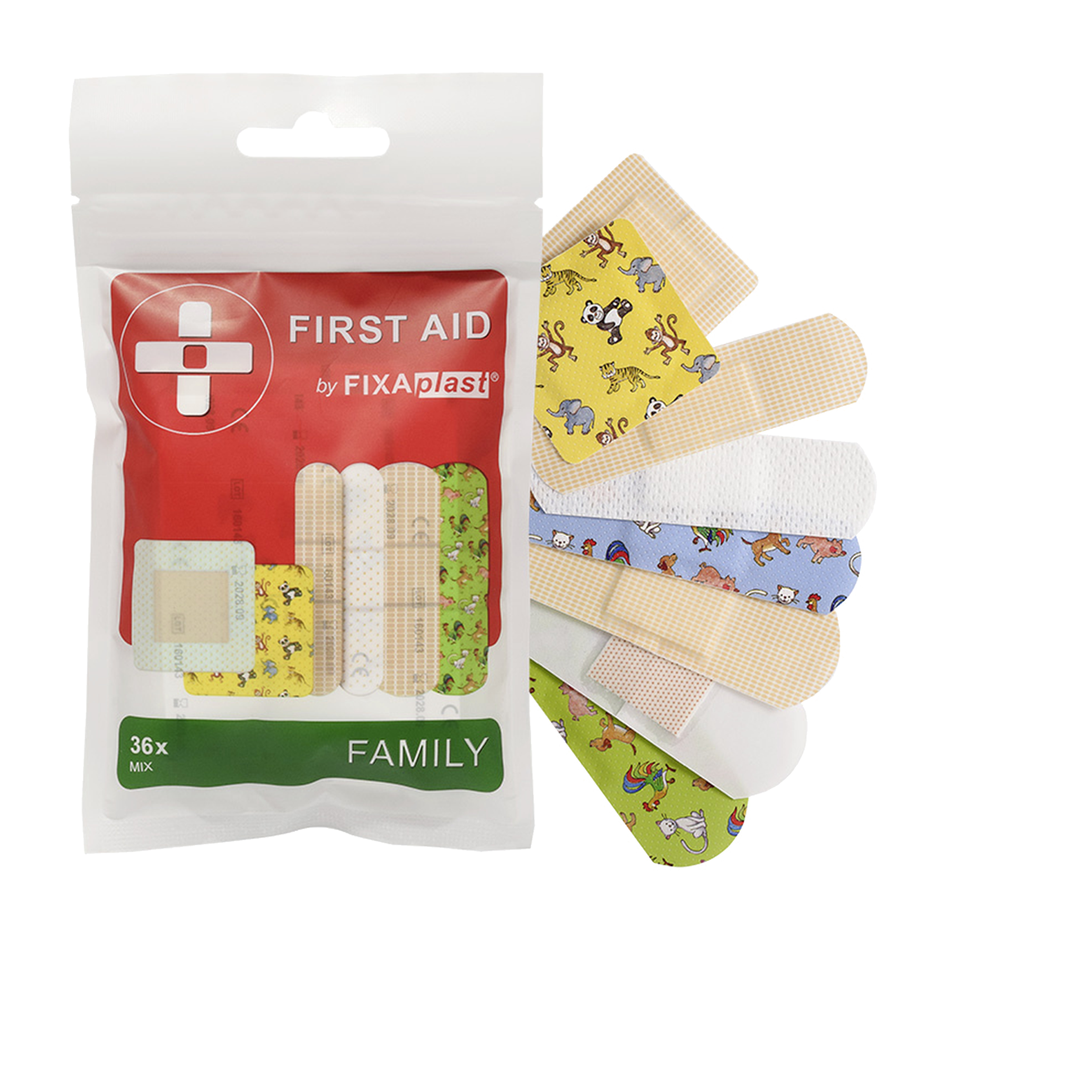 MIX náplastí na drobná poranění z flexibilních materiálů.