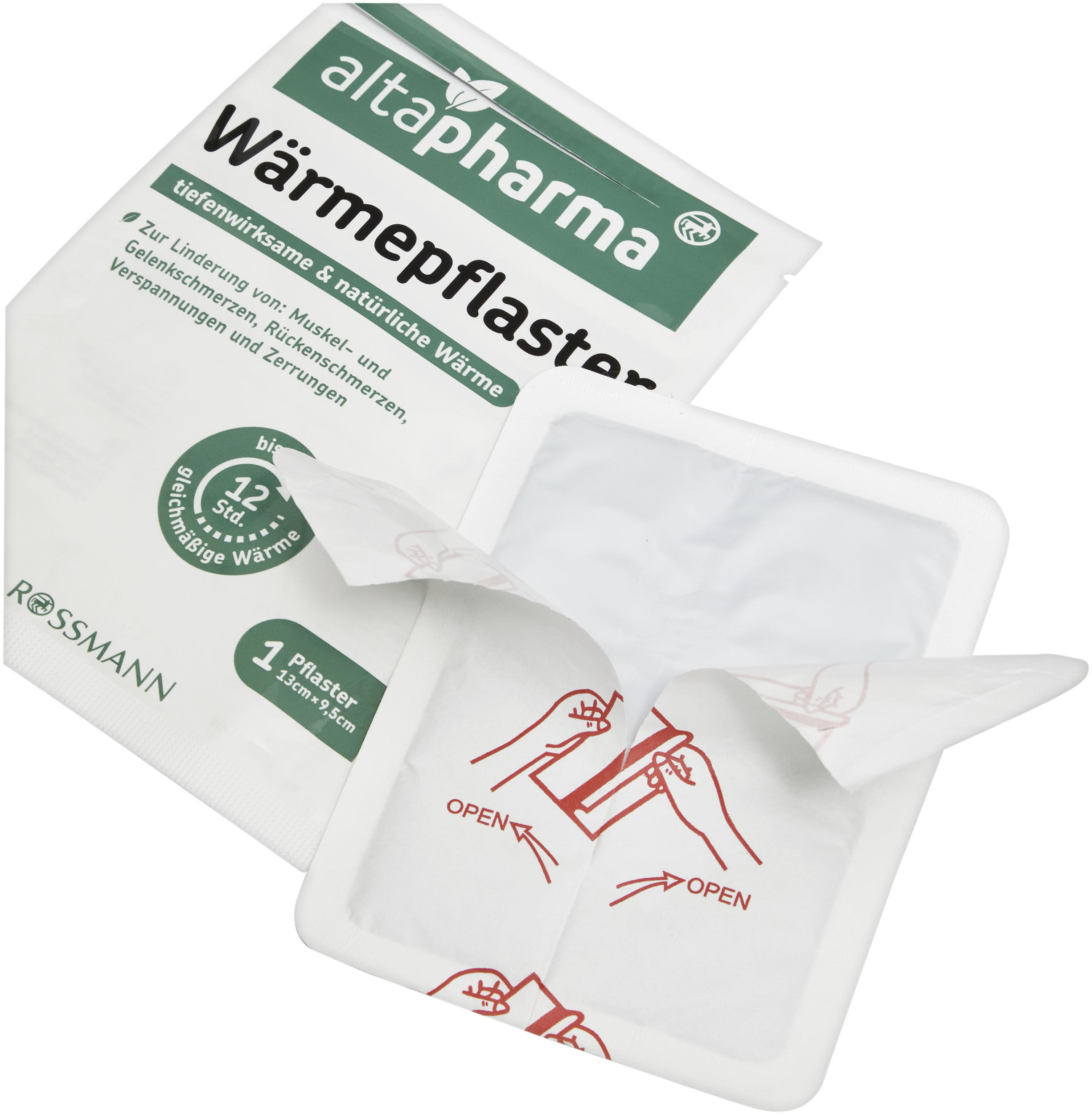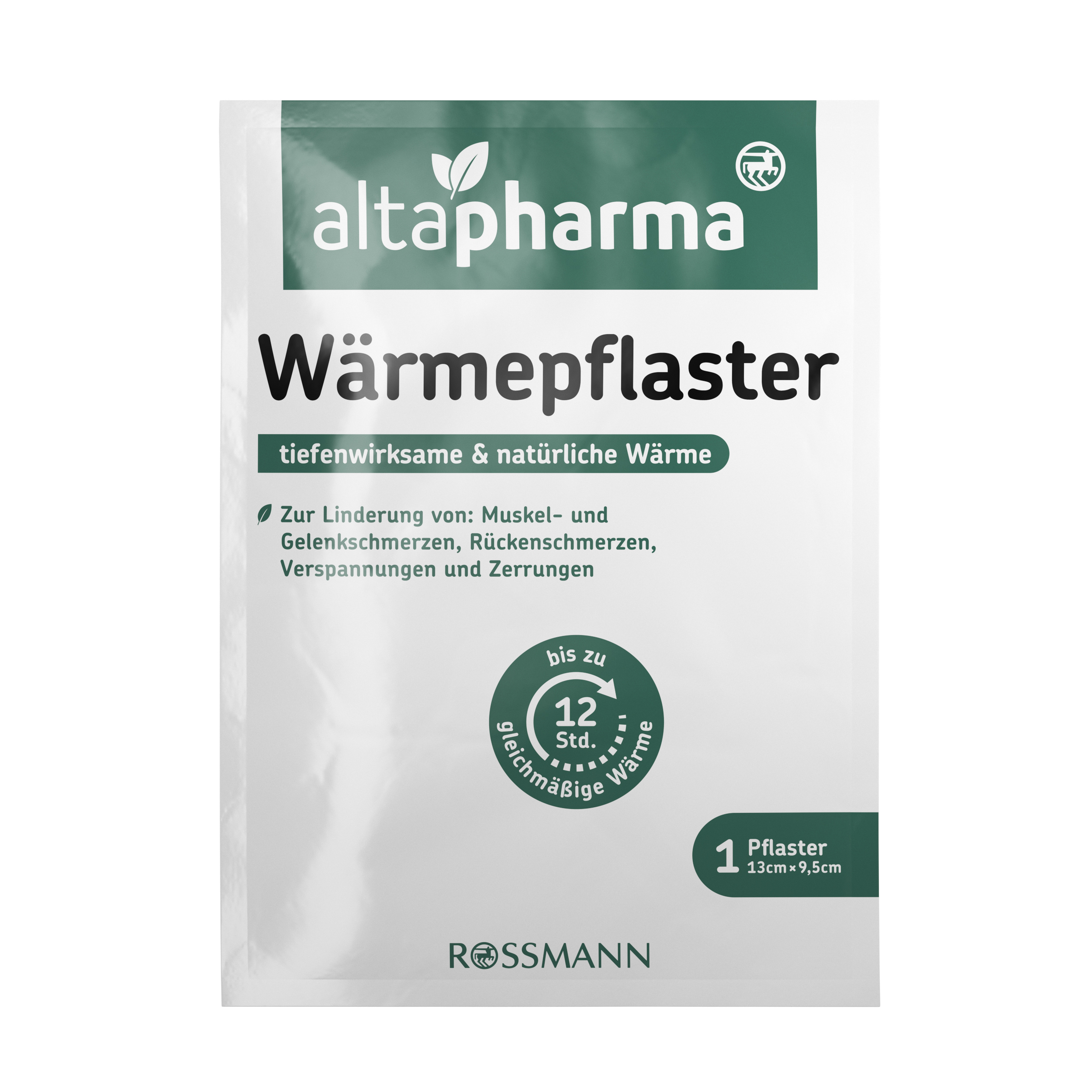 Hřejivé náplasti Altapharma jsou snadnou a rychlou pomocí při problémech s namoženými zády, ztuhlými klouby, při svalové únavě a bolesti kloubů. Náplast pomáhá při svalové horečce a natažení svalů. Díky působení suchého tepla až na 8 hodin přináší uvolnění a hlubokou úlevu postiženým místům. Pružné hřejivé náplasti Altapharma jsou z měkkého materiálu, který je šetrný k pokožce a obsahuje směs aktivního uhlí a železného prášku, který se při kontaktu s kyslíkem zahřívá. Náplasti velmi dobře přilnou k pokožce. Po použití je lze snadno a bezbolestně odstranit. Velikost náplastí je 13 cm/9,5 cm
