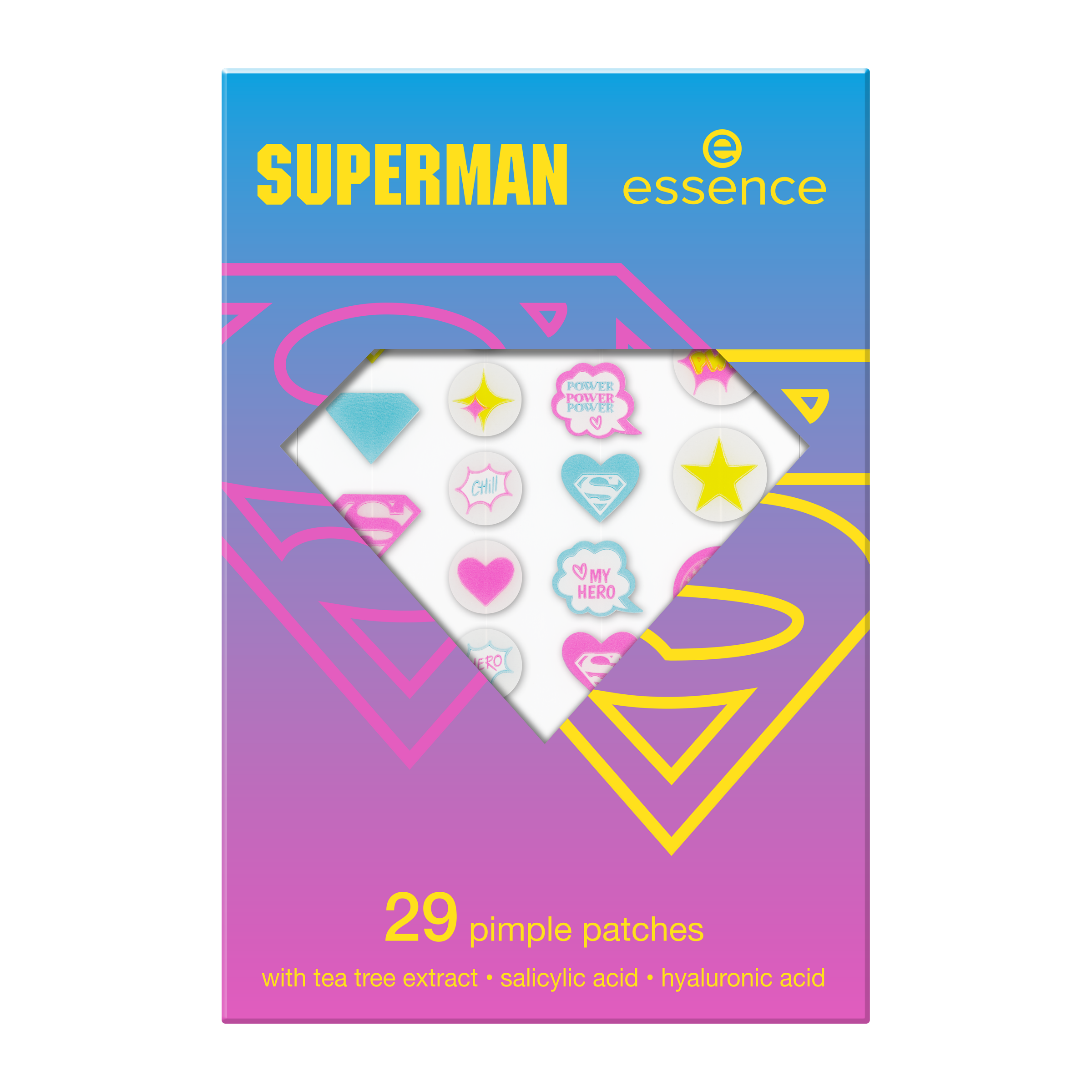Bojujte s pupínky stylově s essence Superman náplastmi na pupínky! Tyto zářivé barevné náplasti se dodávají ve 29 kusech ve čtyřech různých velikostech a různých zábavných designech, což poskytuje diskrétní a personalizované ošetření pupínků. Jsou obohaceny o výtažek z čajovníku, kyselinu salicylovou a kyselinu hyaluronovou. Viditelně zlepšují vzhled pleti a zároveň ji čistí a chrání před poškrábáním. Ideální pro superhrdinské kouzlo ve vaší každodenní péči o pleť.