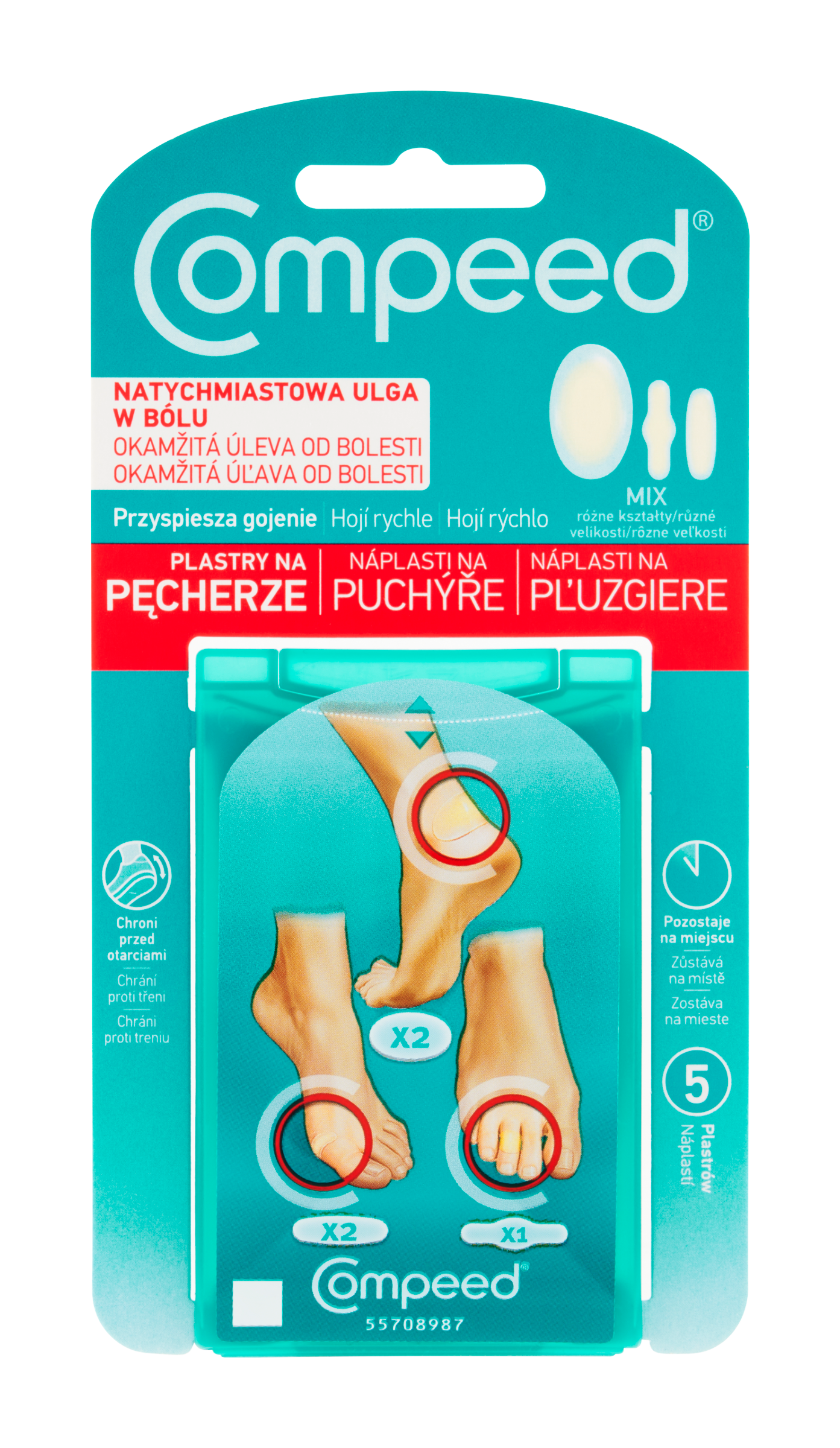 COMPEED® hydrokoloidní technologie je aktivní gel s částicemi absorbujícími vlhkost. COMPEED® náplast na puchýře střední působí jako druhá kůže, čímž přispívá k přirozenému vyrovnávání vlhkosti: okamžitě ulevuje od bolesti, chrání proti tření, podporuje rychlé hojení rány.