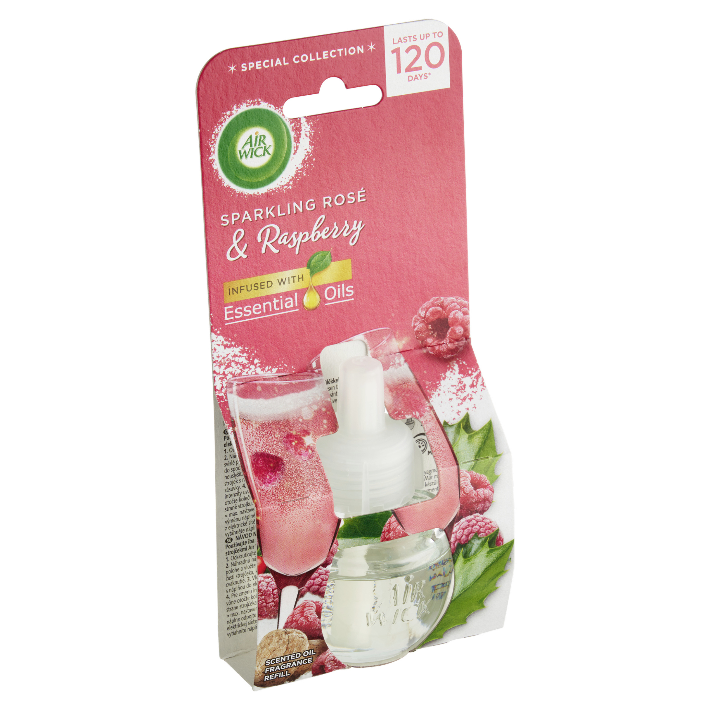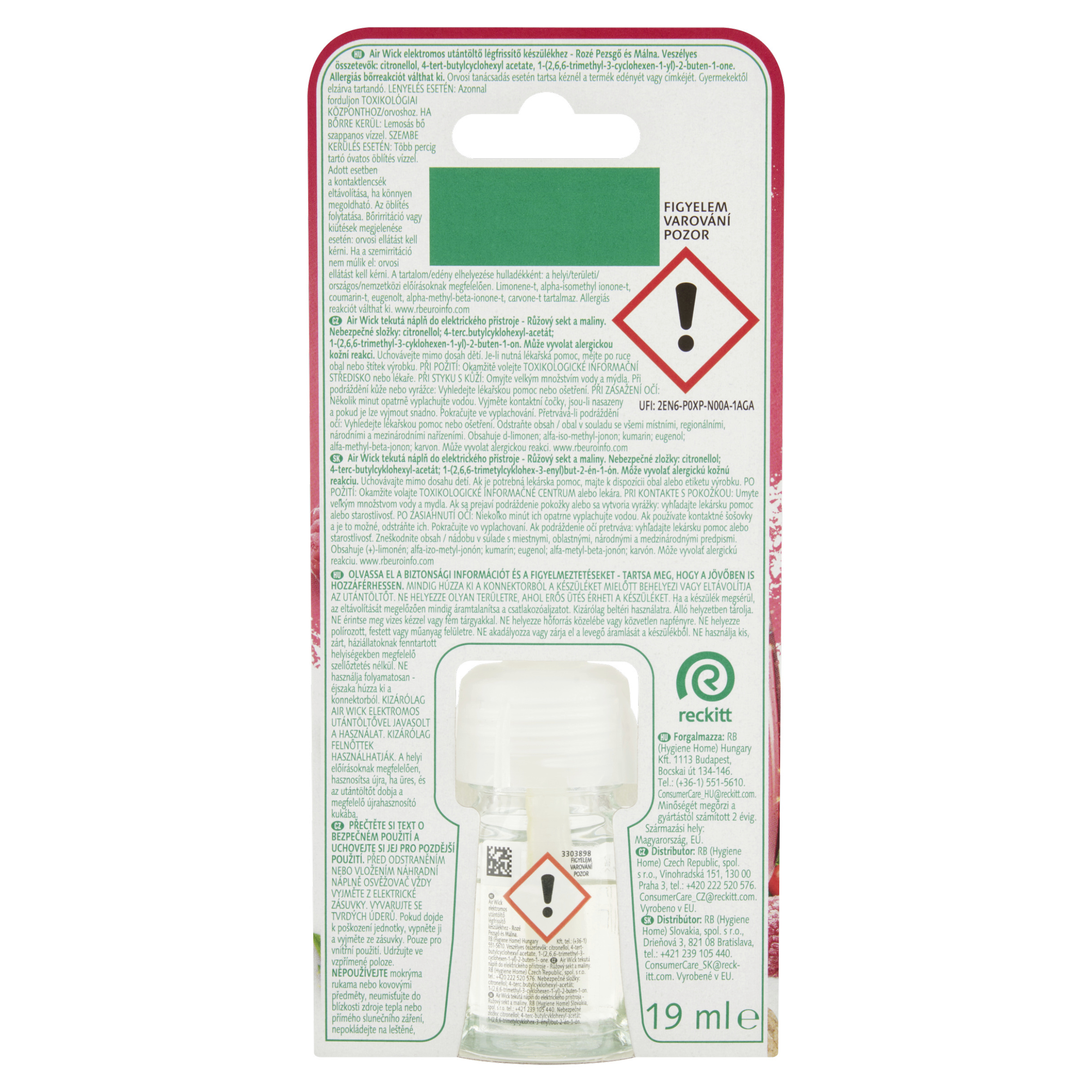 VAROVÁNÍ Air Wick tekutá náplň do elektrického přístroje - Růžový sekt a maliny. Nebezpečné složky: citronellol; 4-terc.butylcyklohexyl-acetát; 1-(2,6,6-trimethyl-3-cyklohexen-1-yl)-2-buten-1-on. Způsobuje vážné podráždění očí. Může vyvolat alergickou kožní reakci. Uchovávejte mimo dosah dětí. Je-li nutná lékařská pomoc, mějte po ruce obal nebo štítek výrobku. PŘI POŽITÍ: Okamžitě volejte TOXIKOLOGICKÉ INFORMAČNÍ STŘEDISKO nebo lékaře. PŘI STYKU S KŮŽÍ: Omyjte velkým množstvím vody a mýdla. Při podráždění kůže nebo vyrážce: Vyhledejte lékařskou pomoc nebo ošetření. PŘI ZASAŽENÍ OČÍ: Několik minut opatrně vyplachujte vodou. Vyjměte kontaktní čočky, jsou-li nasazeny a pokud je lze vyjmout snadno. Pokračujte ve vyplachování. Přetrvává-li podráždění očí: Vyhledejte lékařskou pomoc nebo ošetření. Obsahuje d-limonen; alfa-iso-methyl-jonon; kumarin; eugenol; alfa-methyl-beta-jonon; karvon. Může vyvolat alergickou reakci. PŘEČTĚTE SI TEXT O BEZPEČNÉM POUŽITÍ A UCHOVEJTE SI JEJ PRO POZDĚJŠÍ POUŽITÍ. PŘED ODSTRANĚNÍM NEBO VLOŽENÍM NÁHRADNÍ NÁPLNĚ OSVĚŽOVAČ VŽDY VYJMĚTE Z ELEKTRICKÉ ZÁSUVKY. VYVARUJTE SE TVRDÝCH ÚDERŮ. Pokud dojde k poškození jednotky, vypněte ji a vyjměte ze zásuvky. Pouze pro vnitřní použití. Udržujte ve vzpřímené poloze. NEPOUŽÍVEJTE mokrýma rukama nebo kovovými předměty, neumisťujte do blízkosti zdroje tepla nebo přímého slunečního záření, nepokládejte na leštěné, lakované nebo plastové povrchy. NEBRAŇTE ani neblokujte proudění vzduchu z jednotky, nepoužívejte v malých uzavřených prostorách pro zvířata bez dostatečného větrání nebo nepoužívejte nepřetržitě - vytáhněte ze zásuvky přes noc. POUŽÍVEJTE POUZE S ELEKTRICKÝM STROJKEM AIR WICK. ZAŘÍZENÍ SMĚJÍ POUŽÍVAT POUZE DOSPĚLÍ. Osoby s přecitlivělostí na vůně by měly tento výrobek používat s opatrností. Osvěžovače vzduchu nemohou nahradit správné hygienické návyky. Používejte v dobře větraném prostoru.