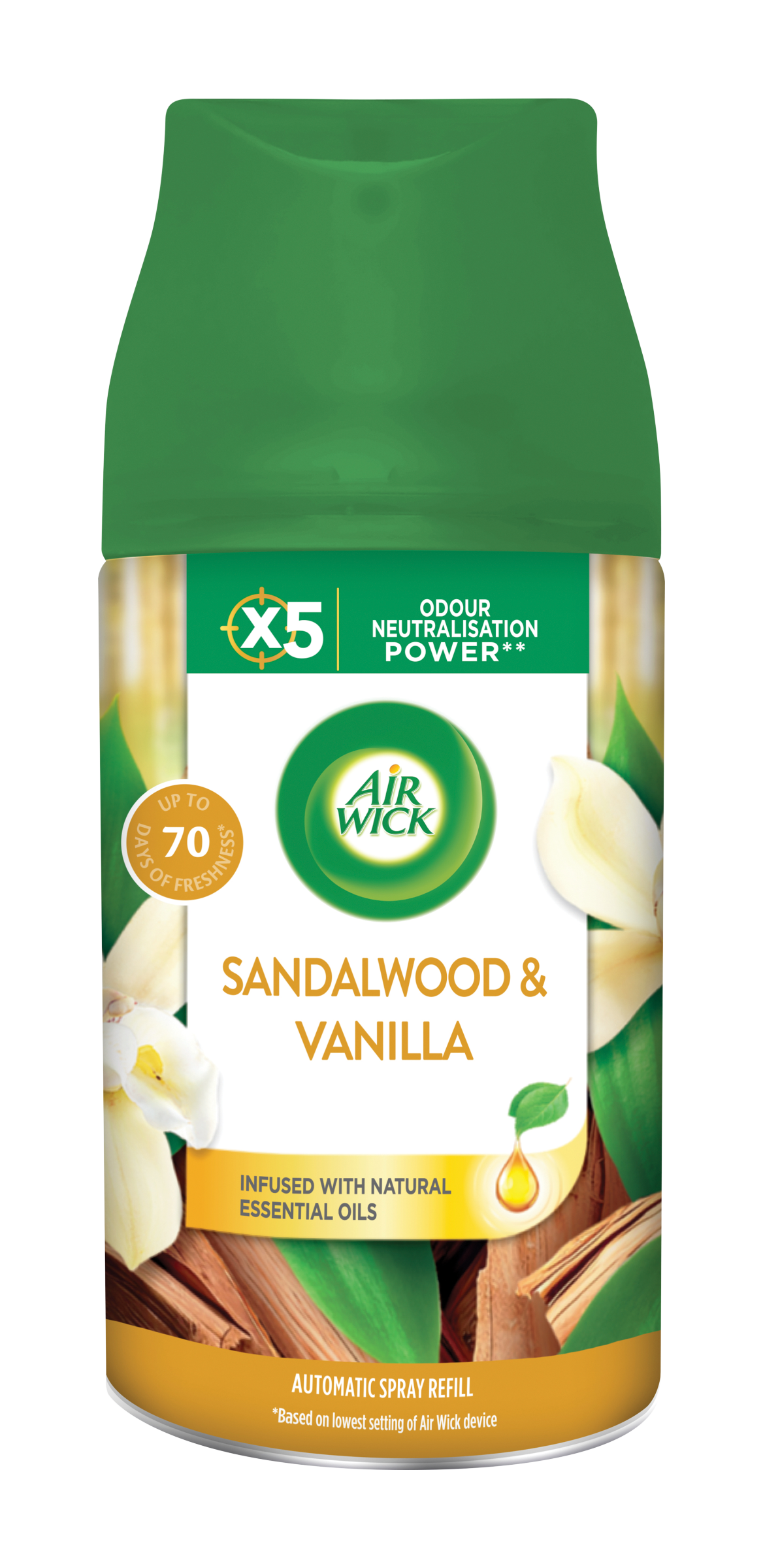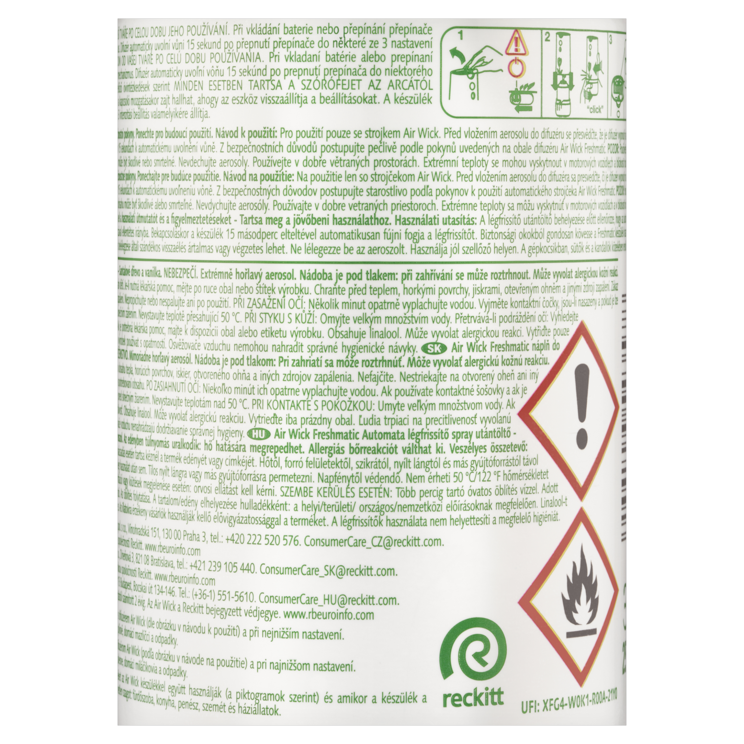 Upozornění: Před použitím si vždy přečtěte bezpečnostní pokyny. Ponechte pro budoucí použití. POZOR: Používejte pouze v souladu s pokyny. Úmyslné zneužití záměrným koncentrováním a vdechováním obsahu může být škodlivé nebo smrtelné. Nevdechujte aerosoly. Používejte v dobře větraných prostorách. Extrémní teploty se mohou vyskytnout v motorových vozidlech a blízkosti trub a krbů. Kluzký na tvrdých površích. Air Wick Freshmatic náplň do osvěžovače vzduchu - Santalové dřevo a vanilka. NEBEZPEČÍ. Extrémně hořlavý aerosol. Nádoba je pod tlakem: při zahřívání se může roztrhnout. Může vyvolat alergickou reakci. Nebezpečná složka: cinnamaldehyd. Uchovávejte mimo dosah dětí. Je-li nutná lékařská pomoc, mějte po ruce obal nebo štítek výrobku. Chraňte před teplem, horkými povrchy, jiskrami, otevřeným ohněm a jinými zdroji zapálení. Zákaz kouření. Nestříkejte do otevřeného ohně nebo jiných zdrojů zapálení. Nepropichujte nebo nespalujte ani po použití. PŘI ZASAŽENÍ OČÍ: Několik minut opatrně vyplachujte vodou. Vyjměte kontaktní čočky, jsou-li nasazeny a pokud je lze vyjmout snadno. Pokračujte ve vyplachování. Chraňte před slunečním zářením. Nevystavujte teplotě přesahující 50 °C. PŘI STYKU S KŮŽÍ: Omyjte velkým množstvím vody. Přetrvává-li podráždění očí: Vyhledejte lékařskou pomoc/ošetření. Obsahuje linalool. Může vyvolat alergickou reakci. Osoby s přecitlivělostí na vůně by měly tento výrobek používat s opatrností. Osvěžovače vzduchu nemohou nahradit správné hygienické návyky.