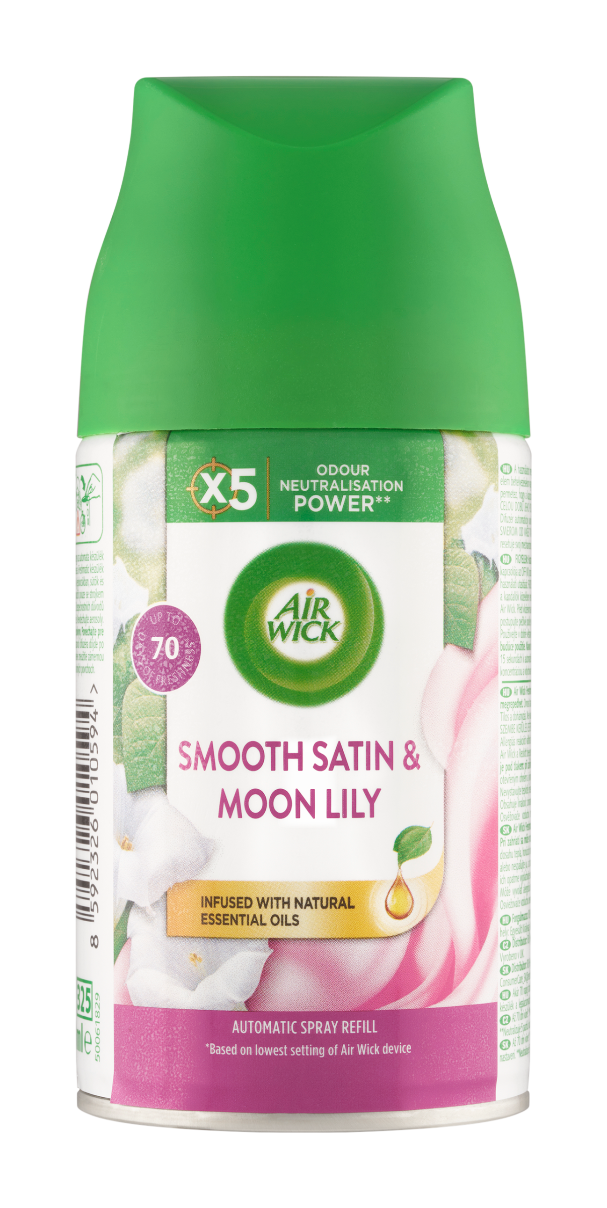 Až 70 dní vůně*. *Platí, pokud je výrobek používán s novým difuzérem Air Wick (dle obrázku v návodu k použití) a při nejnižším nastavení. Neutralizuje 5 pachů: kuchyně, koupelna, plísně, domácí mazlíčci a odpadky.