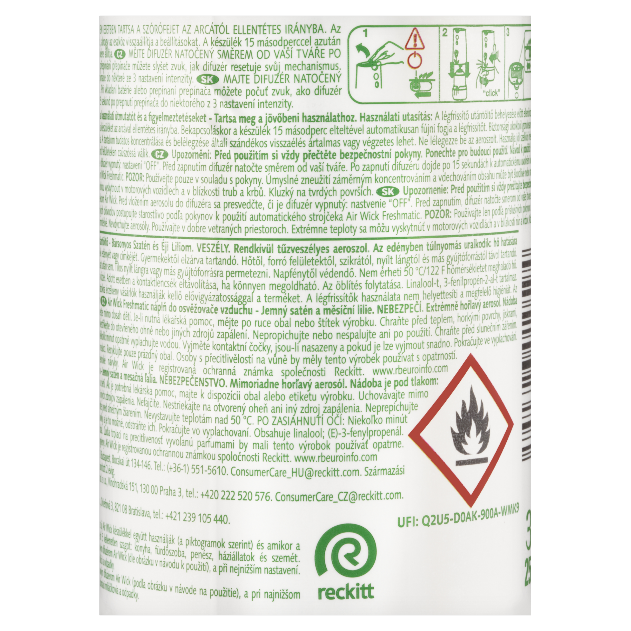 Upozornění: Před použitím si vždy přečtěte bezpečnostní pokyny. Ponechte pro budoucí použití. POZOR: Používejte pouze v souladu s pokyny. Úmyslné zneužití záměrným koncentrováním a vdechováním obsahu může být škodlivé nebo smrtelné. Nevdechujte aerosoly. Používejte v dobře větraných prostorách. Extrémní teploty se mohou vyskytnout v motorových vozidlech a v blízkosti trub a krbů. Kluzký na tvrdých površích. Air Wick Freshmatic náplň do osvěžovače vzduchu - Jemný satén a měsíční lilie. NEBEZPEČÍ. Extrémně hořlavý aerosol. Nádoba je pod tlakem: při zahřívání se může roztrhnout. Uchovávejte mimo dosah dětí. Je-li nutná lékařská pomoc, mějte po ruce obal nebo štítek výrobku. Chraňte před teplem, horkými povrchy, jiskrami, otevřeným ohněm a jinými zdroji zapálení. Zákaz kouření. Nestříkejte do otevřeného ohně nebo jiných zdrojů zapálení. Nepropichujte nebo nespalujte ani po použití. Chraňte před slunečním zářením. Nevystavujte teplotě přesahující 50 °C. PŘI ZASAŽENÍ OČÍ: Několik minut opatrně vyplachujte vodou. Vyjměte kontaktní čočky, jsou-li nasazeny a pokud je lze vyjmout snadno. Pokračujte ve vyplachování. Obsahuje linalool; cinnamaldehyd. Může vyvolat alergickou reakci. Osoby s přecitlivělostí na vůně by měly tento výrobek používat s opatrností. Osvěžovače vzduchu nemohou nahradit správné hygienické návyky.