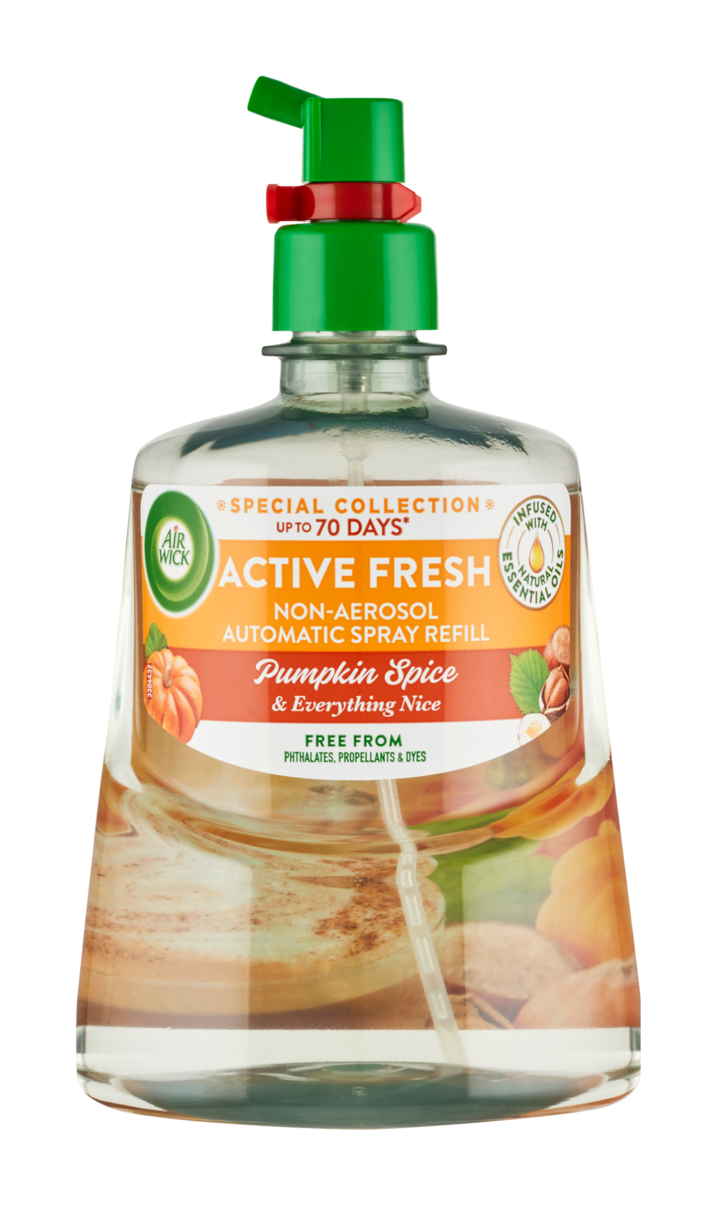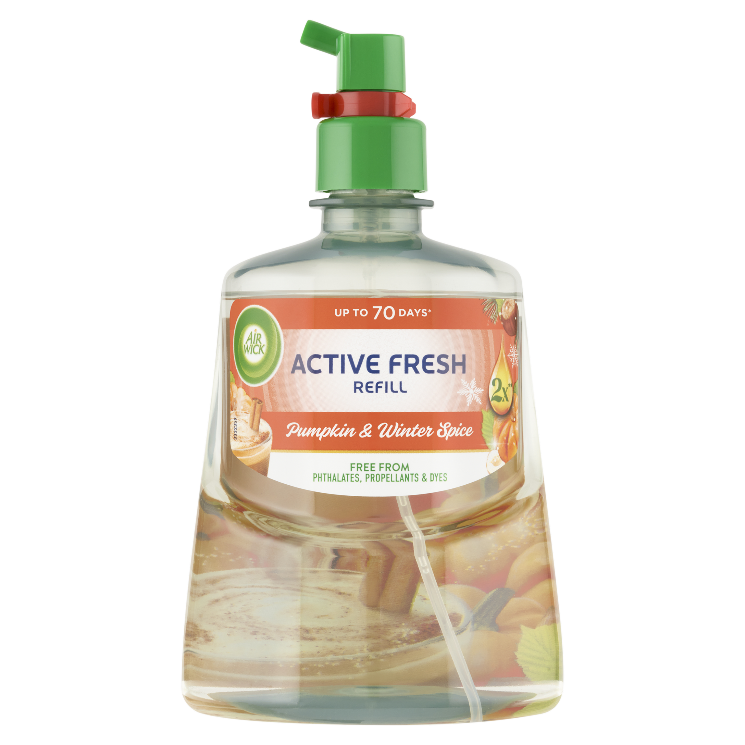 Air Wick Active Fresh Náplň na vodní bázi do automatického difuzéru Pumpkin & Winter Spice. Až 70 dní vůně – platí, pokud je výrobek používán s difuzérem Air Wick (dle obrázku v návodu k použití) a při nejnižším nastavení.