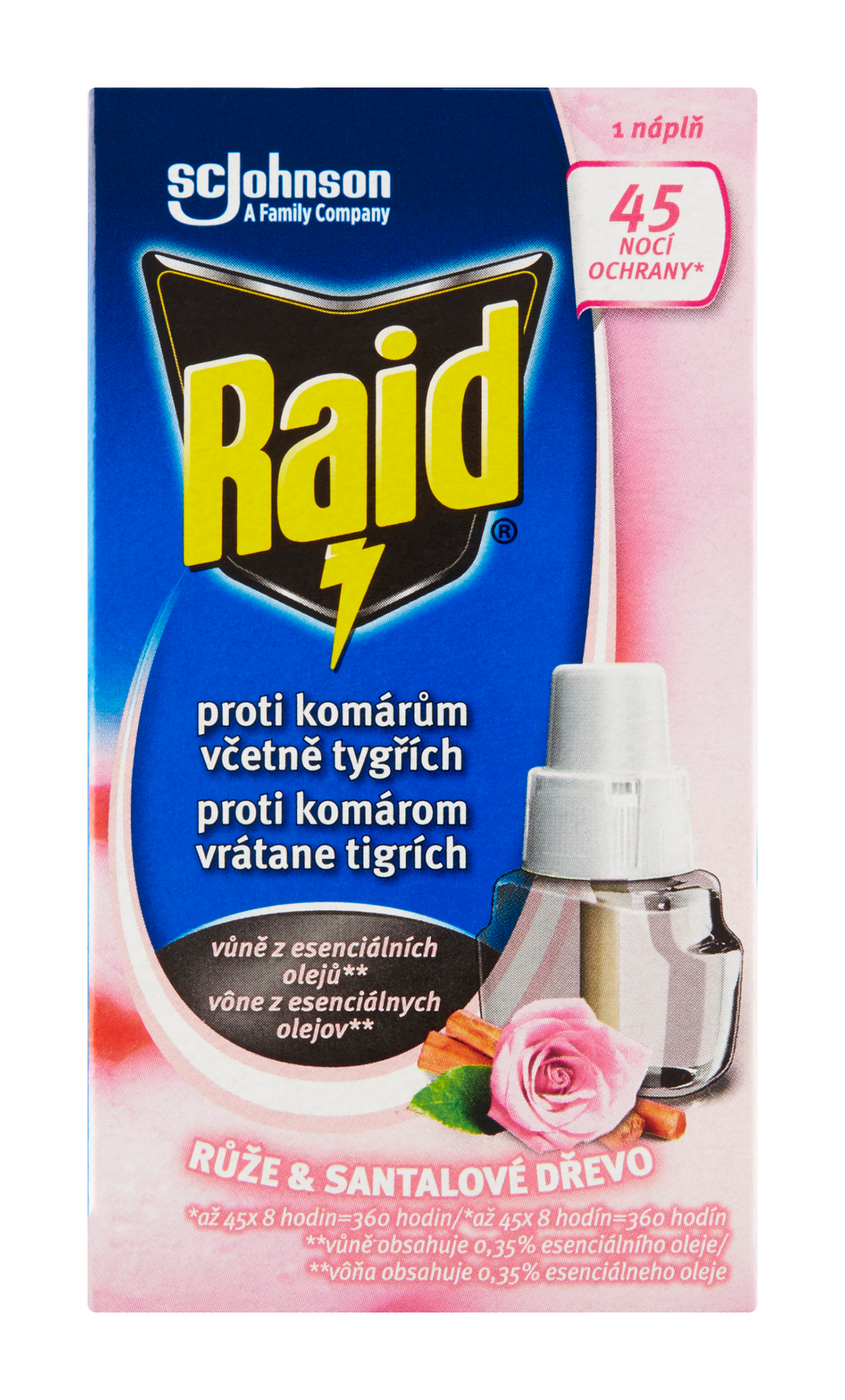 45 nocí ochrany*. Vůně z esenciálních olejů**. Nízká spotřeba energie***. Raid® elektrický odpařovač s tekutou náplní růže & santalové dřevo - náplň, insekticid poskytuje efektivní ochranu proti komárům až 45 nocí/8 hodin/noc. Poskytuje nepřetržitou a diskrétní ochranu bez nepříjemného zápachu nebo dýmu.