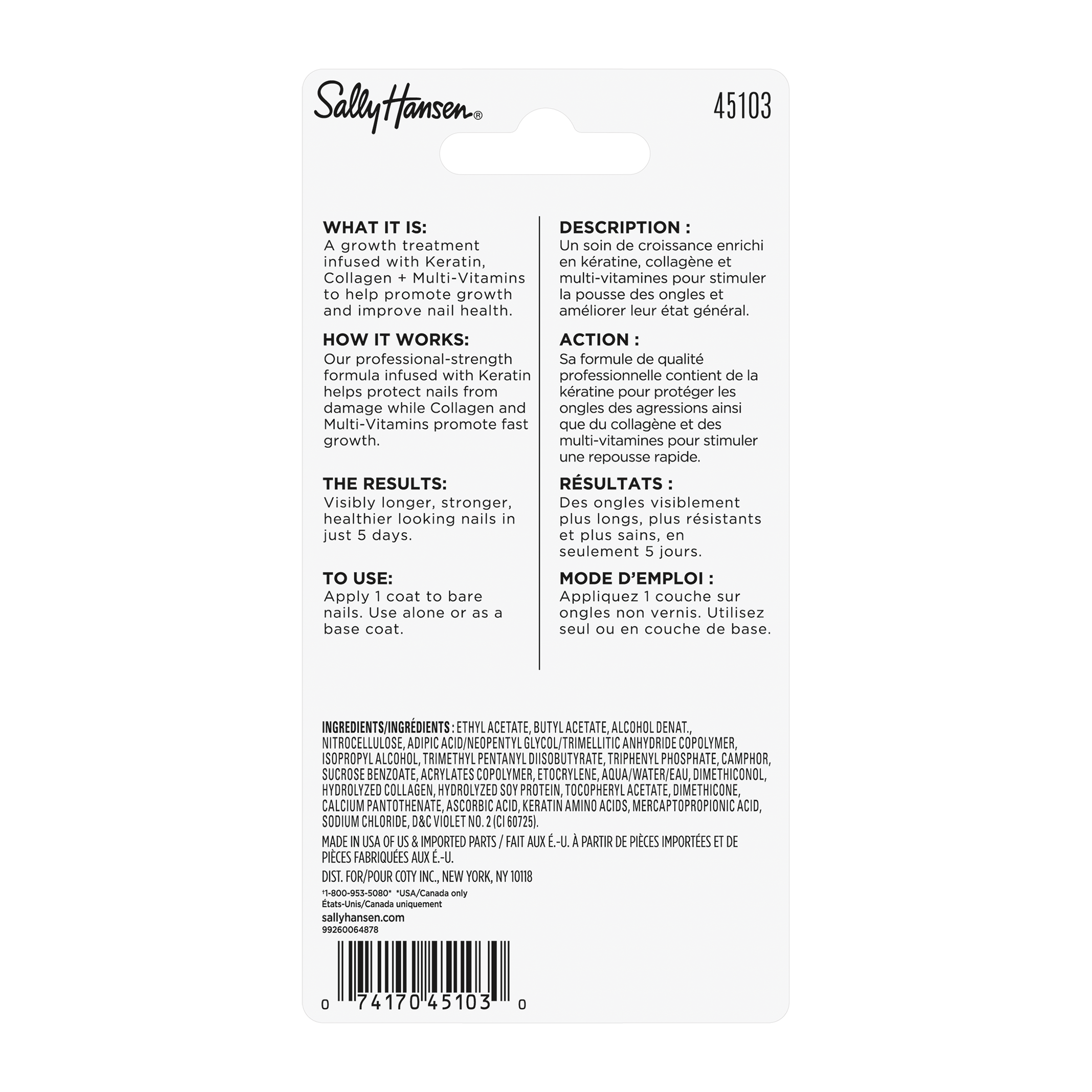 O 30% delší nehty za 5 dní! Unikátní složení se sójovými proteiny posiluje nehty a podporuje jejich růst. Keratin pomáhá chránit nehty proti třepení a lámání. Kolagen a multi-vitaminový komplex pomáhají stimulovat zdravý růst nehtů.