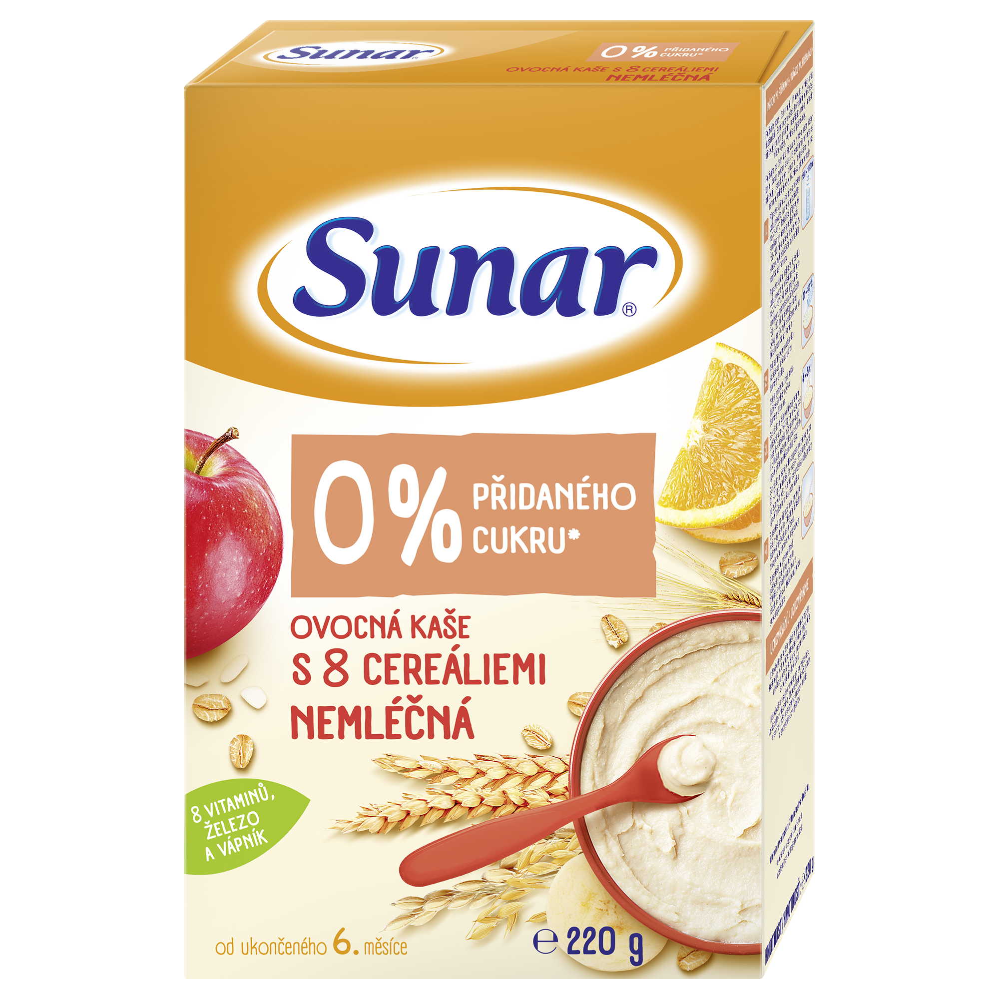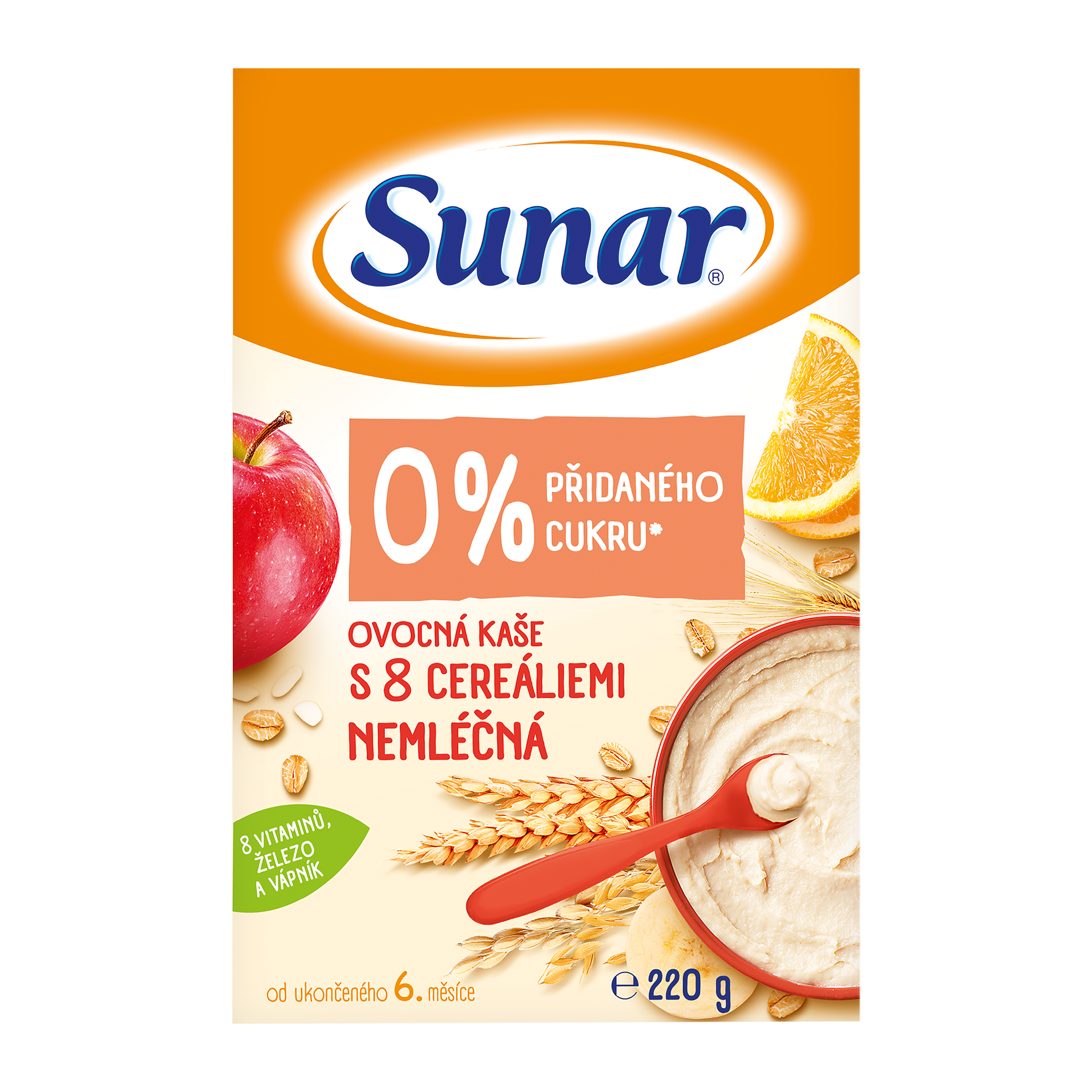 Sunar nemléčná kaše s 8 cereáliemi je vhodná jako první příkrm při zavádění pevné stravy do jídelníčku. Je vhodná při zavádění lepku do stravy díky vybraným cereáliím. Složení bez přidaného cukru.