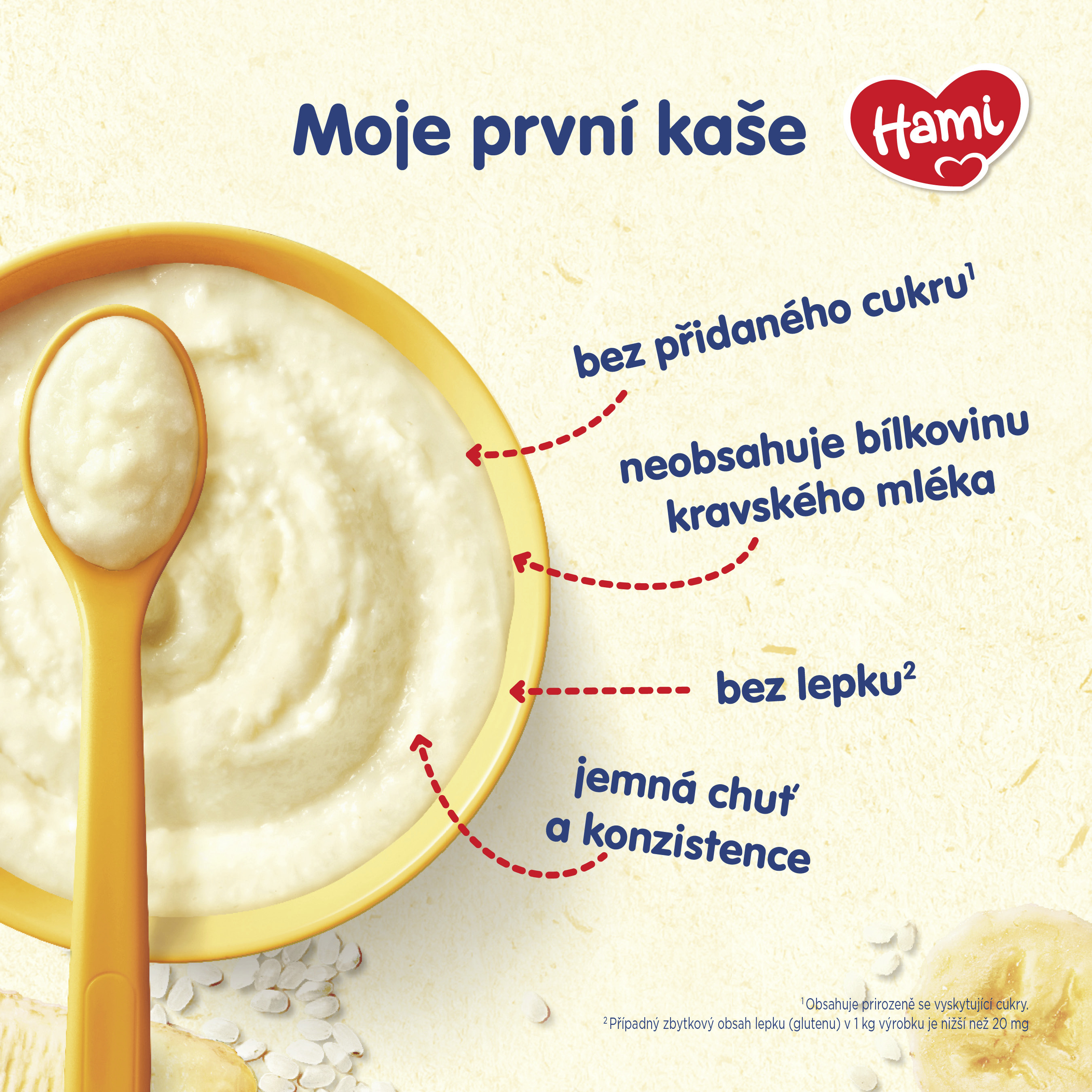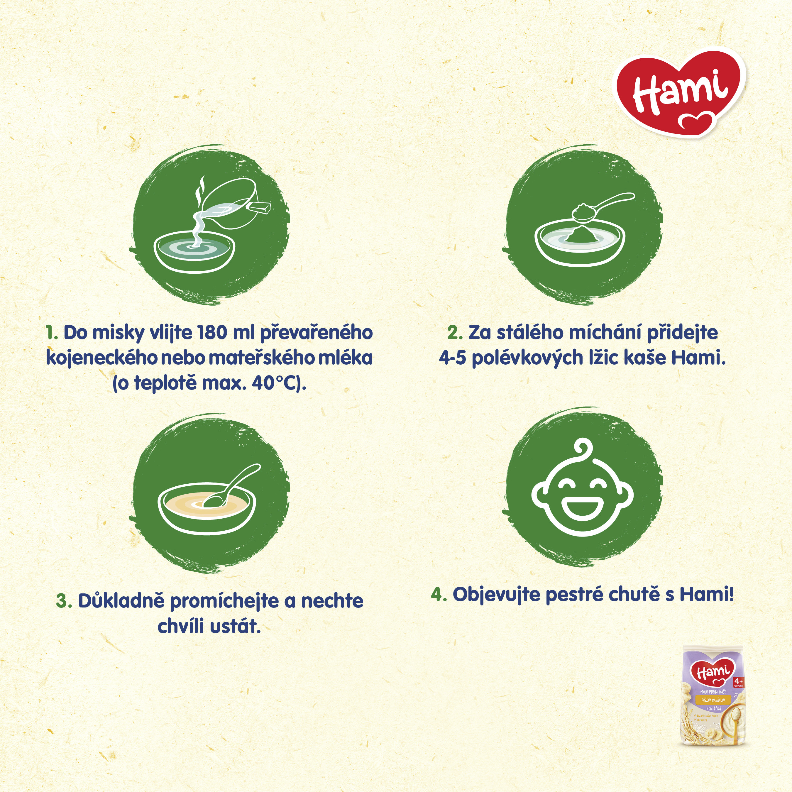 Nemléčné kaše Hami neobsahují přidaný cukr ani bílkoviny kravského mléka a hodí se tedy i pro miminka s případnou alergií. Navíc jsou bez lepku. Vyzkoušejte například Moji první kaši nemléčnou rýžovou nebo rýžovou s banánem. V Hami věříme, že na všem, co vaše děťátko ochutná a prožije v prvních letech života, opravdu záleží. Naučit miminko oblíbit si zdravé jídlo je přitom někdy docela výzva. Abyste to měly snazší, jsme v tom s Vámi. Proto přípravě příkrmů pro vaše nejmenší věnujeme tu největší péči.