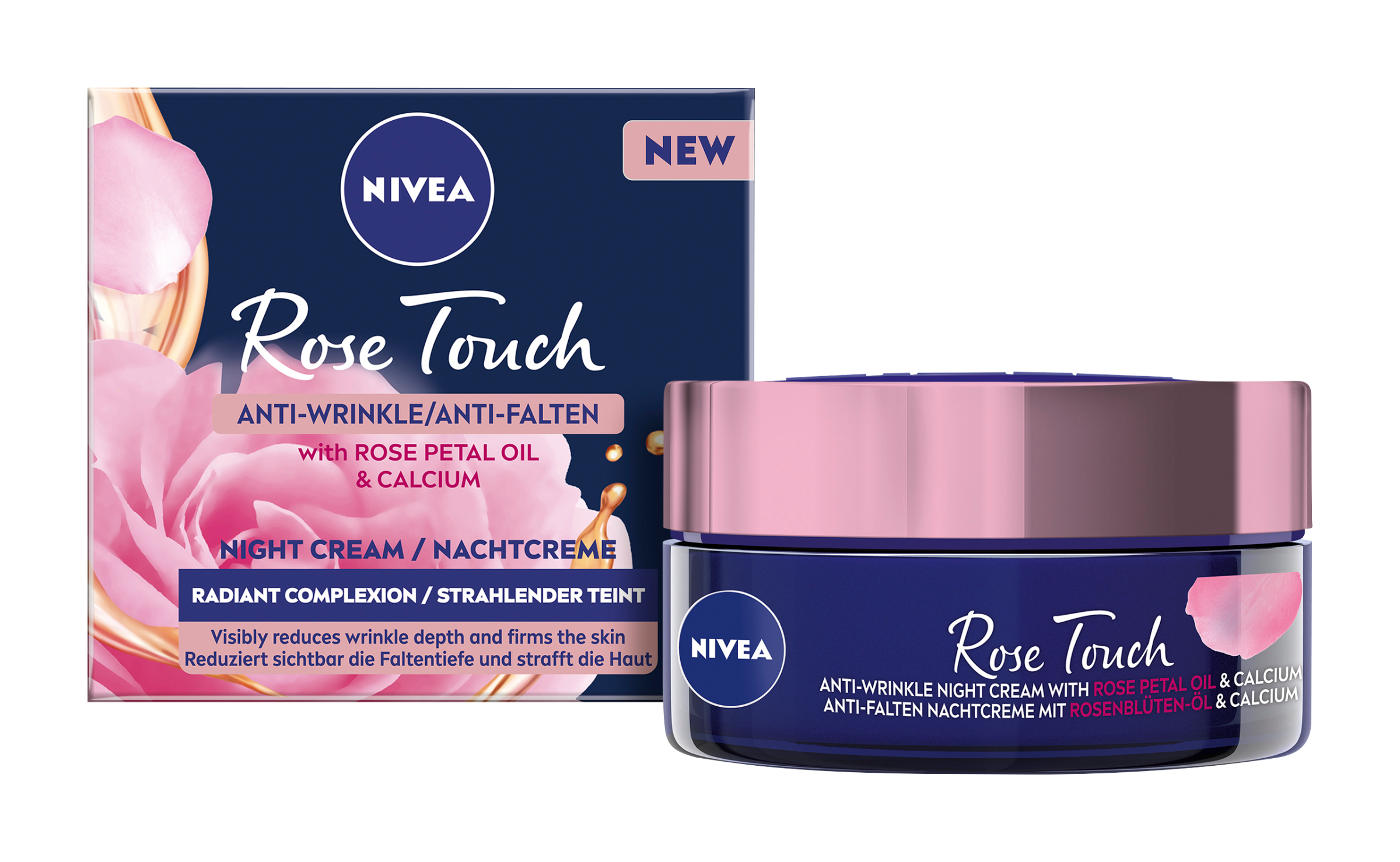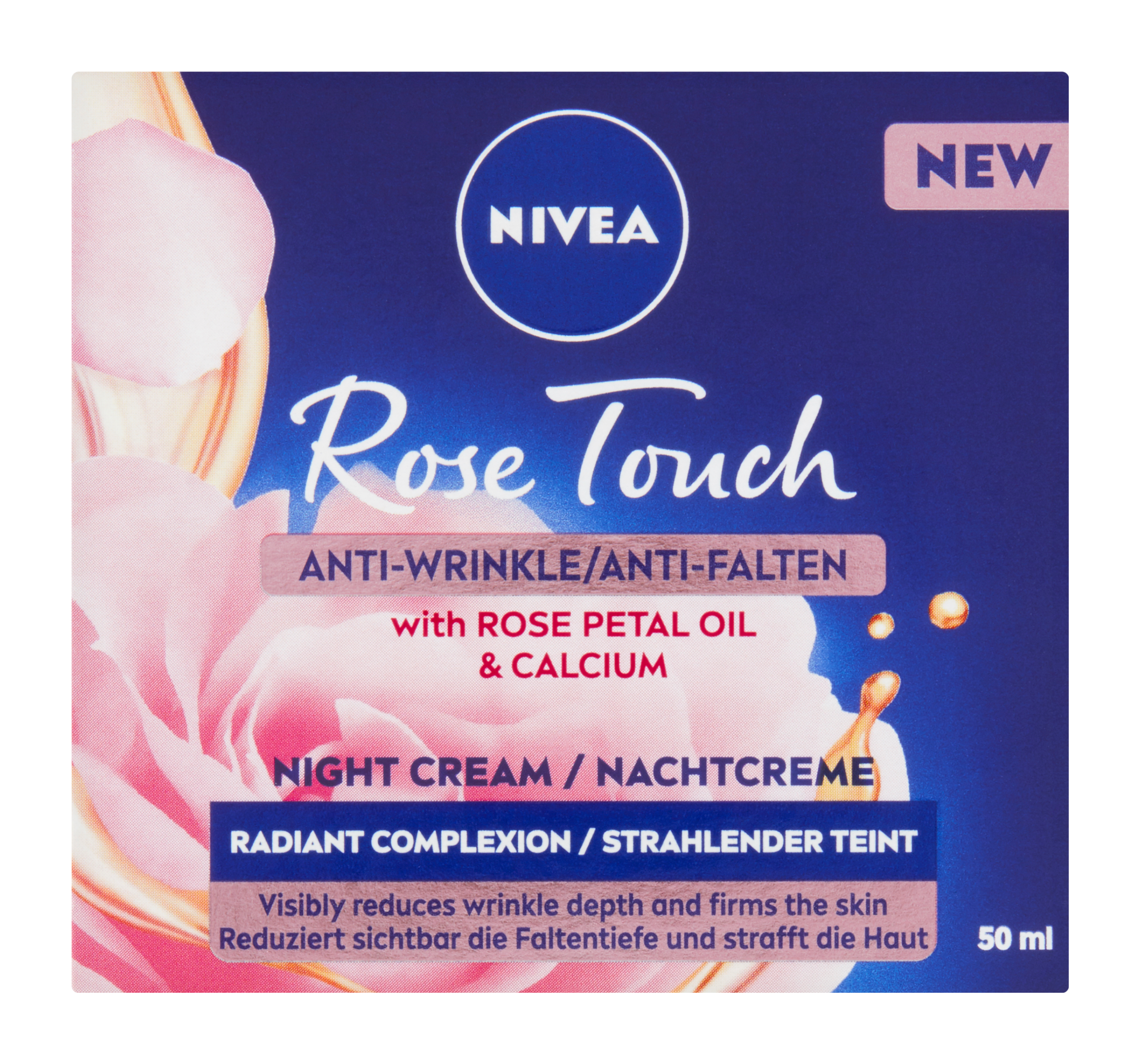 Nivea® noční krém proti vráskám Rose Touch s olejem z okvětních lístků růže a kalciem viditelně redukuje i hluboké vrásky, intenzivně pleť hydratuje a rozjasňuje ji. Kreatin zpevňuje a vyhlazuje pleť stimulací pleťových buněk k produkci vlastního kolagenu.*