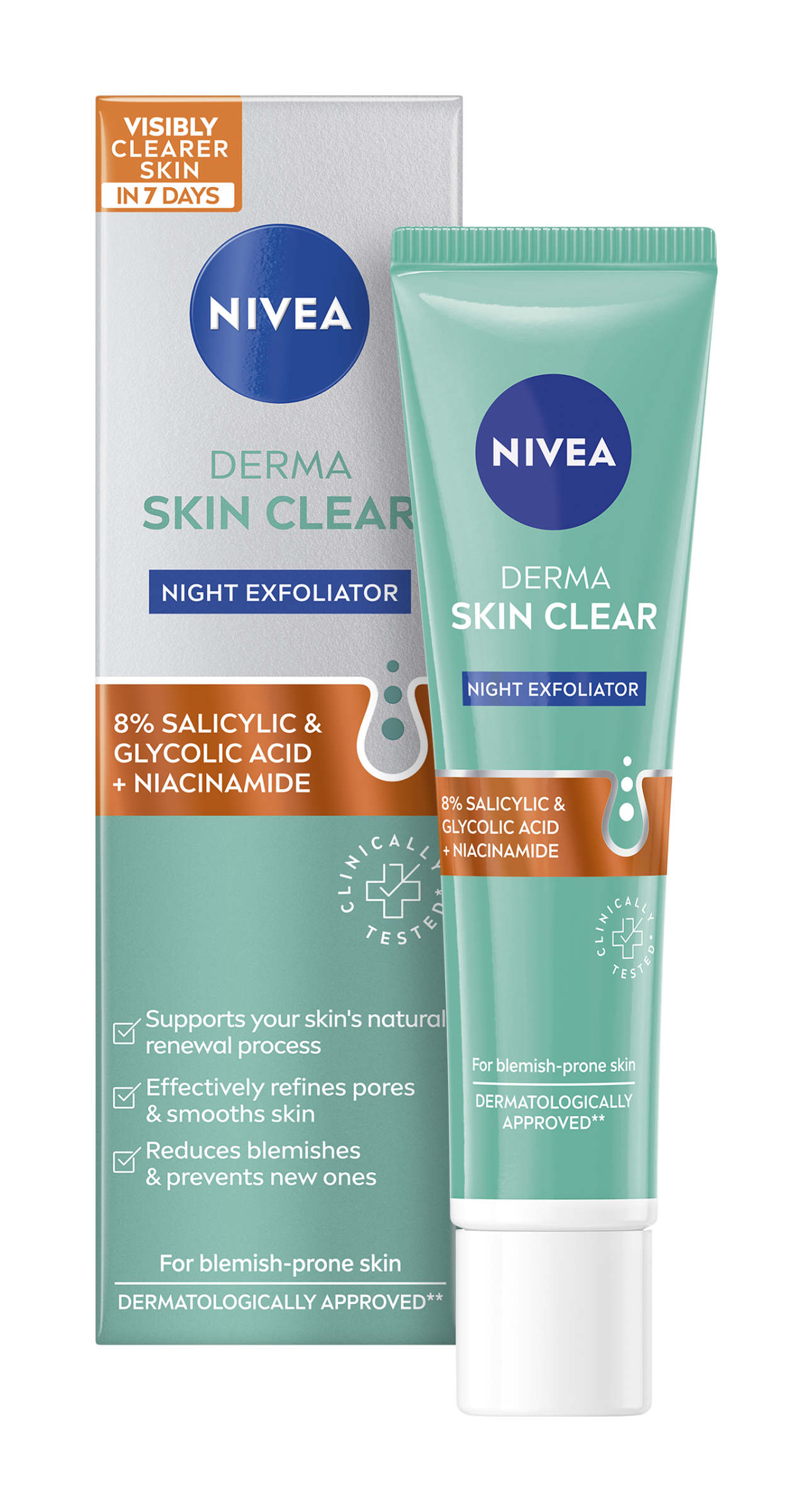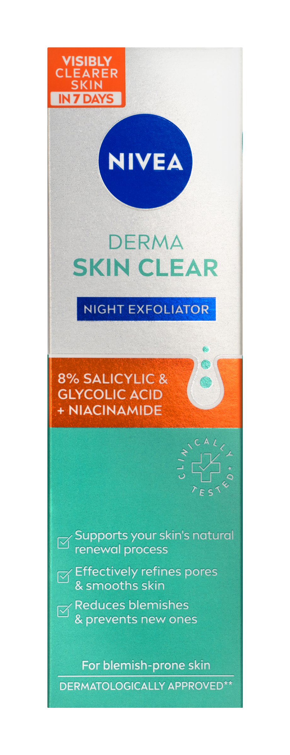 Nivea® Noční exfoliátor s koncentrovaným složením s 8% AHA/BHA (kyselina glykolová a salicylová) a niacinamidem je speciálně vyvinutý pro pleť se sklonem k nedokonalostem.