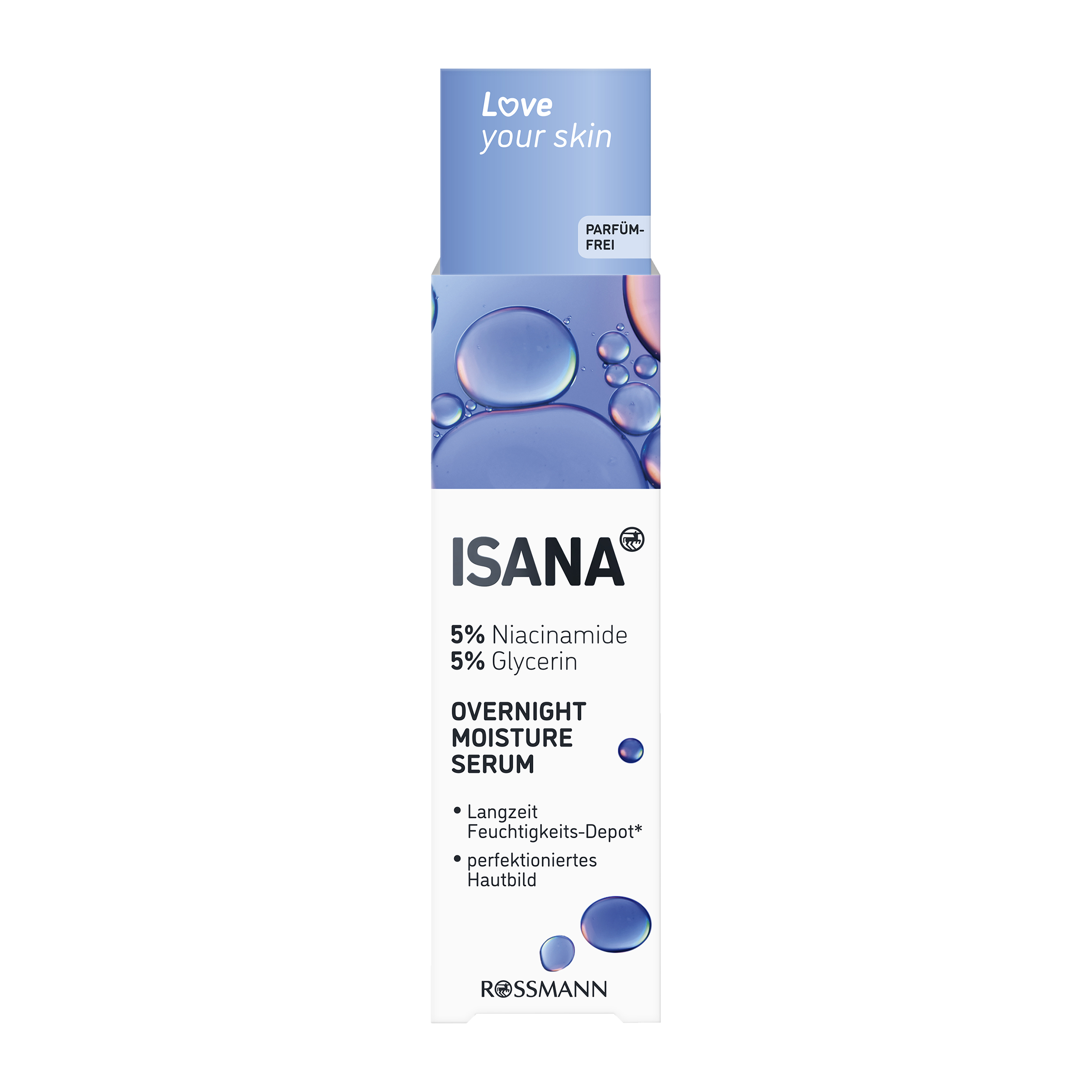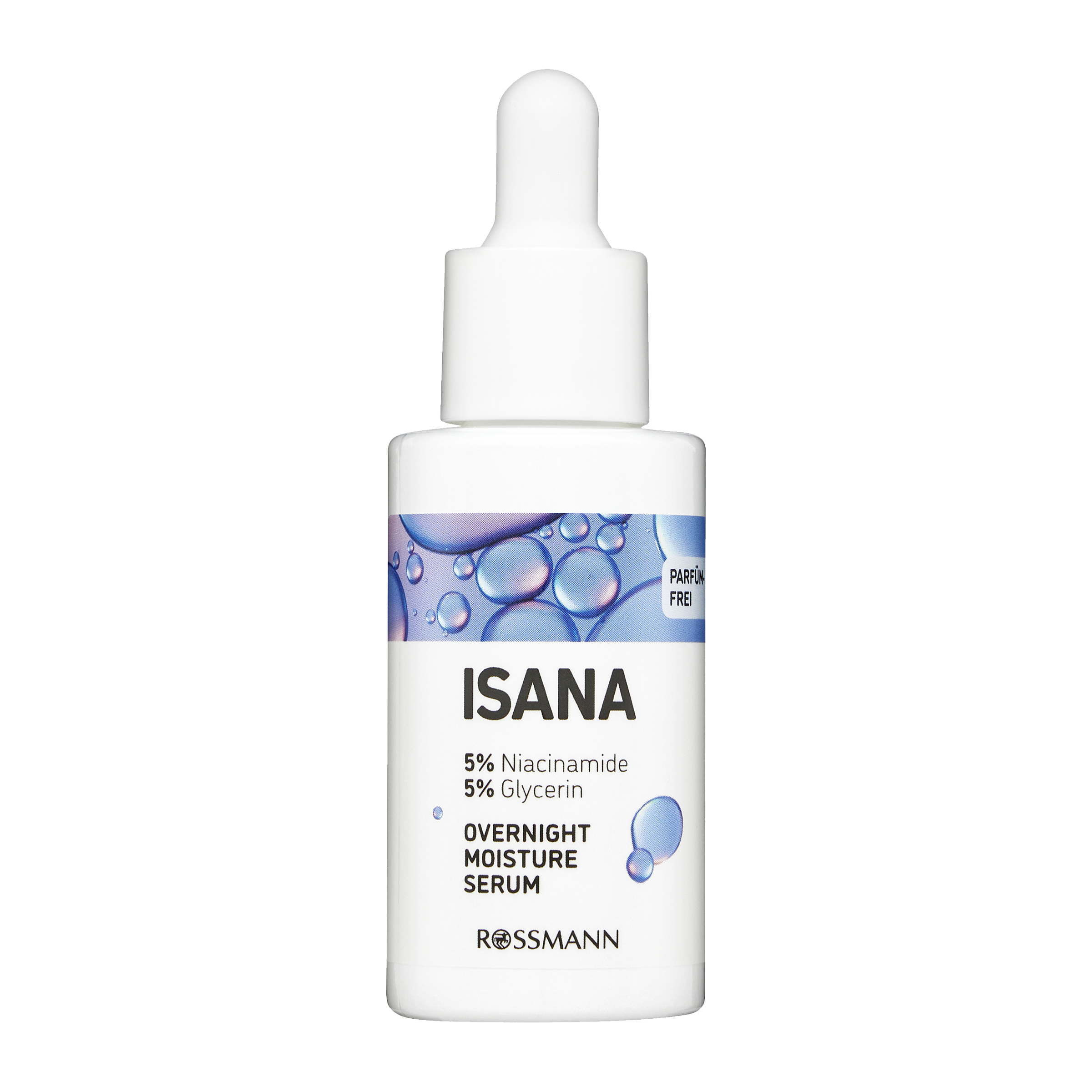Noční hydratační sérum ISANA s vybraným konceptem koncentrovaných účinných látek se zaměřuje na speciální péči o pleť přes noc.
