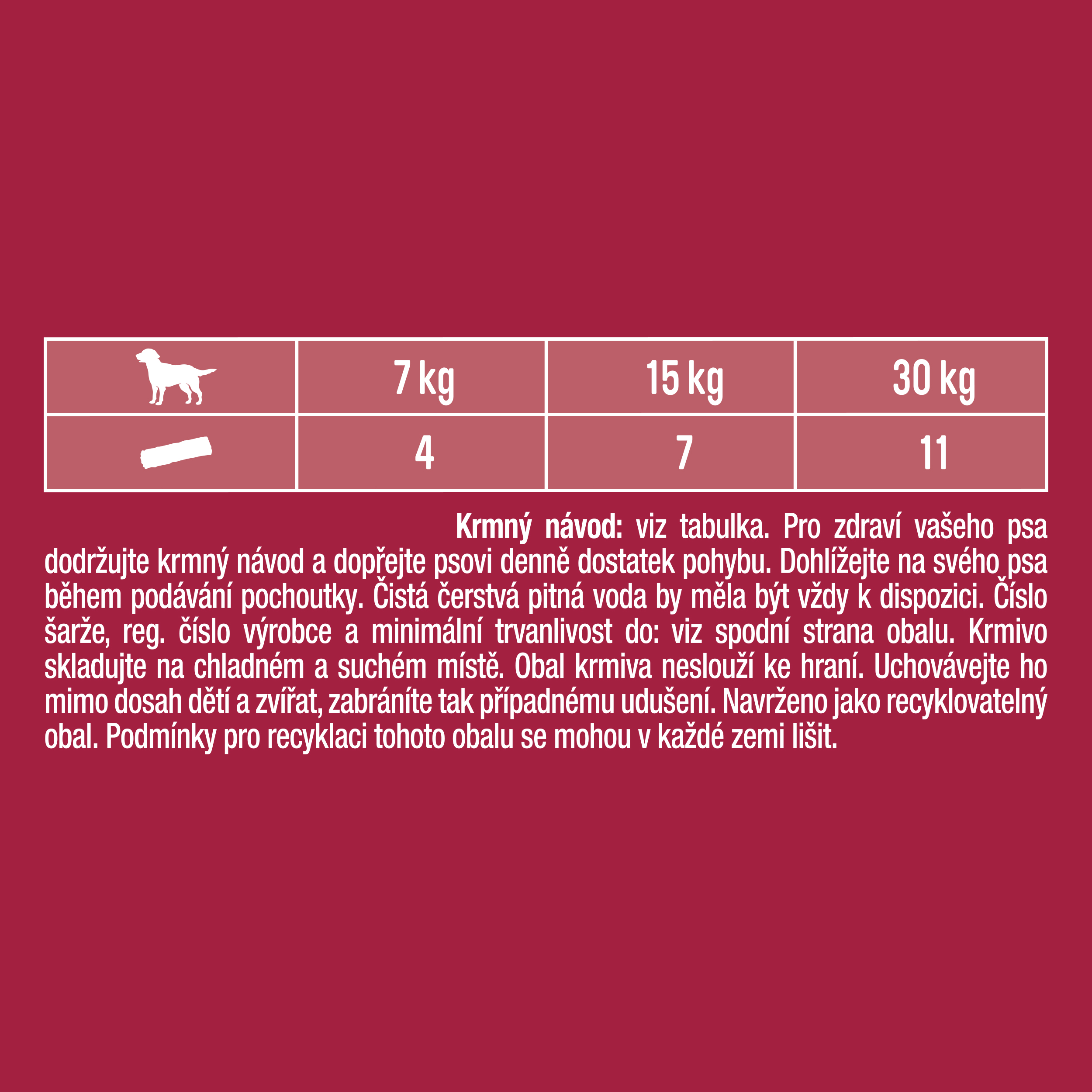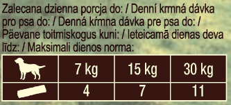 Krmný návod: Denní krmné dávky pro psa s hmotností do: 7 kg: 4 ks za den, 15 kg: 7 ks za den, 30 kg: 11 ks za den