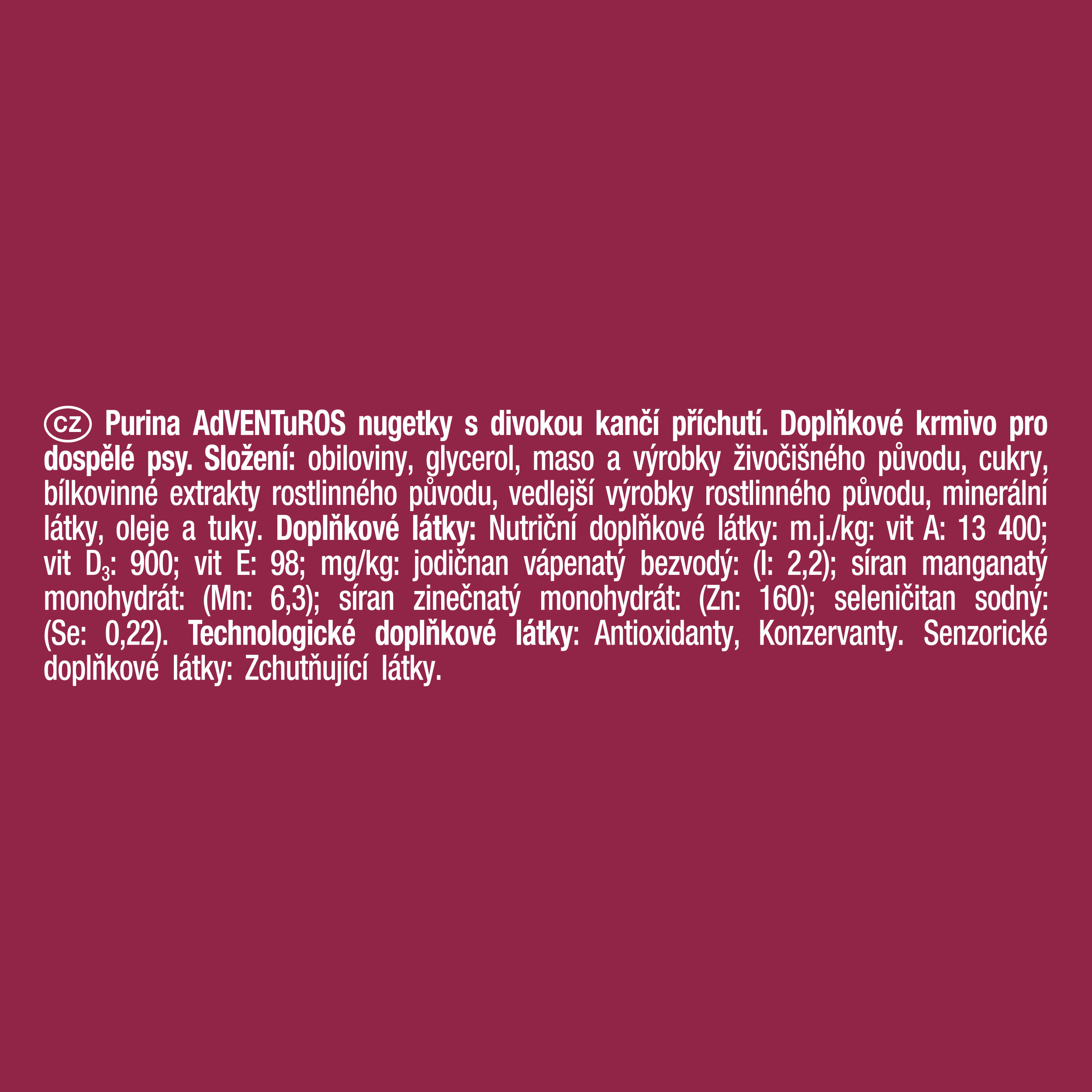 Doplňkové látky: Nutriční doplňkové látky: m.j./kg: vit A: 13400; vit D3: 900; vit E: 98; mg/kg: jodičnan vápenatý bezvodý: (I: 2,2); síran manganatý monohydrát: (Mn: 6,3); síran zinečnatý monohydrát: (Zn: 160); seleničitan sodný: (Se:0,22). Technologické doplňkové látky: Antioxidanty; Konzervanty. Senzorické doplňkové látky: Zchutňující látky. .