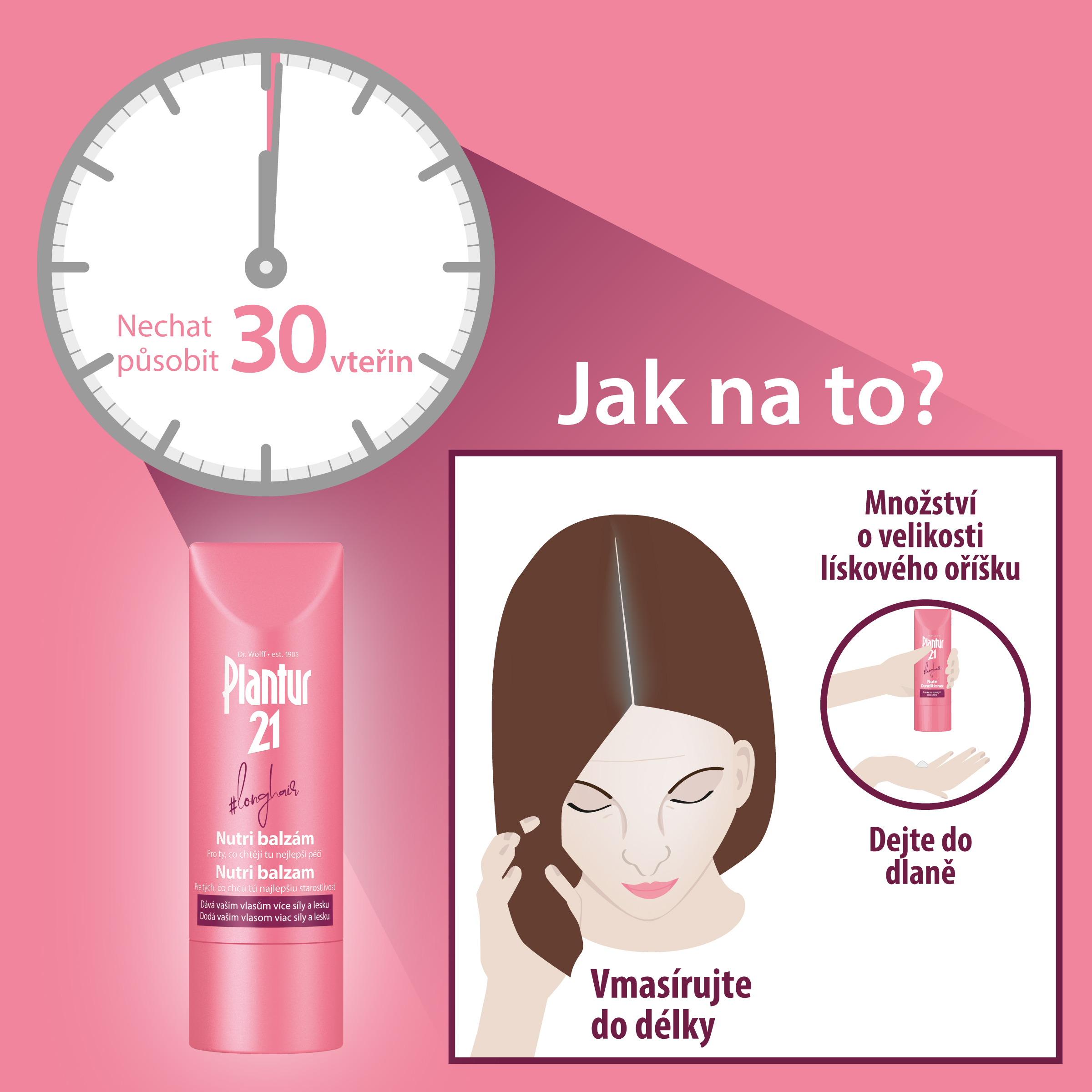 Po umytí naneste do vlhkých vlasů množství balzámu o velikosti 1-2 lískových oříšků podle délky vlasů a po 30 vteřinách opláchněte.