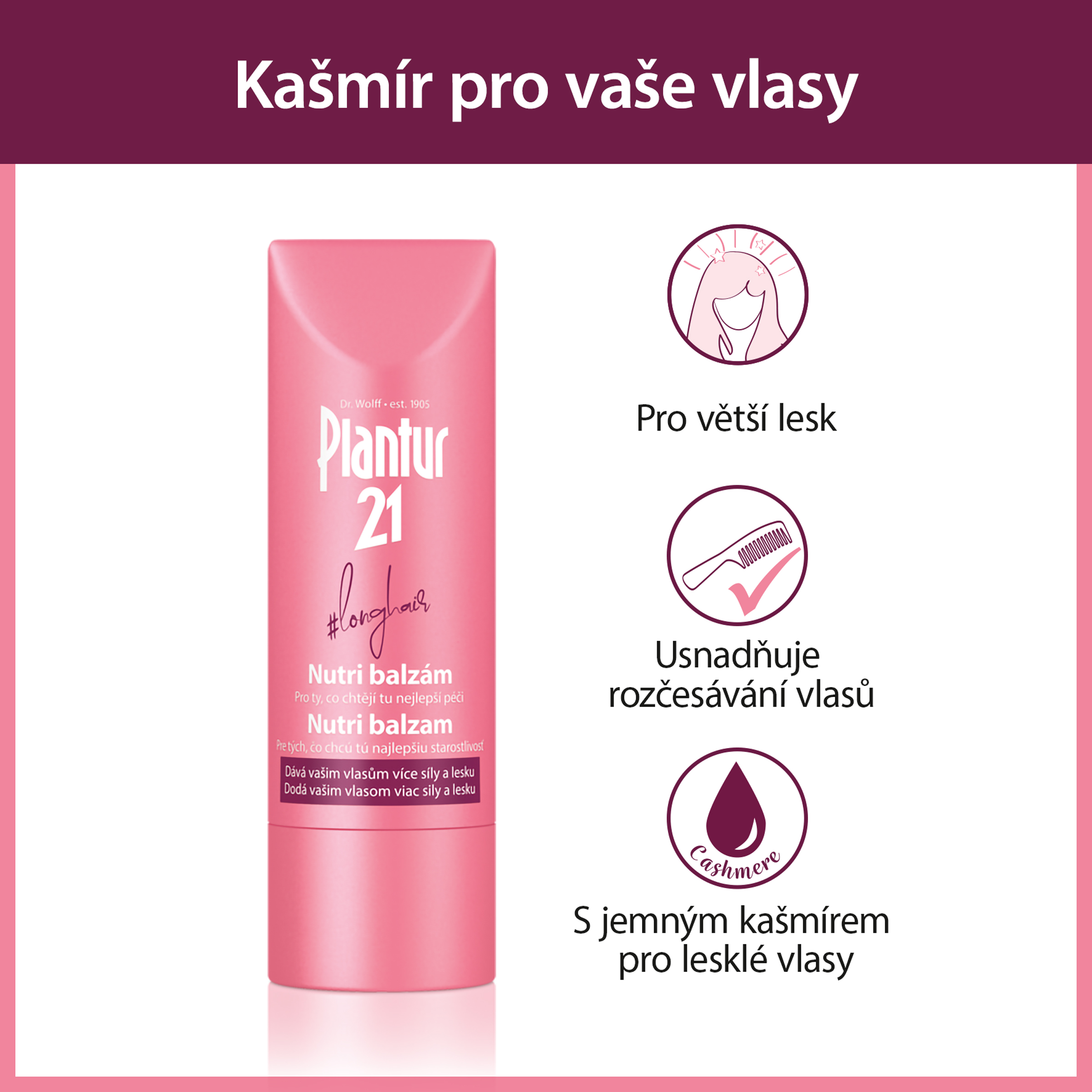 K dosažení vašich vysněných vlasů stojí v cestě stres a zátěž způsobená stylingem a barvením. Balzám Plantur 21 #longhair bez silikonů poskytuje vlasům více lesku a zářivosti - aniž by je zatěžoval - a usnadňuje rozčesávání. Běžné regenerační přípravky vlasy ošetřují, ale také mohou oslabit ochrannou bariéru vytvořenou šamponem Plantur 21 #longhair. Tento balzám je speciálně sladěný s účinným systémem Plantur 21 a navíc chrání vlasovou pokožku před vymytím hodnotných účinných látek vstřebaných z Plantur 21 #longhair šamponu.