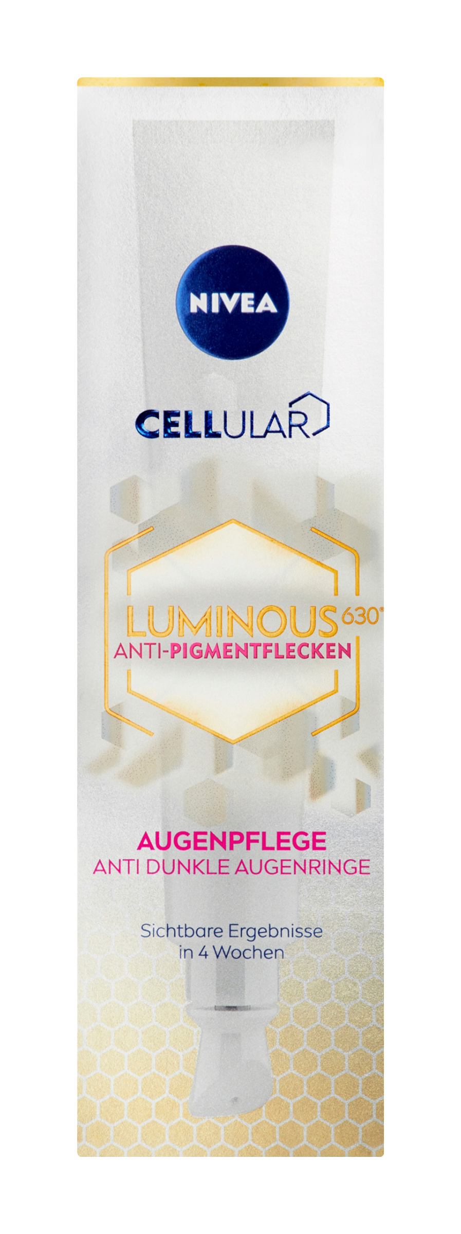 První oční péče Nivea®, která účinně ošetřuje 3 hlavní příčiny tmavých kruhů. Složení s: Luminous630®: Vyrovnává nerovnosti pigmentace a zesvětluje tmavé kruhy. Energizující kofein: Redukuje váčky pod očima. Kyselina hyaluronová: Hydratuje pleť a redukuje jemné linky a vrásky kolem očí. Pro rozzářené a mladě vypadající kontury očí. Viditelné výsledky za 4 týdny. Prokázané výsledky po 8 týdnech*: Intenzita tmavých kruhů pod očima je redukována o 40 %. Oční okolí je rozzářenější o 75 %. *12týdení studie se 41 ženami, 2020-2021.