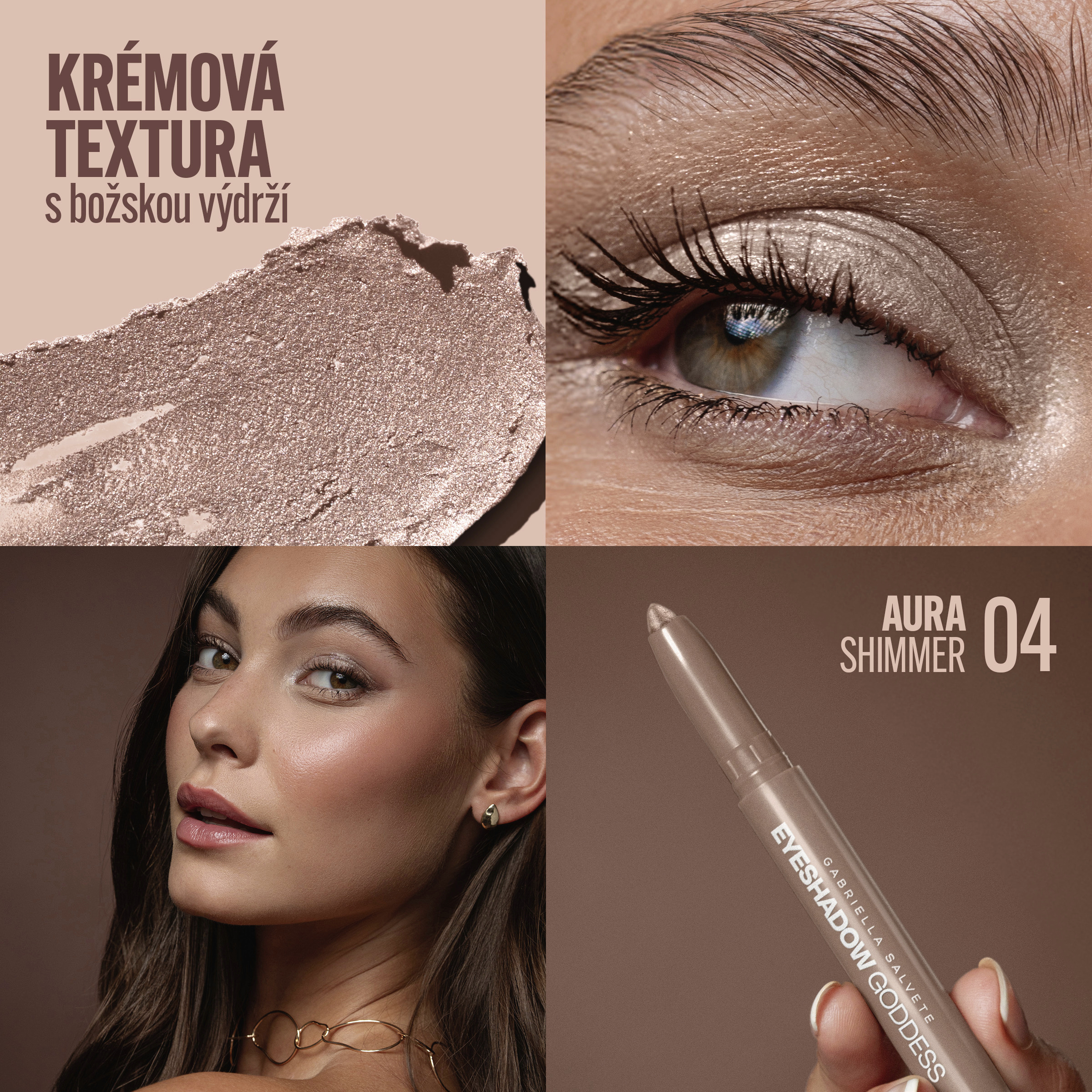 Božský pohled v jediném tahu. Krémové stíny v tužce Eyeshadow Goddess od Gabrielly Salvete dodají vašemu pohledu hloubku, intenzitu i výraz bohyně – a to klidně i bez použití štětce. Textura je krémová, pigmentace božsky výrazná a výdrž? Stíny vydrží na svém místě celý den bez rozmazání. Navíc s vitamínem E pro maximální komfort a extra péči.