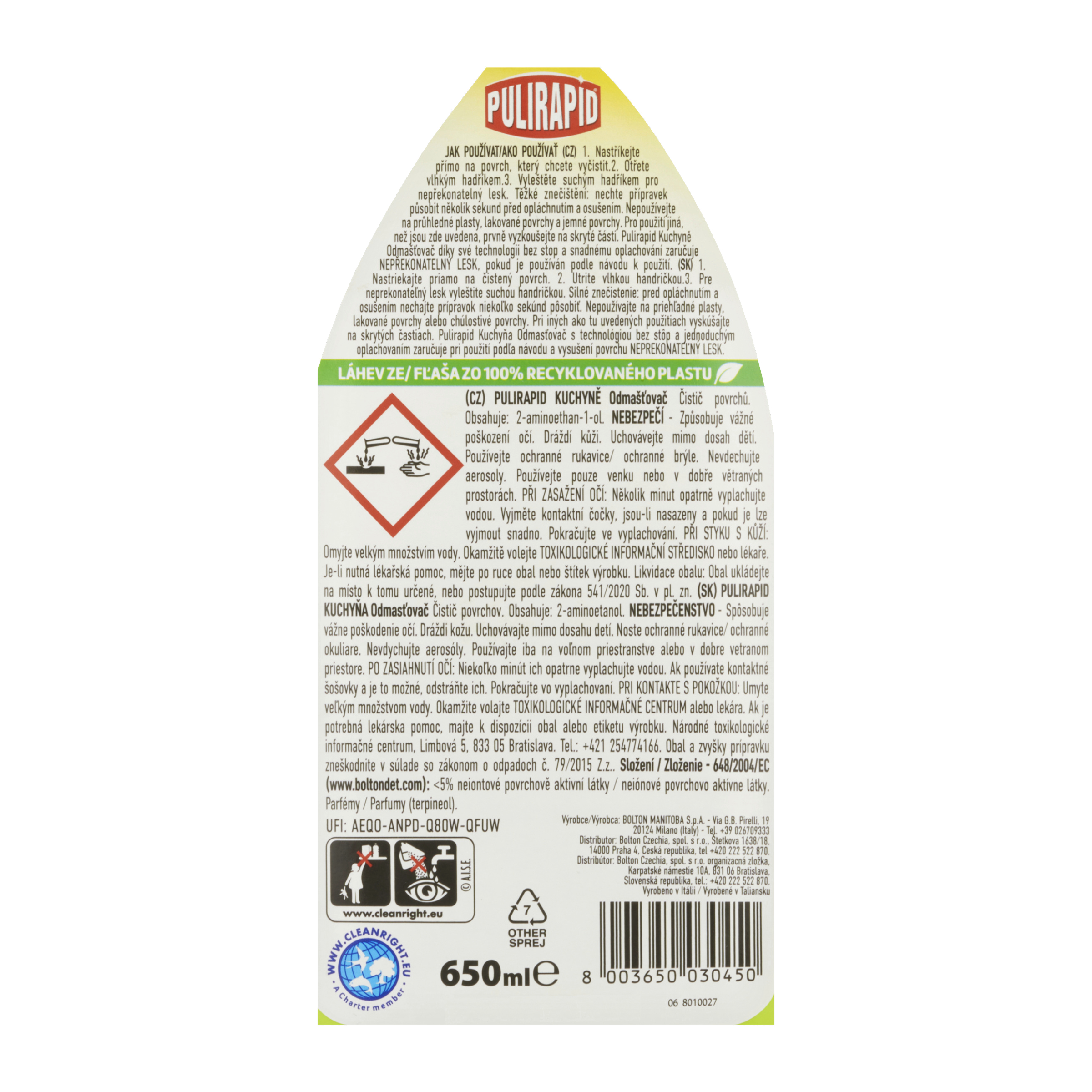 PULIRAPID KUCHYNĚ Odmašťovač Čistič povrchů. Obsahuje: 2-aminoethan-1-ol. NEBEZPEČÍ - Způsobuje vážné poškození očí. Dráždí kůži. Uchovávejte mimo dosah dětí. Používejte ochranné rukavice/ ochranné brýle. Nevdechujte aerosoly. Používejte pouze venku nebo v dobře větraných prostorách. PŘI ZASAŽENÍ OČÍ: Několik minut opatrně vyplachujte vodou. Vyjměte kontaktní čočky, jsou-li nasazeny a pokud je lze vyjmout snadno. Pokračujte ve vyplachování. PŘI STYKU S KŮŽÍ: Omyjte velkým množstvím vody. Okamžitě volejte TOXIKOLOGICKÉ INFORMAČNÍ STŘEDISKO nebo lékaře. Je-li nutná lékařská pomoc, mějte po ruce obal nebo štítek výrobku. Uchovávejte mimo dosah dětí.