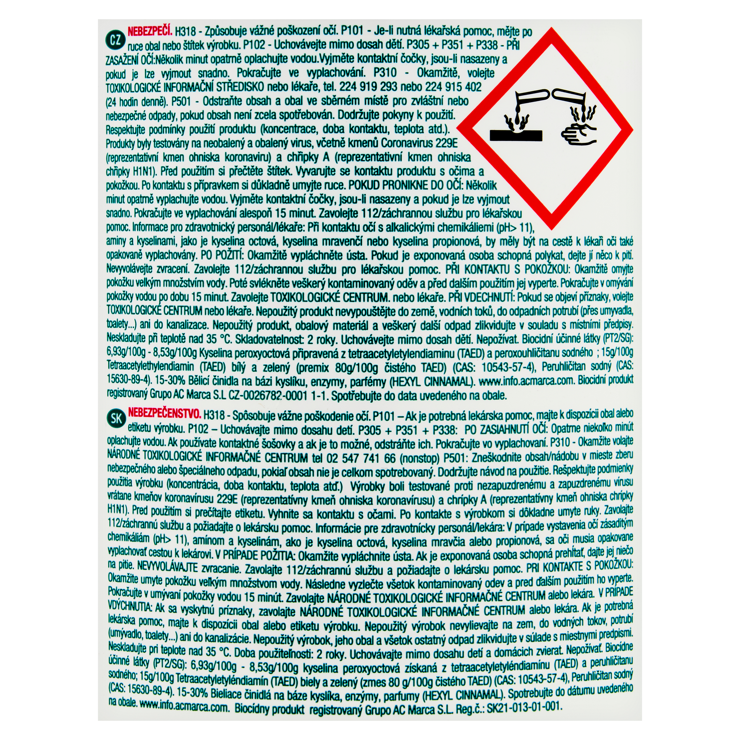 H318 - Způsobuje vážné poškození očí. P101 - Je-li nutná lékařská pomoc, mějte po ruce obal nebo štítek výrobku. P102 - Uchovávejte mimo dosah dětí. P305+P351+P338 - PŘI ZASAŽENÍ OČÍ: Několik minut opatrně oplachujte vodou. Vyjměte kontaktní čočky, jsou-li nasazeny a pokud je lze vyjmout snadno. Pokračujte ve vyplachování. P310 - Okamžitě, volejte TOXIKOLOGICKÉ INFORMAČNÍ STŘEDISKO nebo lékaře, tel. 224 919 293 nebo 224 915 402 (24 hodin denně). Dodržujte pokyny k použití. Respektujte podmínky použití produktu (koncentrace, doba kontaktu, teplota atd.). Produkty byly testovány na neobalený a obalený virus, včetně kmenů Coronavirus 229E (reprezentativní kmen ohniska koronaviru) a chřipky A (reprezentativní kmen ohniska chřipky H1N1). Před použitím si přečtěte štítek. Vyvarujte se kontaktu produktu s očima a pokožkou. Po kontaktu s přípravkem si důkladně umyjte ruce. POKUD PRONIKNE DO OČÍ: Několik minut opatrně vyplachujte vodou. Vyjměte kontaktní čočky, jsou-li nasazeny a pokud je lze vyjmout snadno. Pokračujte ve vyplachování alespoň 15 minut. Zavolejte 112/záchrannou službu pro lékařskou pomoc. Informace pro zdravotnický personál/lékaře: Při kontaktu očí s alkalickými chemikáliemi (pH> 11), aminy a kyselinami, jako je kyselina octová, kyselina mravenčí nebo kyselina propionová, by měly být na cestě k lékaři oči také opakovaně vyplachovány. PO POŽITÍ: Okamžitě vypláchněte ústa. Pokud je exponovaná osoba schopná polykat, dejte jí něco k pití. Nevyvolávejte zvracení. Zavolejte 112/záchrannou službu pro lékařskou pomoc. PŘI KONTAKTU S POKOŽKOU: Okamžitě omyjte pokožku velkým množstvím vody. Poté svlékněte veškerý kontaminovaný oděv a před dalším použitím jej vyperte. Pokračujte v omývání pokožky vodou po dobu 15 minut. Zavolejte TOXIKOLOGICKÉ CENTRUM. nebo lékaře. PŘI VDECHNUTÍ: Pokud se objeví příznaky, volejte TOXIKOLOGICKÉ CENTRUM nebo lékaře. Nepoužitý produkt nevypouštějte do země, vodních toků, do odpadních potrubí (přes umyvadla, toalety..) ani do kanalizace. Neskladujte při teplotě nad 35 °C. Skladovatelnost: 2 roky. Uchovávejte mimo dosah dětí. Nepožívat. Biocidní účinné látky (PT2/SG): 6,93g/100g-8,53g/100g Kyselina peroxyoctová připravená z tetraacetyletylendiaminu (TAED) a peroxouhličitanu sodného; 15g/100g Tetraacetylethylendiamin (TAED) bílý a zelený (premix 80g/100g čistého TAED) (CAS: 10543-57-4), Peruhličitan sodný (CAS: 15630-89-4).