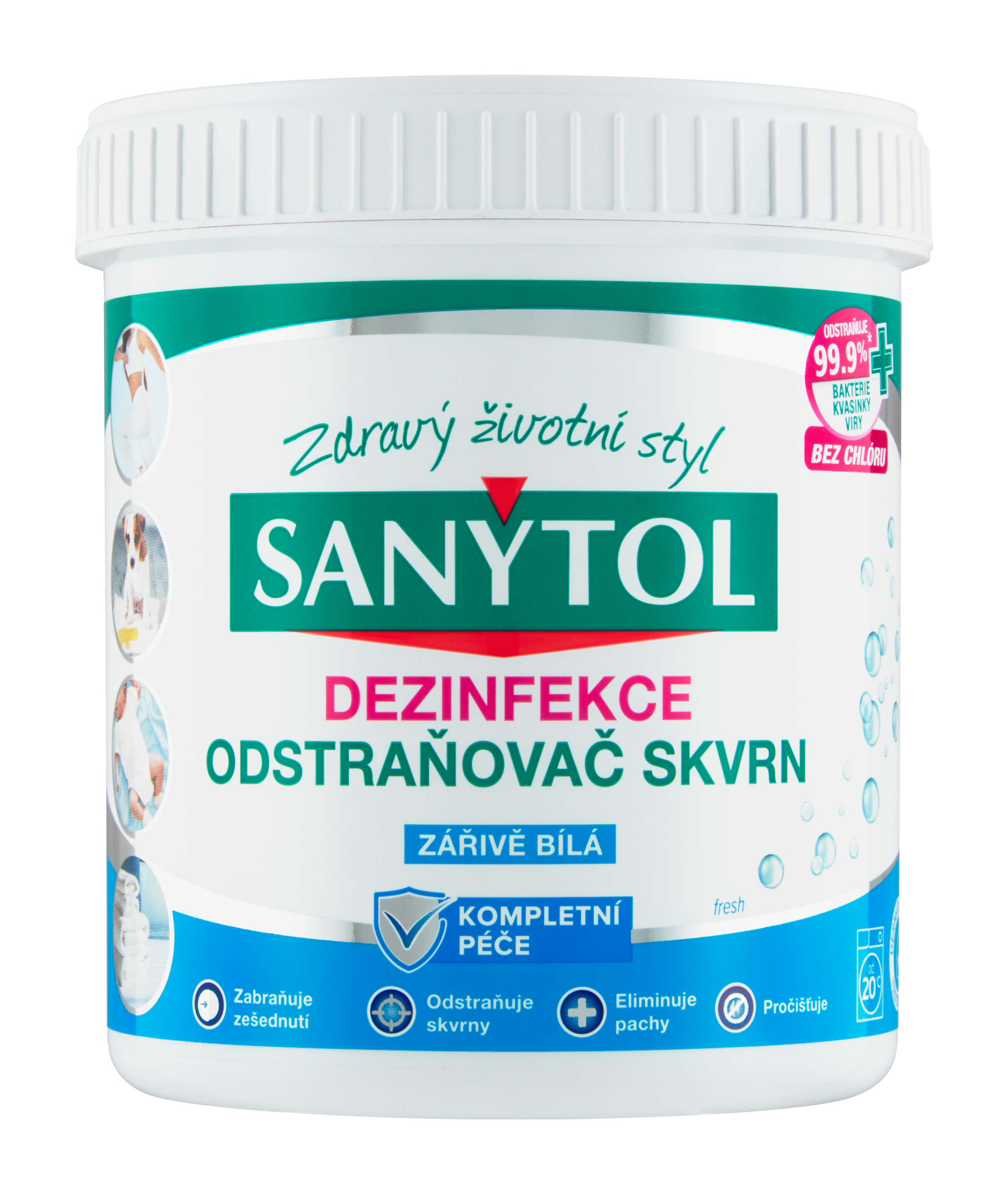 Sanytol dezinfekční odstraňovač skvrn ničí 99,9% bakterií, virů a kvasinek a účinně odstraňuje vytrvalé skvrny již od prací teploty 20°C. Díky složení bohatému na enzymy prostupuje do vnitřku textilních vláken a uvolňuje činidla odstraňující skvrny, čímž dosahuje dokonalých výsledků jak u bílého, tak i u barevného prádla. Odstraňuje 99.9%* bakterie, kvasinky, viry.
