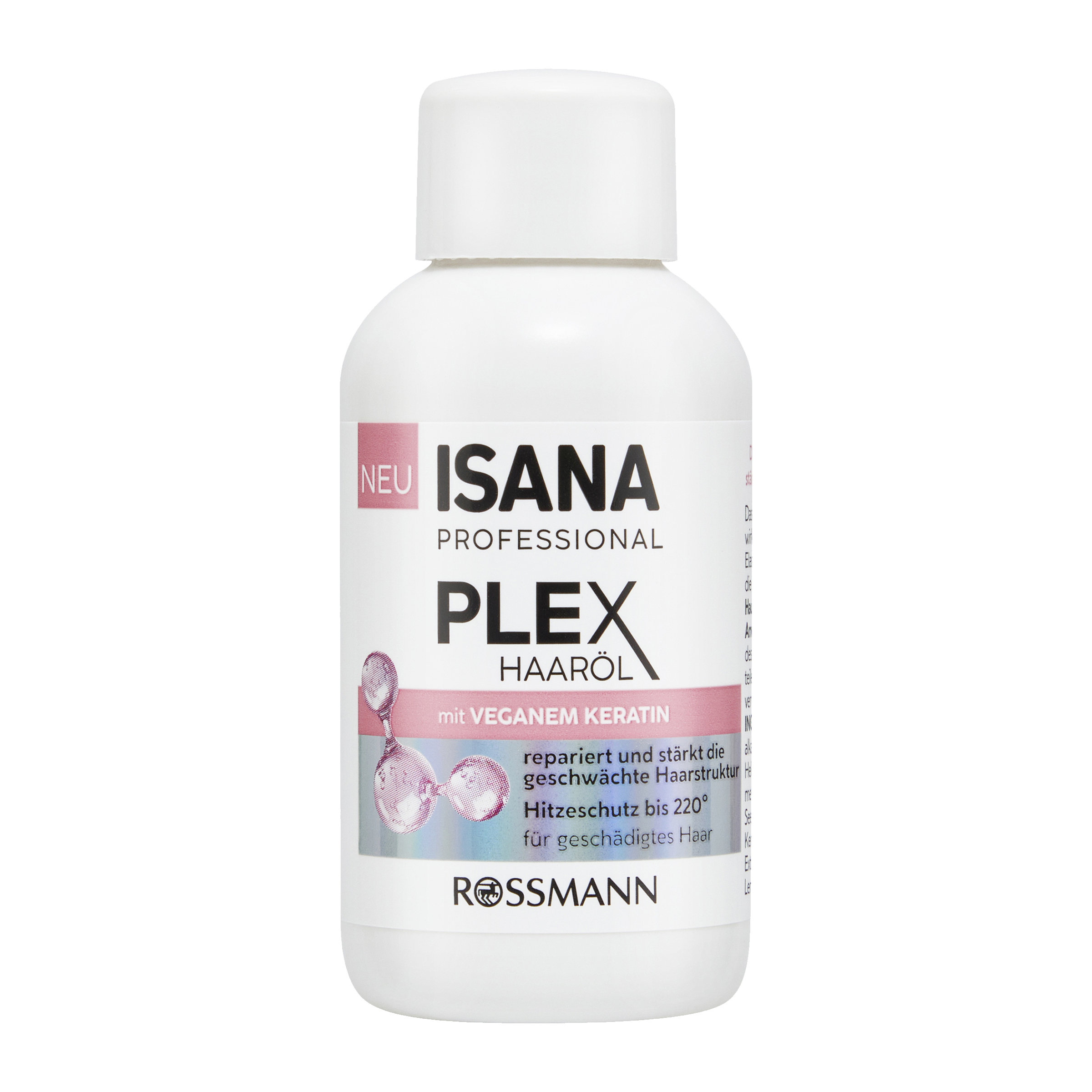 Olej na vlasy Isana Professional Plex má regenerační a uzavírací účinek, vyživuje a hydratuje vlasy, chrání před lámáním a dodává jim zdravý lesk. Díky veganskému keratinu vlasy opravuje a posiluje jejich oslabenou strukturu. Tepelná ochrana až do 220 °C chrání vlasy před poškozením při fénování, žehlení a jiných tepelných úpravách.