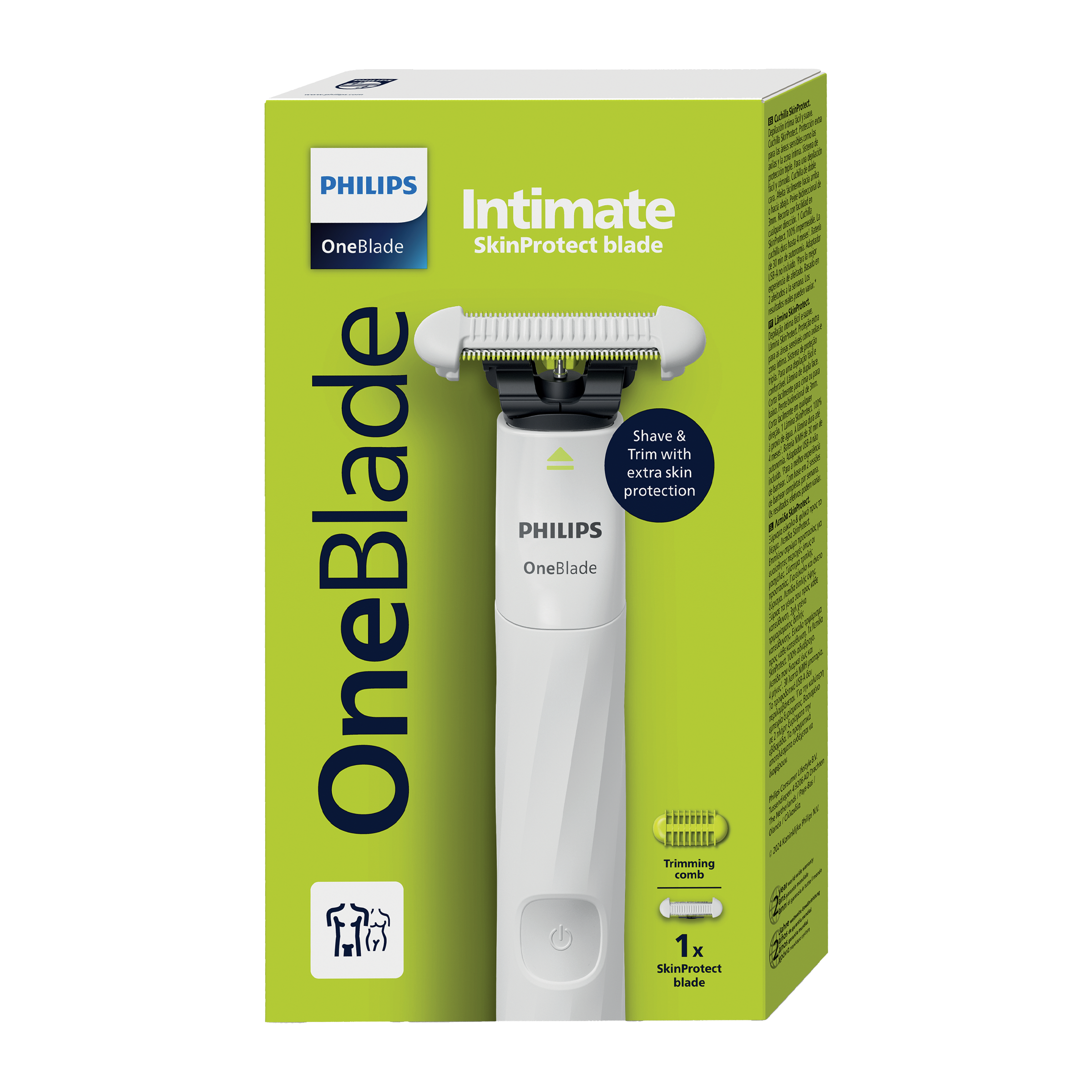 Philips OneBlade Intimate. Pro intimní partie, pro muže. Chrání vaše intimní partie bez ohledu na to, zda se holíte, nebo zastřihujete. Břit SkinProtect poskytuje dodatečnou ochranu vašich citlivých oblastí, jako jsou podpaží a intimní partie. Obousměrný zastřihovací hřeben (3 mm) zastřihává v jakémkoliv směru a umožňuje snadnou a rychlou úpravu chloupků i na větších oblastech těla.