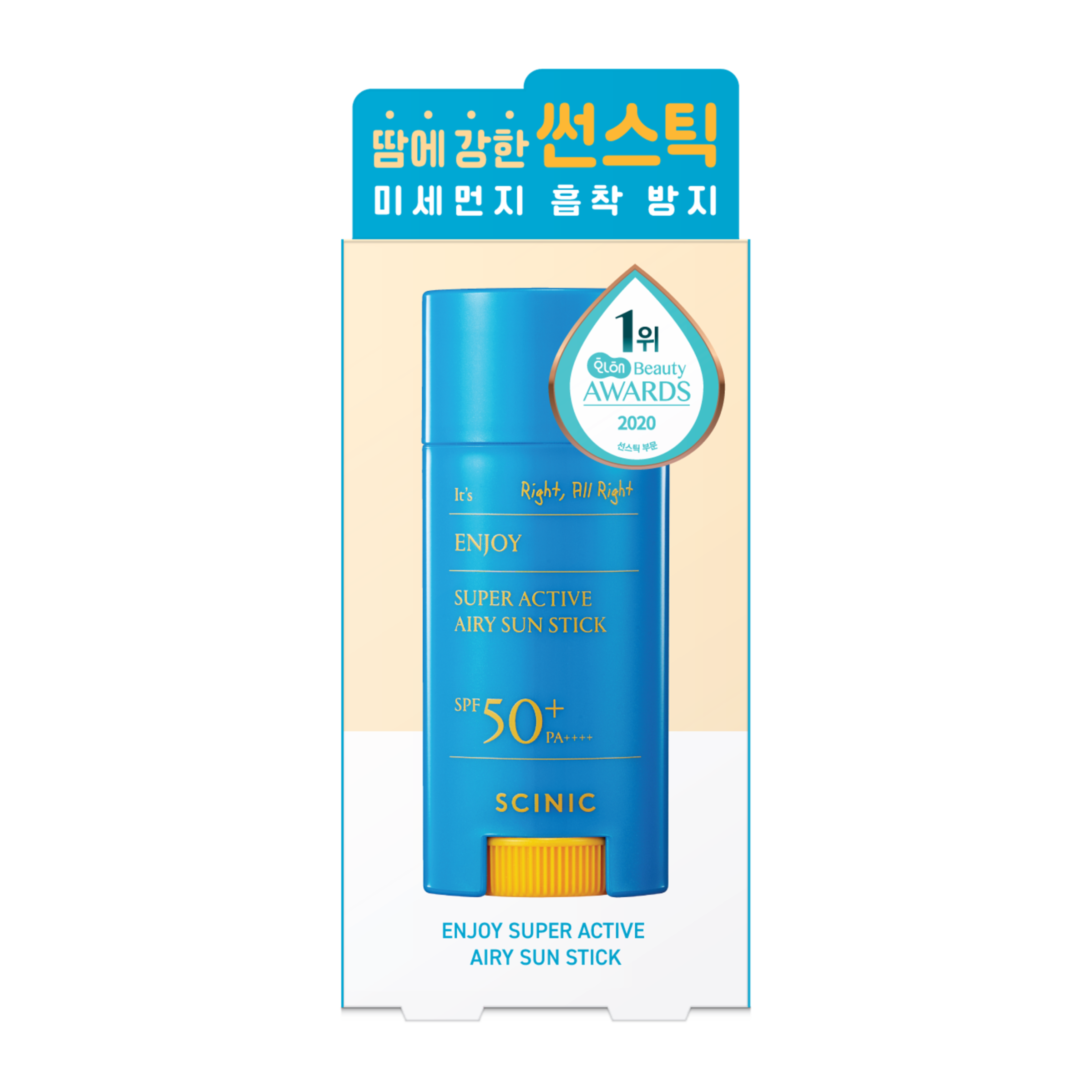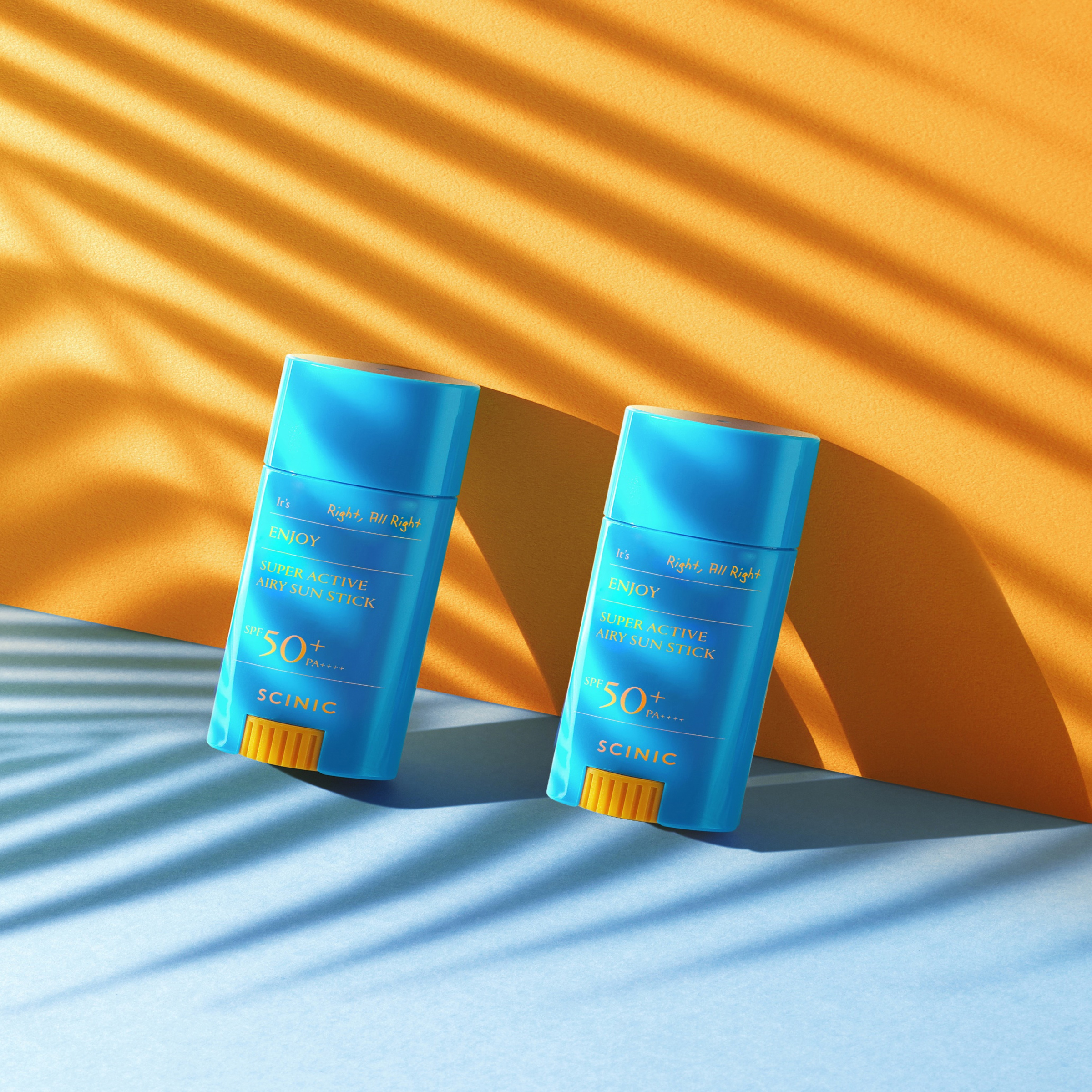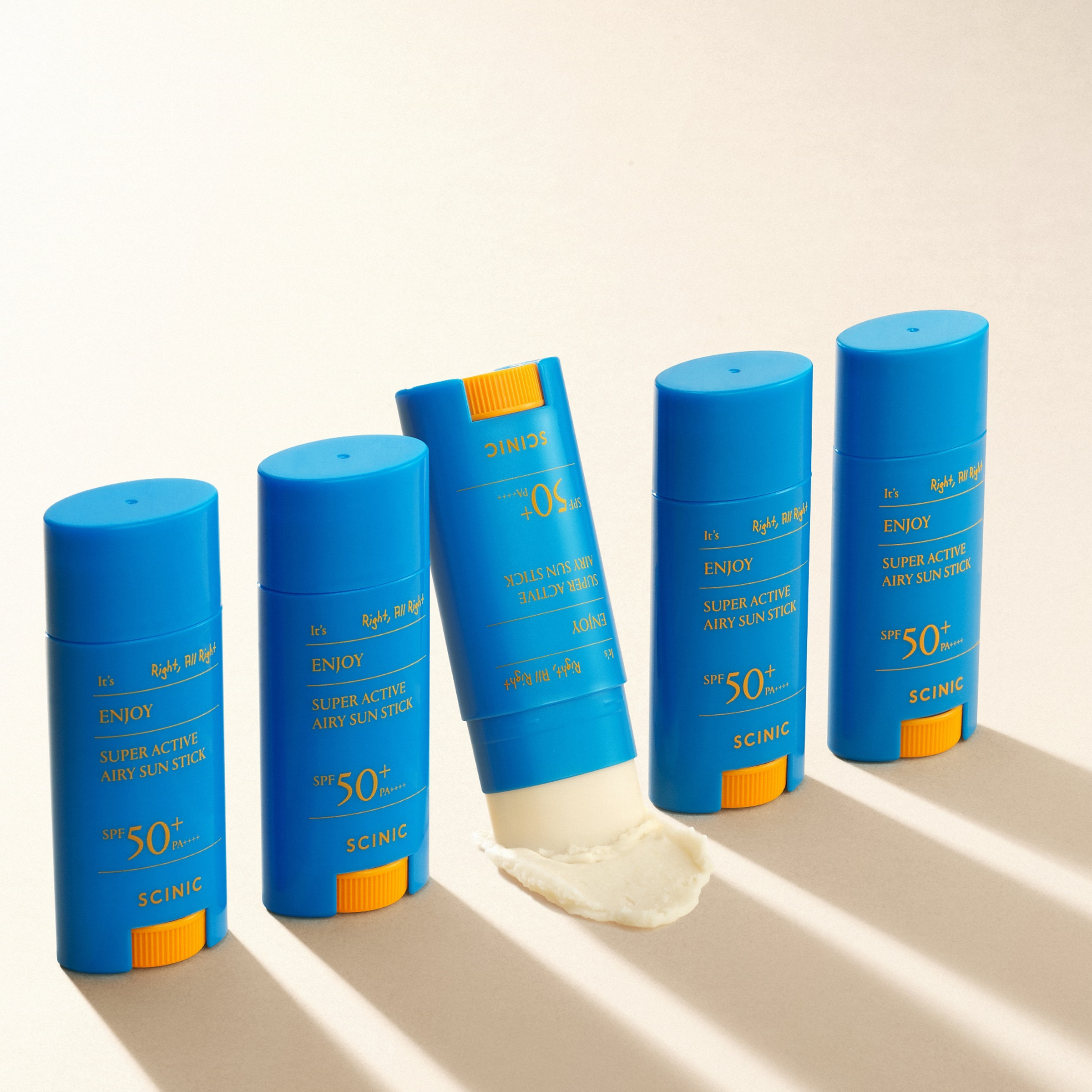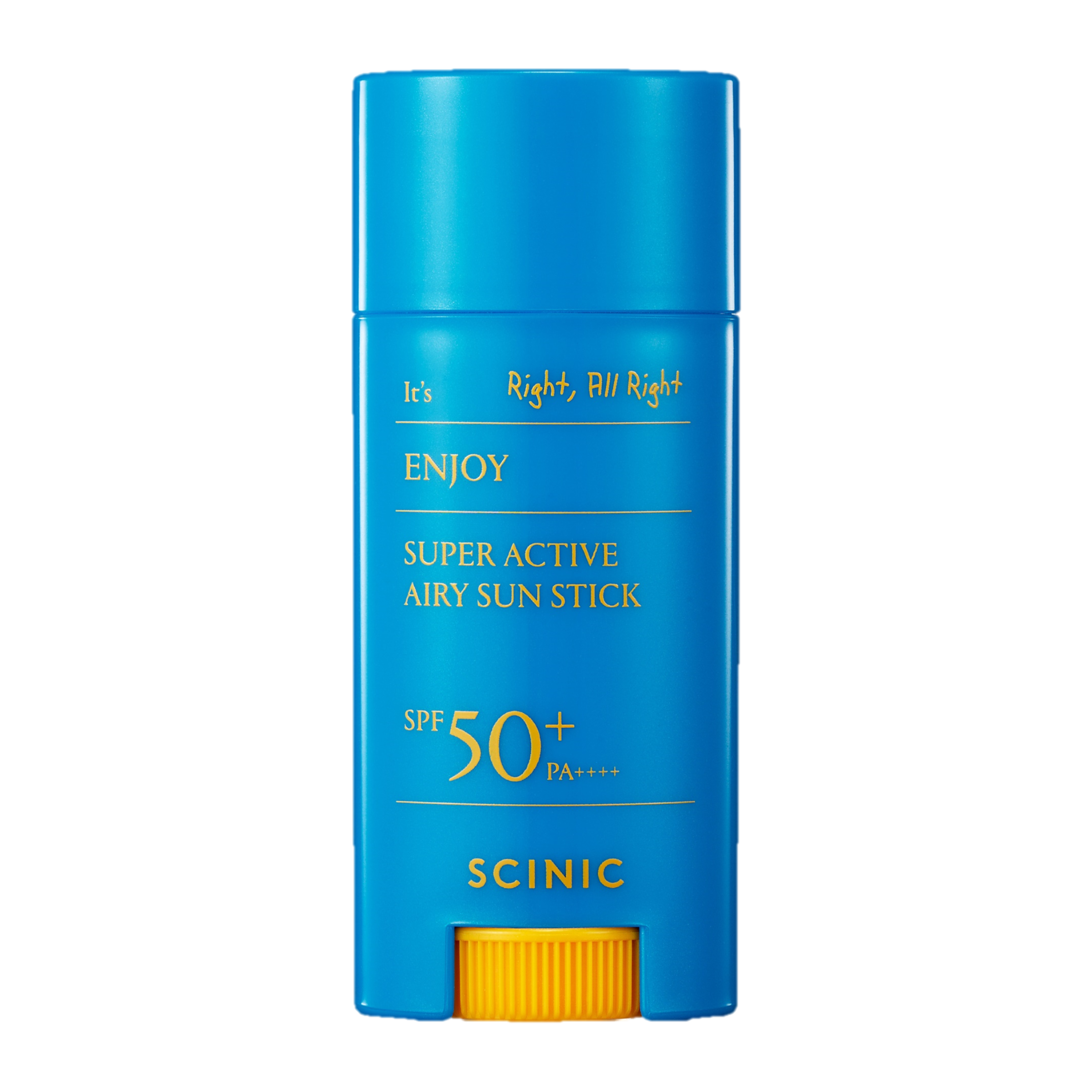 Průhledná tyčinka Scinic Enjoy Super Active SPF50+ na opalování pro svěží, matný vzhled pleti. S obsahem výtažků z bylin a bavlníkovým olejem.