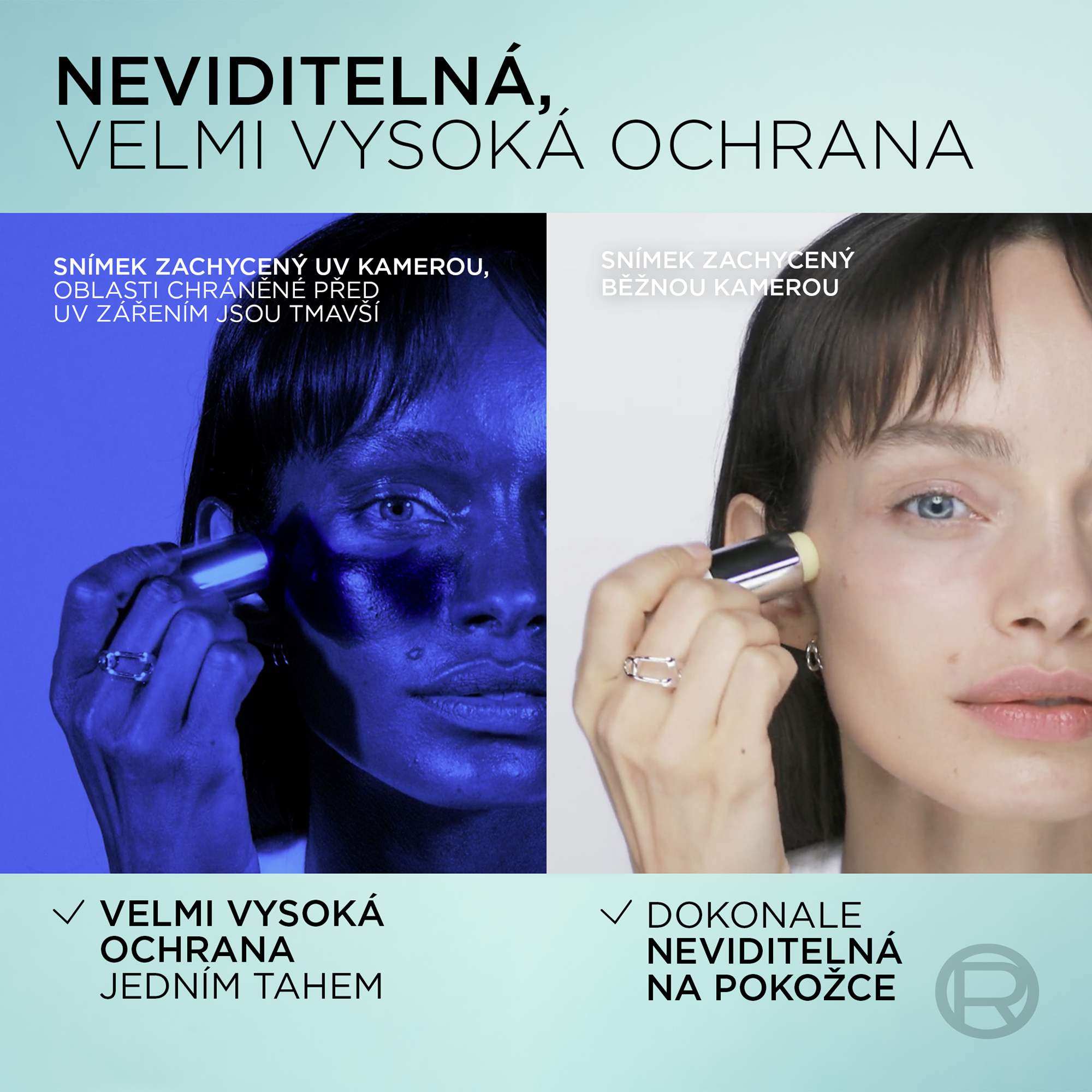 Tyčinka s UV filtrem zajišťuje velmi vysokou ochranu proti UVB a UVA záření. Pomáhá předcházet vzniku tmavých skvrn a známkám stárnutí. S neviditelným finišem na každém odstínu pleti. Pleť zároveň hydratuje. Tyčinka je vhodná také na citlivá a suchá místa pokožky (oční kontury, rty). Aplikovat můžete před i po nanesení make-upu.