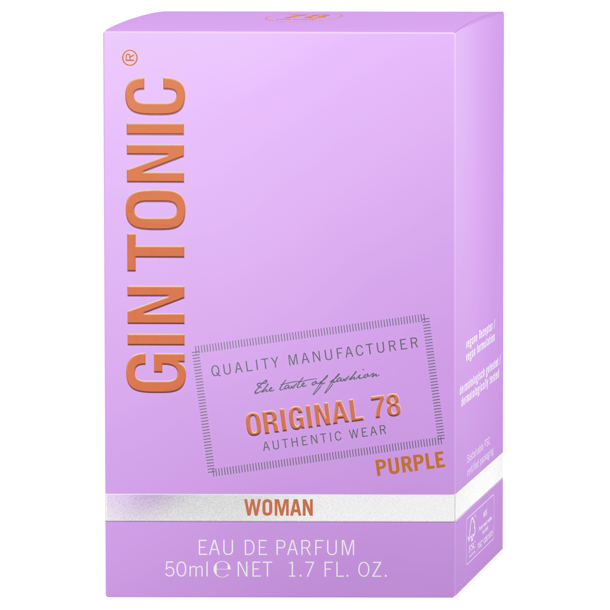Vůně GIN TONIC® Original 78 ztělesňují dokonalou rovnováhu mezi moderním a klasickým stylem. Jsou energické a vyzařují pozitivní náladu. GIN TONIC® Original 78 Purple je květinově pižmová vůně pro ženy. Na přitažlivé spojení hrušky a kadidla v úvodu navazuje opojná směs jasmínu a šťavnaté broskve. Sametový závěr s pižmem, dřevitými tóny a sladkou vanilkou zanechává dlouhotrvající vonnou stopu.