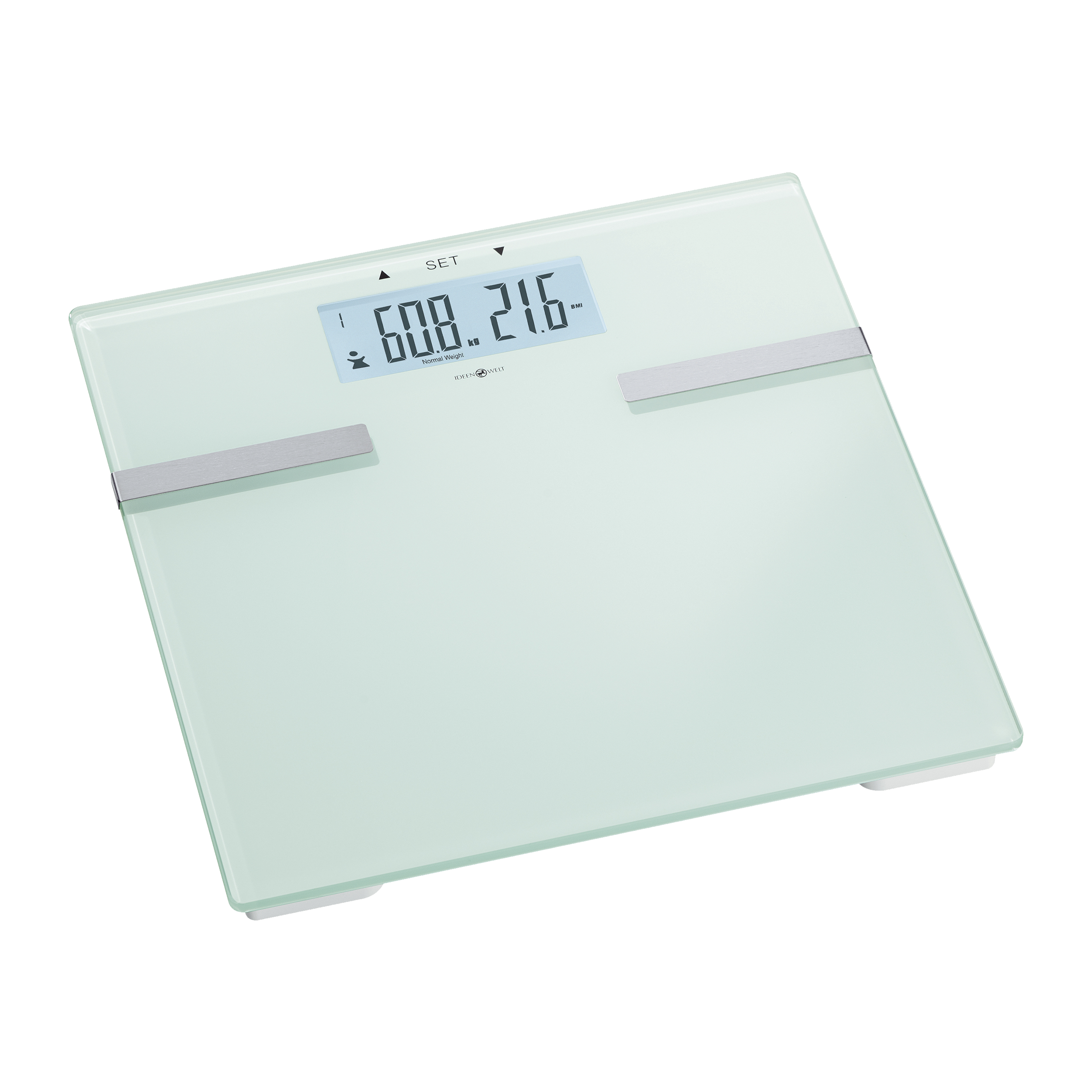 Osobní digitální váha v moderním skleněném designu, s čidly pro měření vody a tuku v těle.