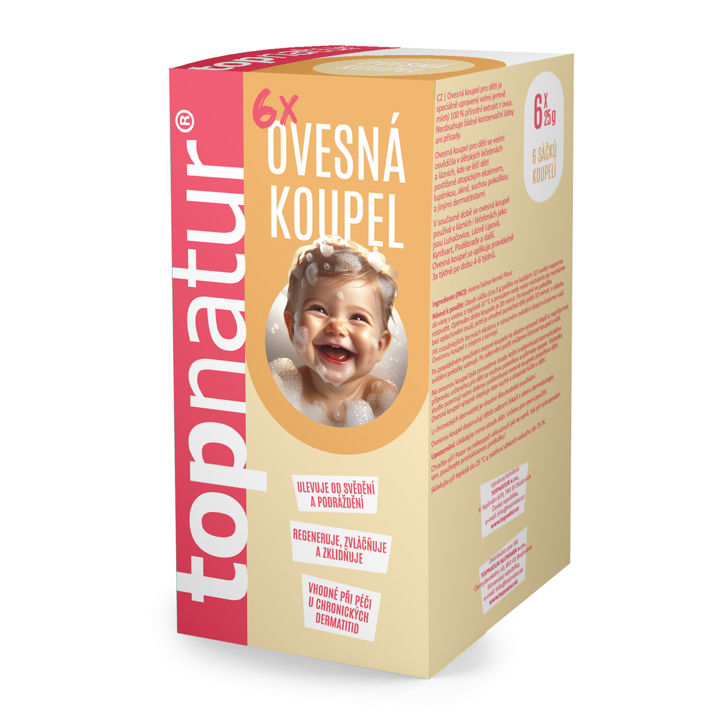 Ovesná koupel pro děti je speciální technologií upravený velmi jemně mletý 100% přírodní extrakt z ovsa. Neobsahuje žádné konzervační látky, přísady a díky tomu je vhodná i pro miminka. Na ovesnou koupel pro děti byla provedena studie kožní snášenlivosti kosmetického přípravku určeného pro děti se suchou pokožkou a příznaky atopie. Výsledky studie potvrzují velmi dobrou snášenlivost ovesné koupele pokožkou dětí. Ovesná koupel pro děti výrazně zlepšuje stav suché a atopické kůže u dětí.