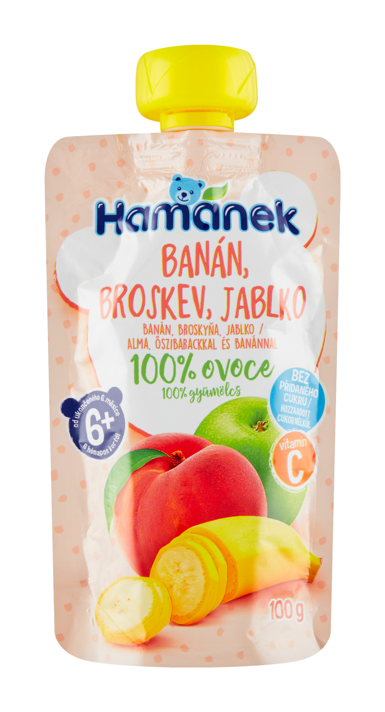 100% ovocná svačinka bez přidaného cukru Hamánek Broskev s banánem je určena pro nejmenší od ukončeného 6. měsíce. Díky praktickému balení ji můžete mít vždy po ruce. Vysoký podíl ovoce zajistí přísun potřebných vitamínů. Kapsičky Hamánek si vaše děti zamilují i v dalších pestrých chuťových variantách.