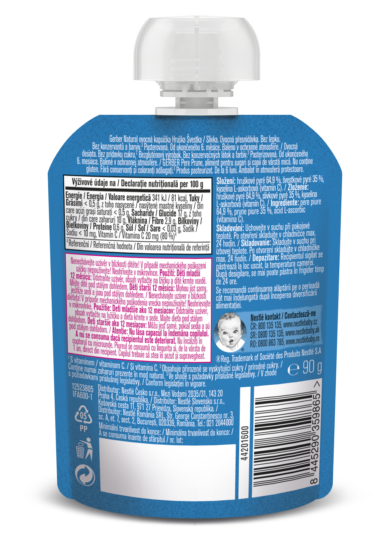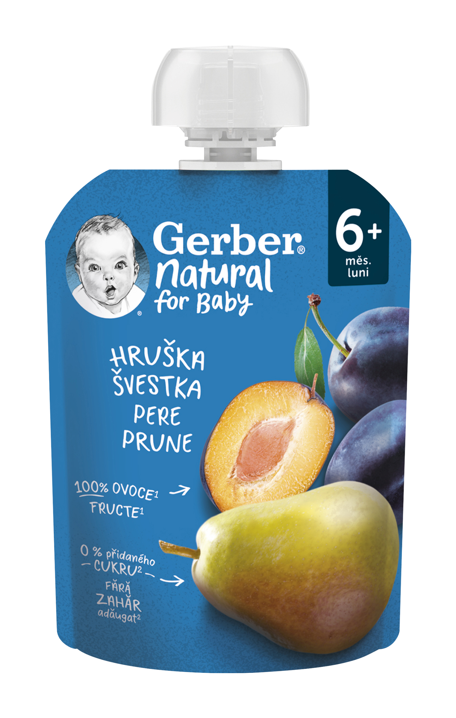 GERBER Natural kapsička hruška a švestka je ovocná přesnídávka do malé ručky, která potěší všechny mlsné jazýčky. V každé porci se nachází pečlivě vybrané ovoce: hruškové pyré 64,9 %, švestkové pyré 35 % a vitamín C.