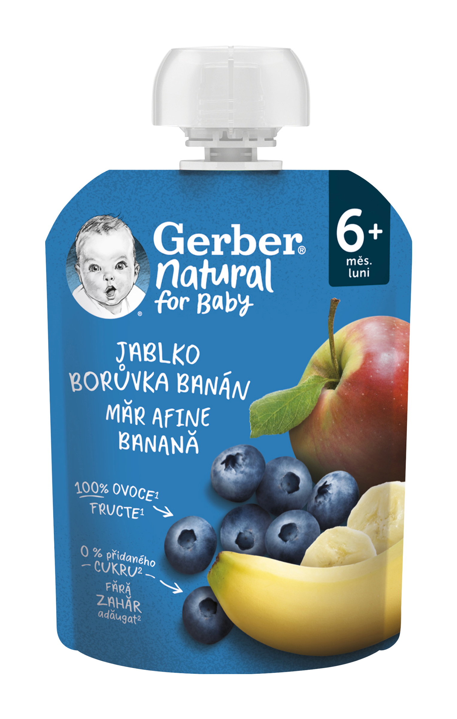 GERBER Natural kapsička jablko, borůvka a banán je ovocná přesnídávka do malé ručky, která potěší všechny mlsné jazýčky. V každé porci se nachází pečlivě vybrané ovoce: jablečné pyré 85,9 %, borůvkové pyré 9 %, banánové pyré 5 % a vitamín C.