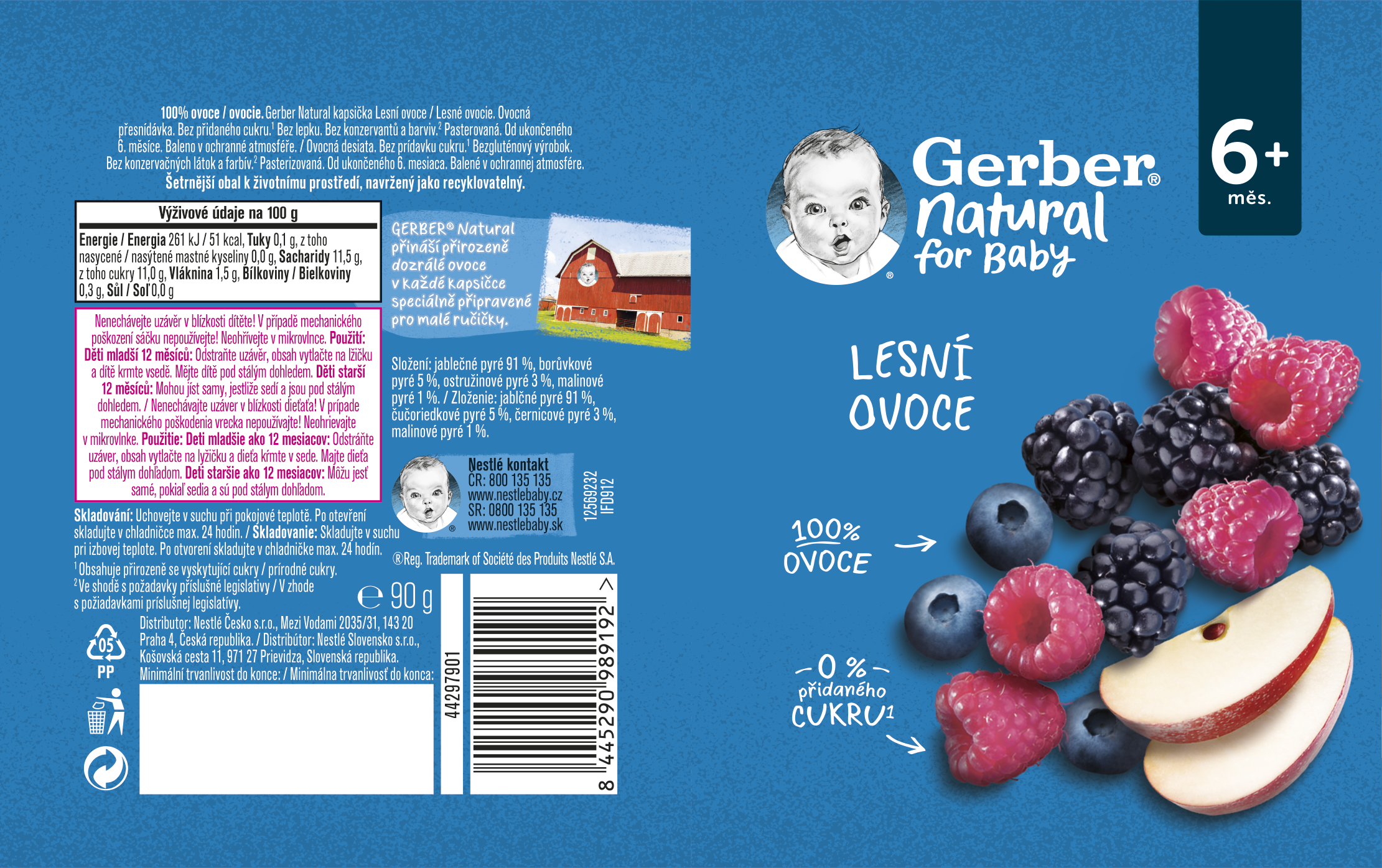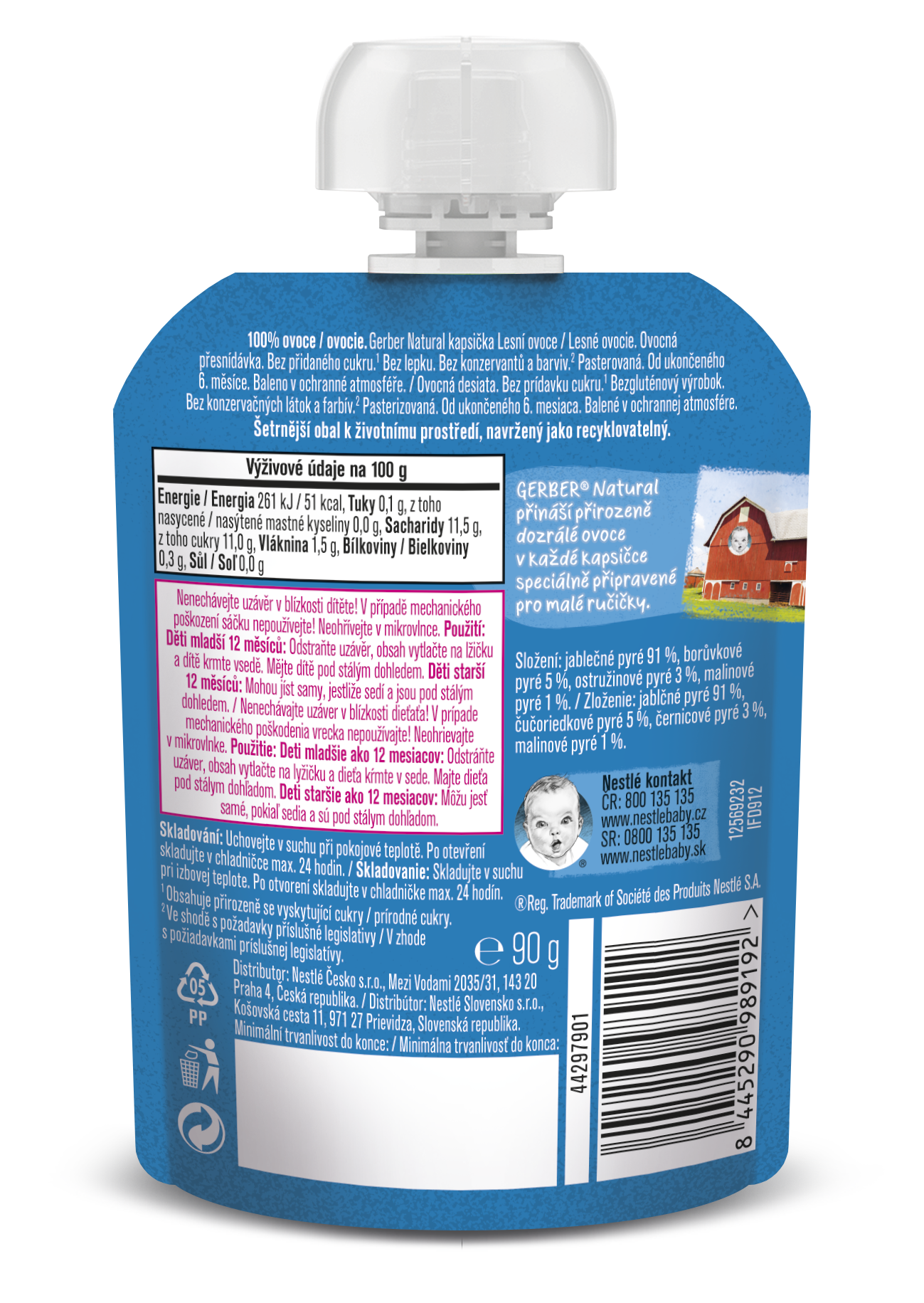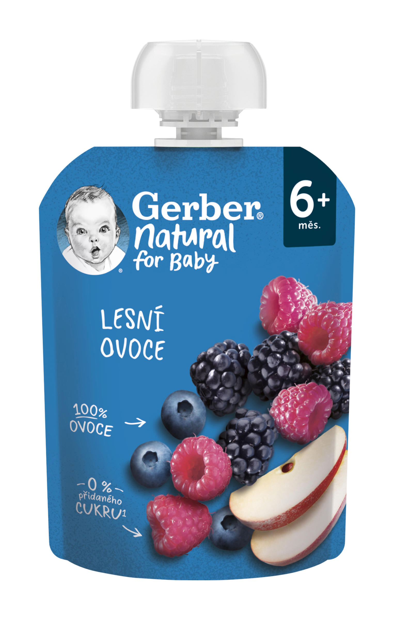 GERBER Natural kapsička lesní ovoce je ovocná přesnídávka do malých ruček, která potěší všechny mlsné jazýčky. V každé porci se nachází pečlivě vybrané ovoce: jablečné pyré 91 %, borůvkové pyré 5 %, ostružinové pyré 3 %, malinové pyré 1 %. Ovocné pyré s chutí lesního ovoce v praktickém, uzavíratelném obalu je hravou svačinkou pro děti od ukončeného 6. měsíce. Kapsička je vhodná jako svačinka nejen na doma, ale i na cesty. GERBER Natural přináší přirozeně dozrálé ovoce v každé kapsičce speciálně připravené pro malé ručičky. Abychom zajistili ovoce prvotřídní kvality, spolupracujeme s farmáři, kteří splňují normy pro bezpečnost potravin. Díky tomu si váš jedlík užije přirozenou chuť ovoce. Při výrobě jsme navíc nepřidali cukr ani aromata. Obal je navržený jako recyklovatelný a je tak šetrnější k životnímu prostředí. Obal navržený jako recyklovatelný.