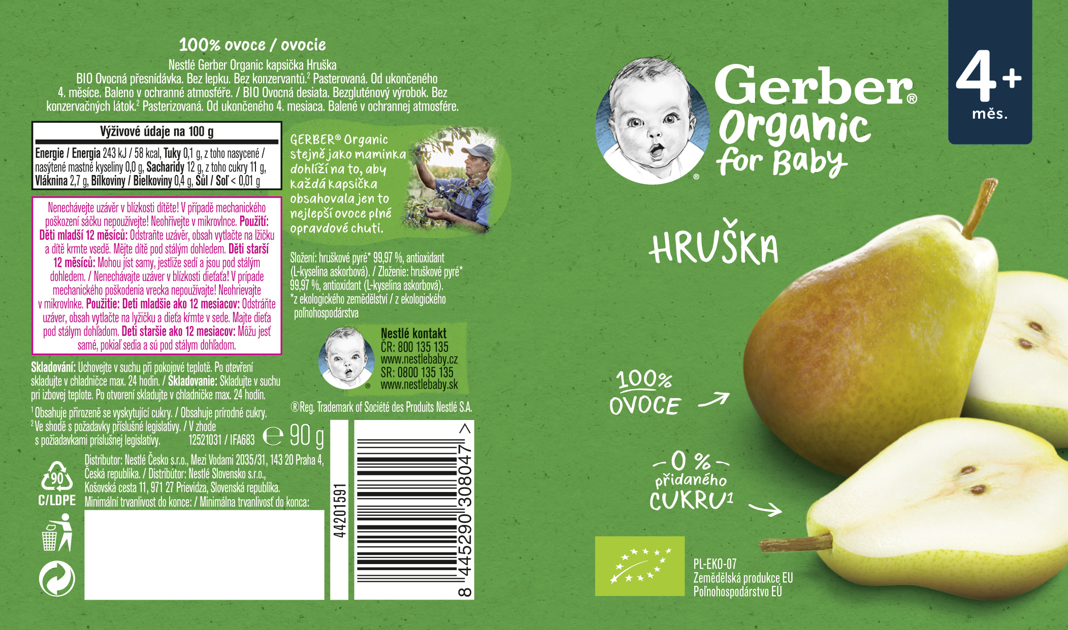 GERBER Organic kapsička hruška je vyrobená z nejkvalitnějšího ovoce. Kapsička obsahuje pyré ze zralých kousků hrušky. Váš malý jedlík má tak vynikající chuť ovoce na dosah ručičky. GERBER Organic stejně jako maminka dohlíží na to, aby každá kapsička obsahovala jen to nejlepší ovoce plné opravdové chuti. S GERBER Organic kapsičkami máte vždy po ruce chutnou svačinku plnou ovoce bez přidaných cukrů*, bez lepku, bez konzervantů** díky níž si váš malý jedlík užije přirozenou chuť ovoce. Abychom zajistili prvotřídní kvalitu pro vaše nejmenší, spolupracujeme s farmáři z certifikovaných BIO farem, kde je brán ohled na přirozený způsob pěstování a dozrávání všech plodin. 100 % ovoce z ekologického zemědělství 0 % přidaného cukru* Ovoce od BIO certifikovaných farmářů, kteří respektují přirozený řád přírody BEZ lepku BEZ konzervantů**